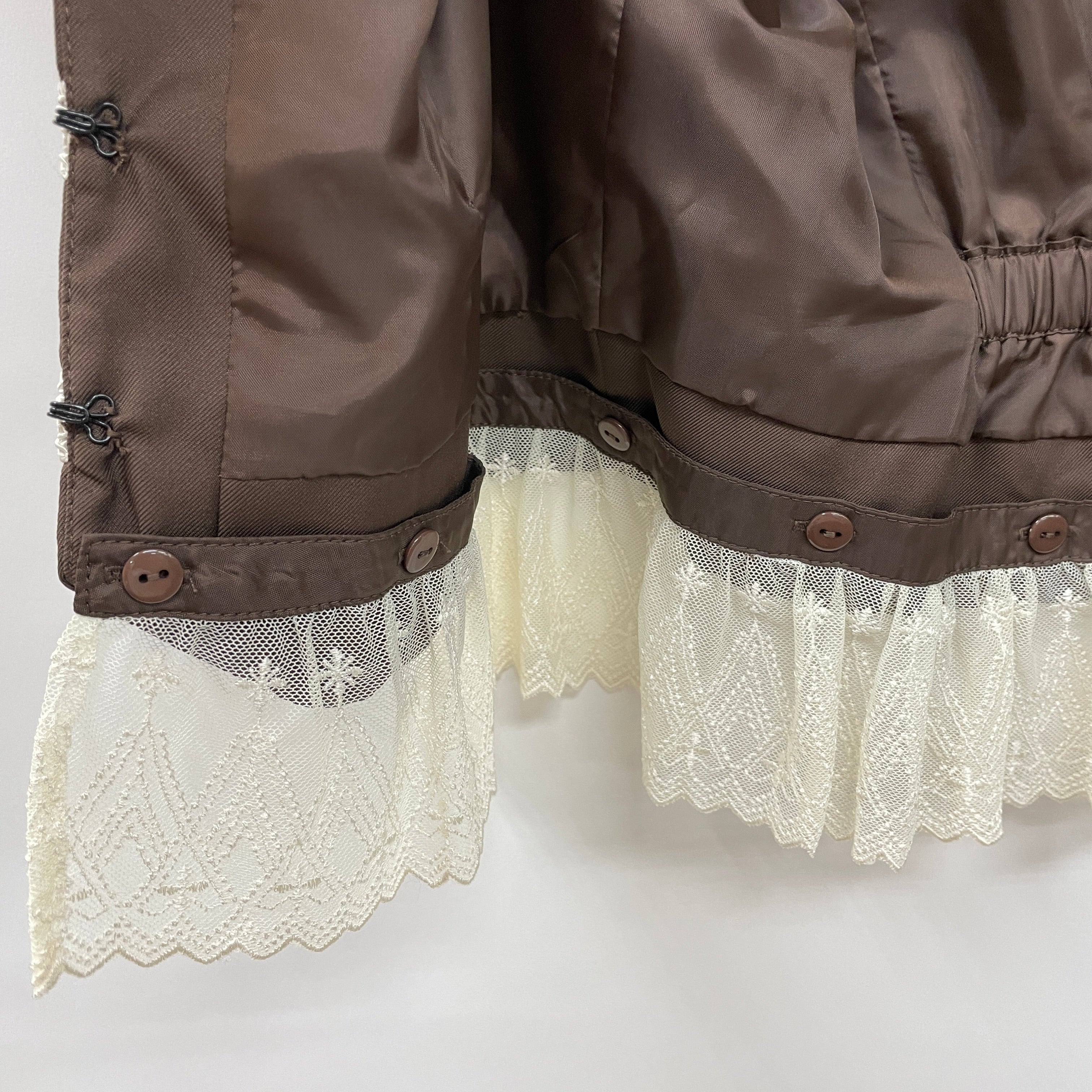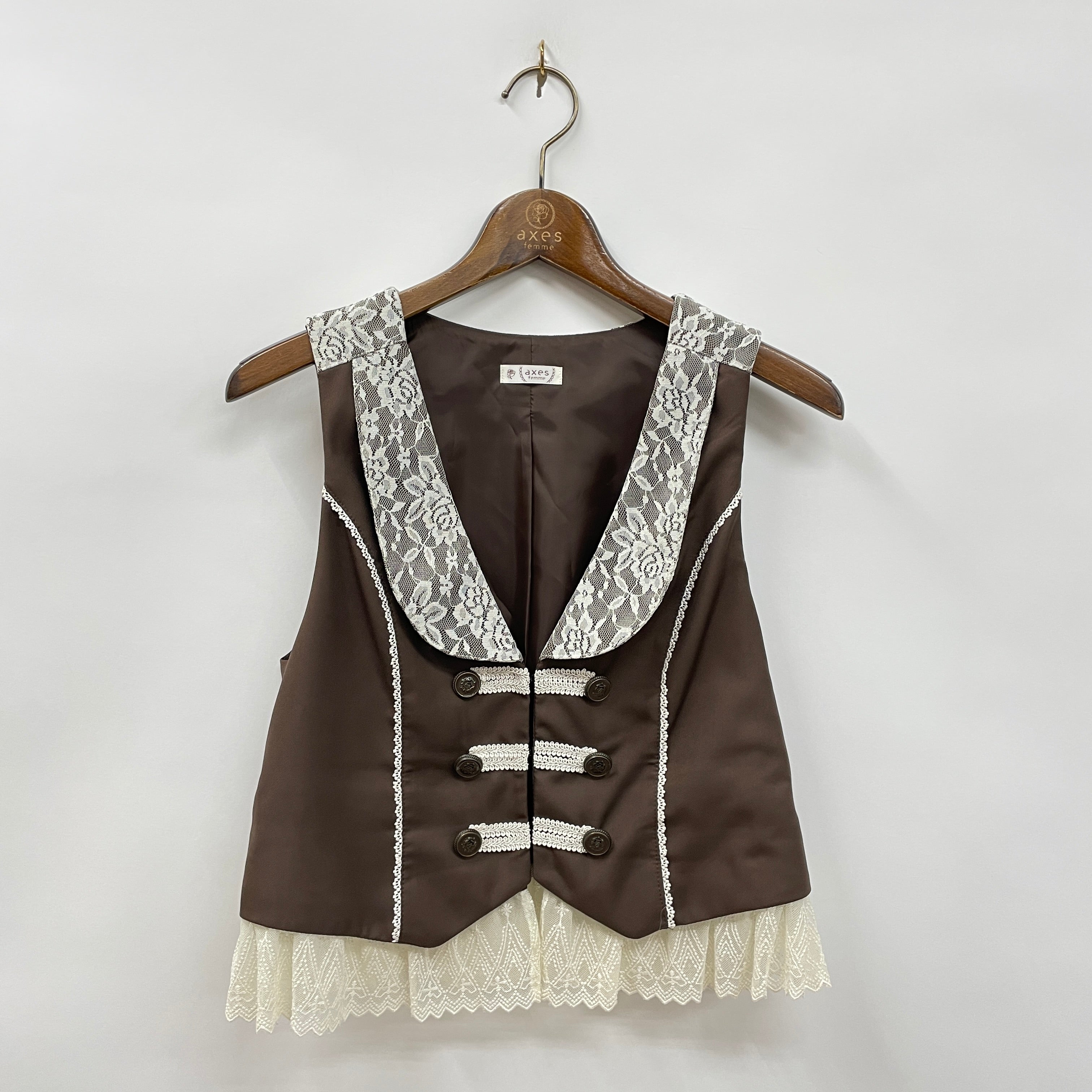 フロント部分のWボタン×ブレードデザインがクラシカルなベスト。裾のレース使いがaxesfemmeならではのアイテムです。レースは取り外し可能なのでショートベストとして使用しても◎。生地連動したスカートとあわせたスタイリングがおすすめ。
