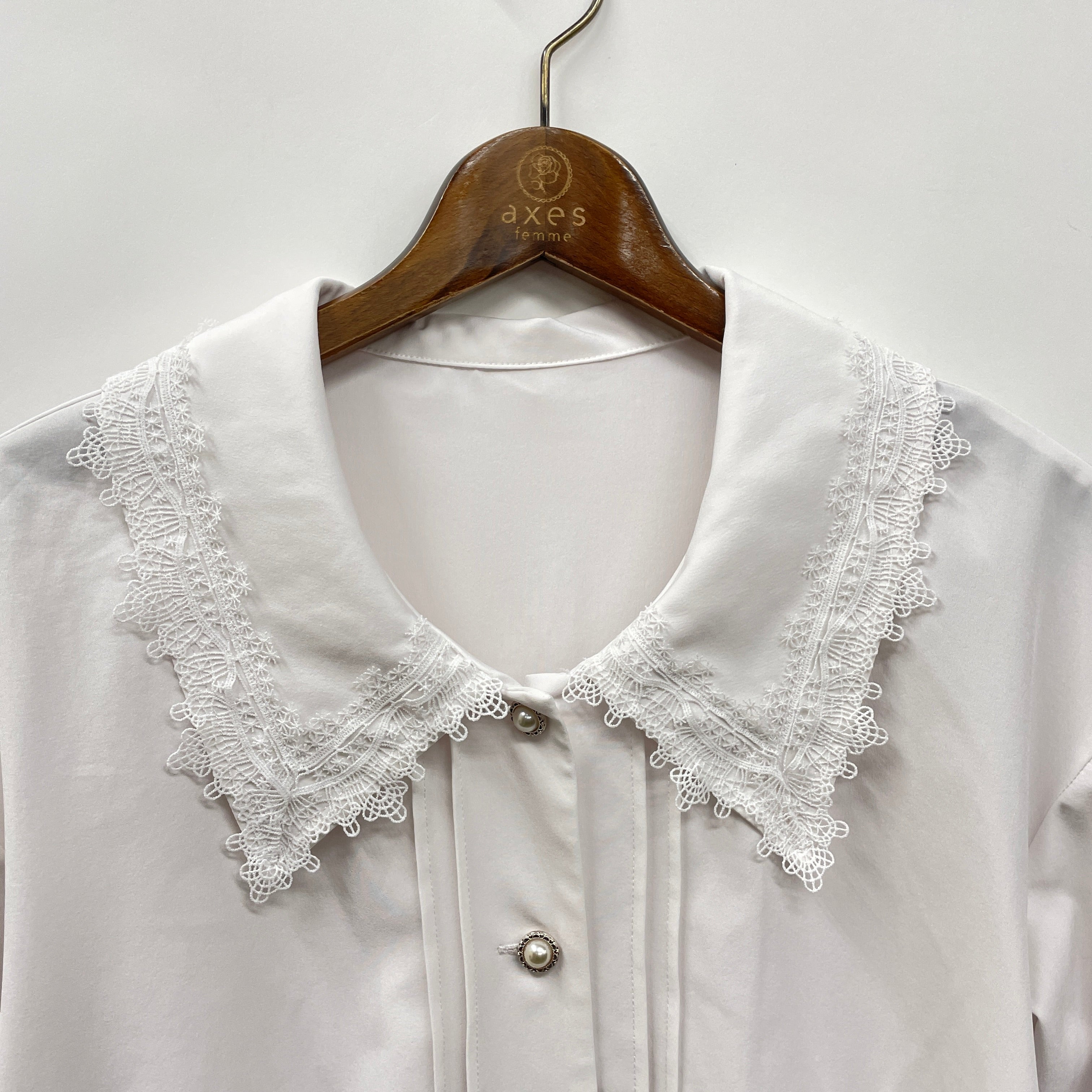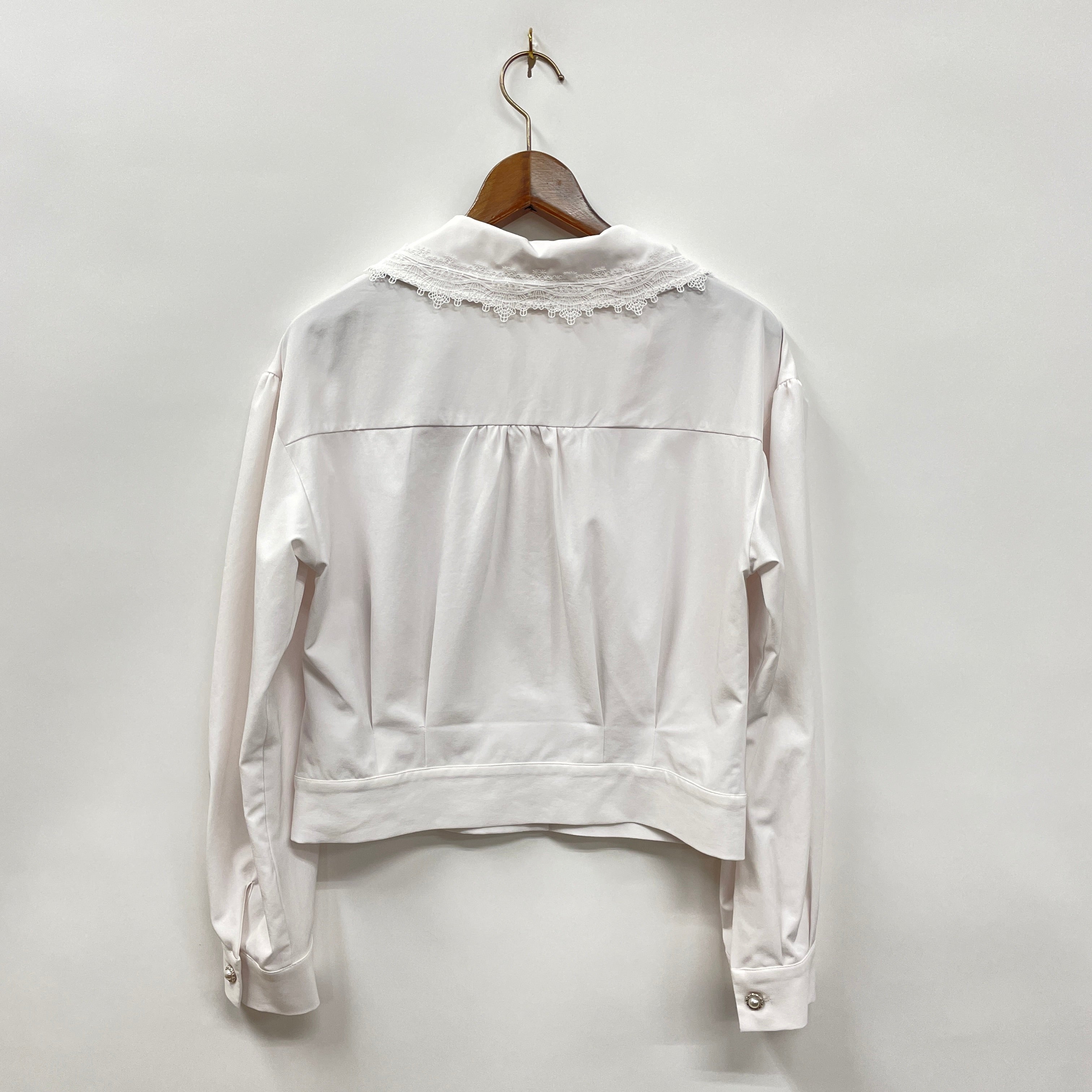 レースをあしらった襟デザインと、ブラウス風の薄手の素材がポイントのブルゾン。