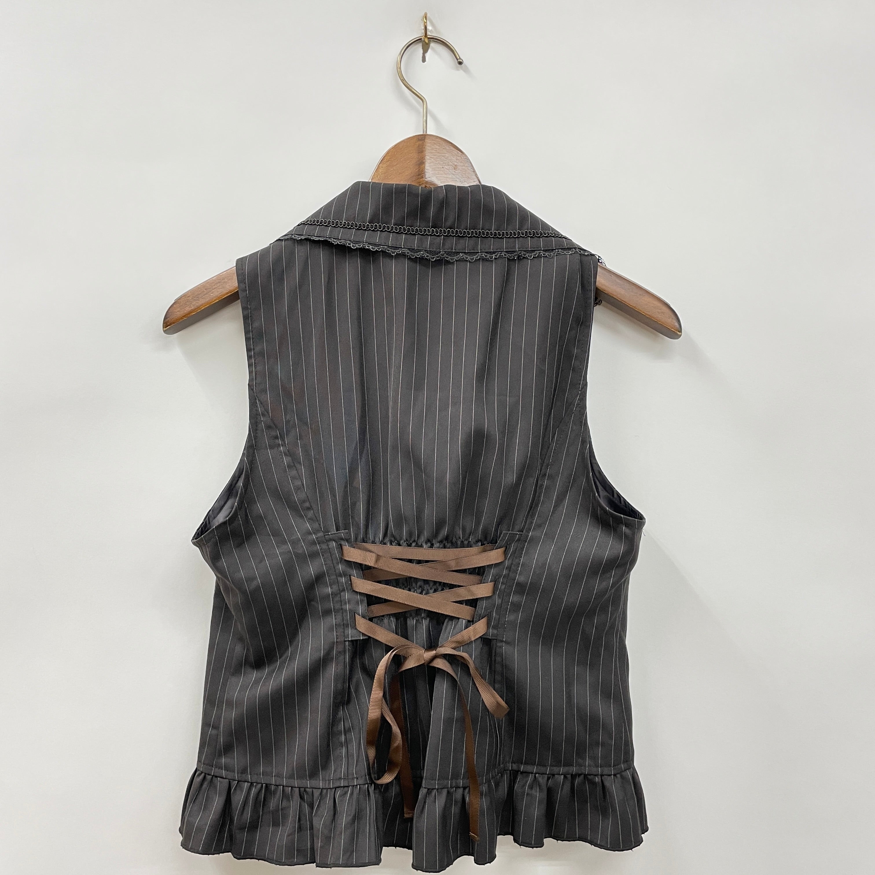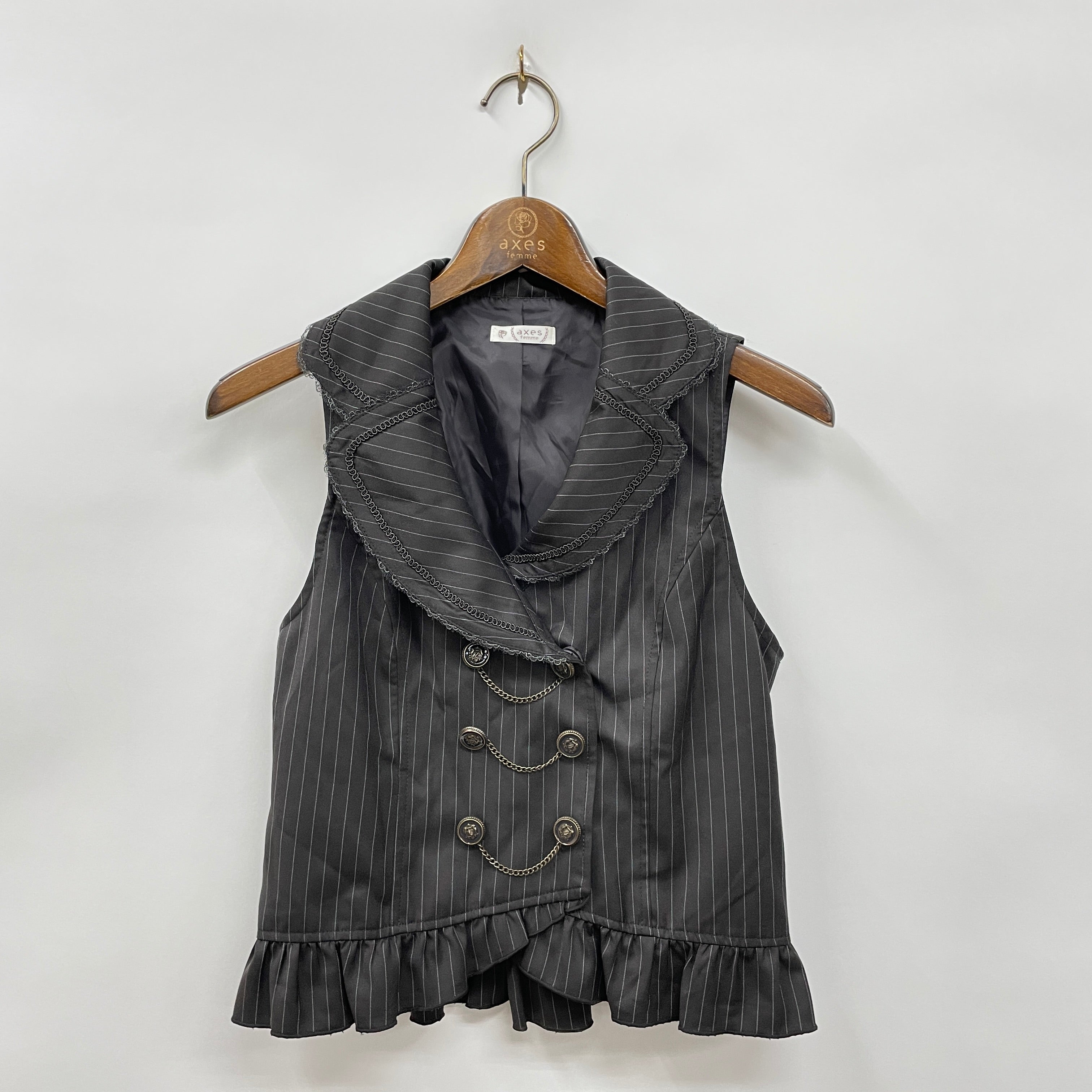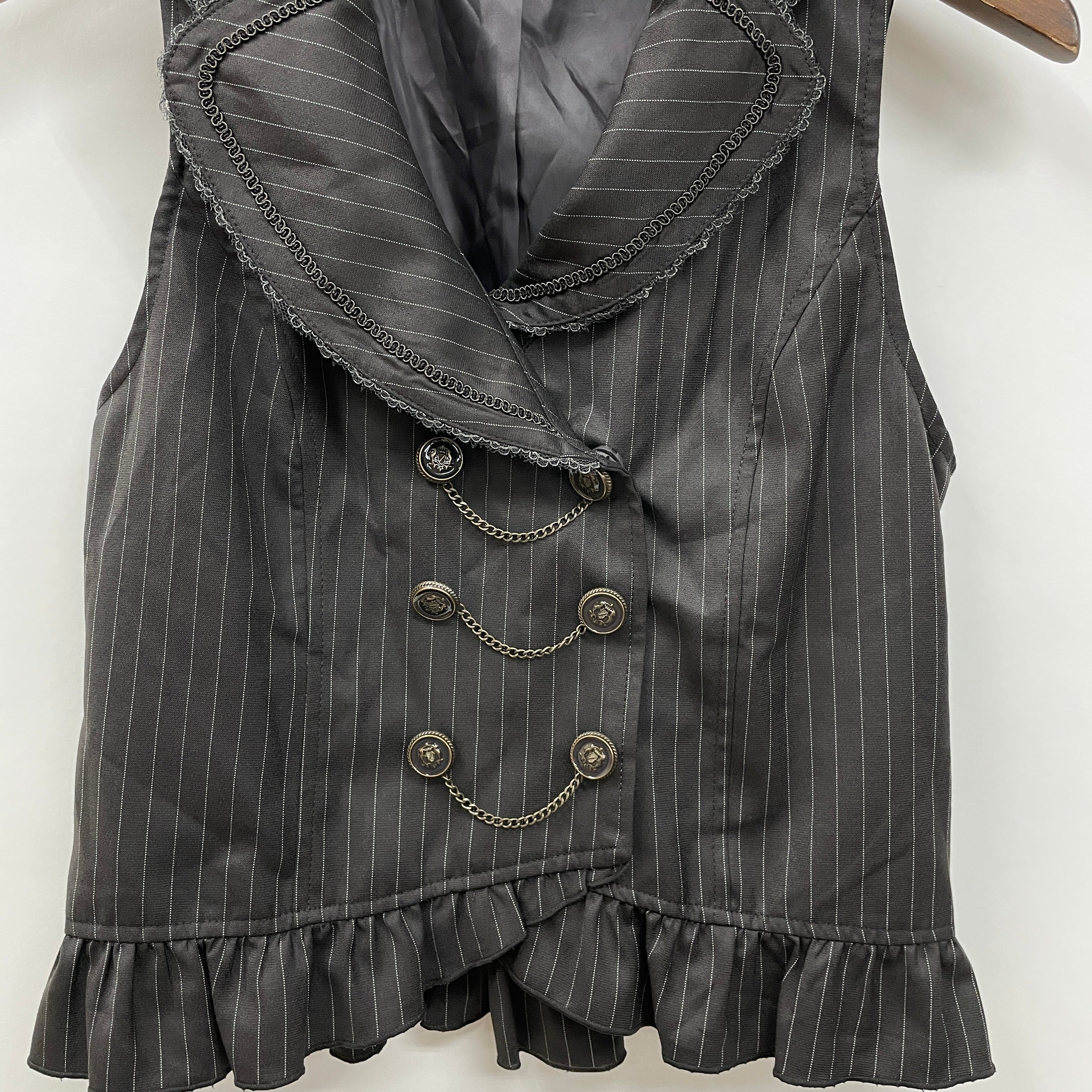 スカートと連動した素材のベストです。ダブルボタンにチェーンが連なったフロントデザインがクラシカルな一着、スナップボタンのため着用も楽です。後ろはシャーリングゴム×レースアップリボンでサイズ調整も◎。