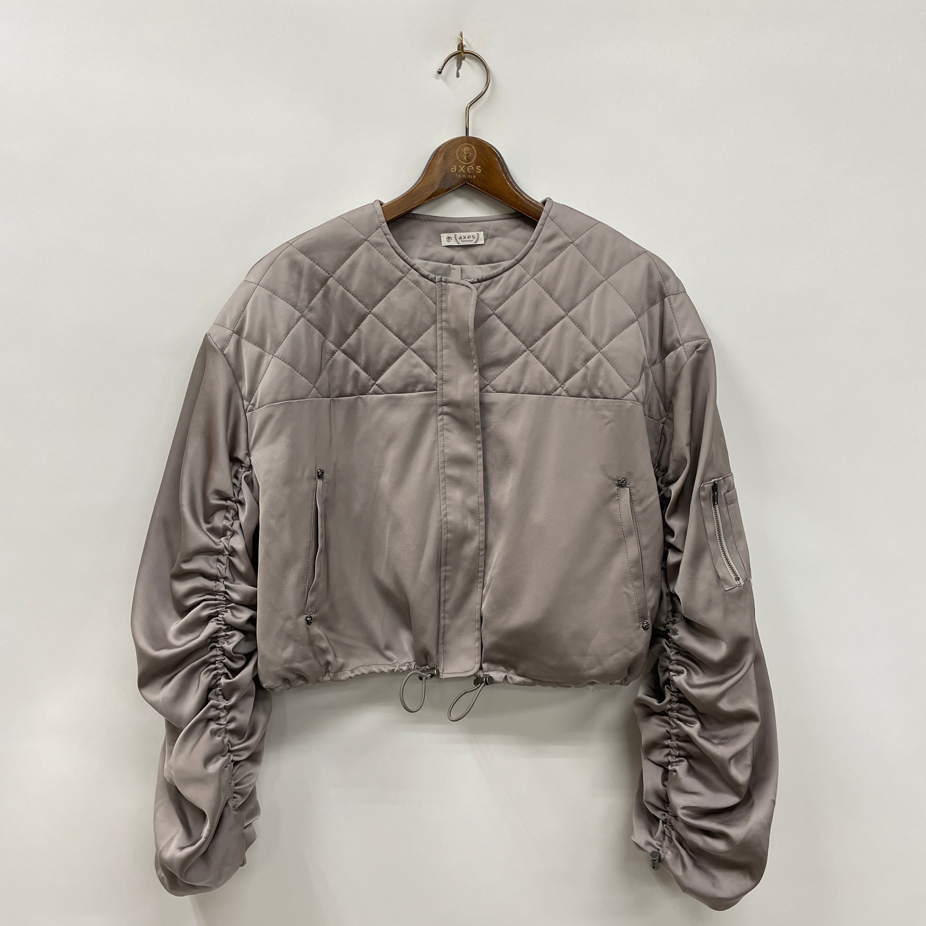 部分的にキルティングステッチを入れアクセントに。袖部分にはドロストデザインを施しさりげなくトレンド感をプラス。ポケットにはローズモチーフをあしらいaxes femmeらしいディティールを。