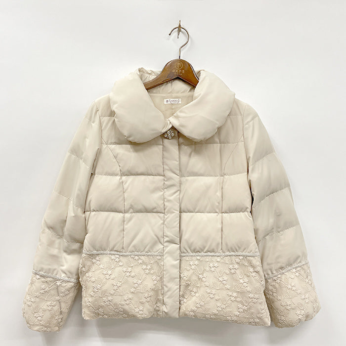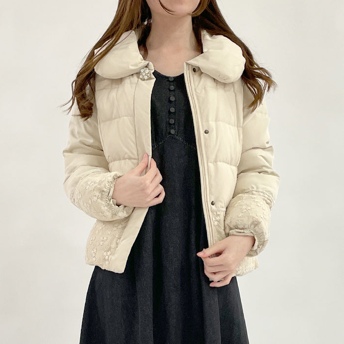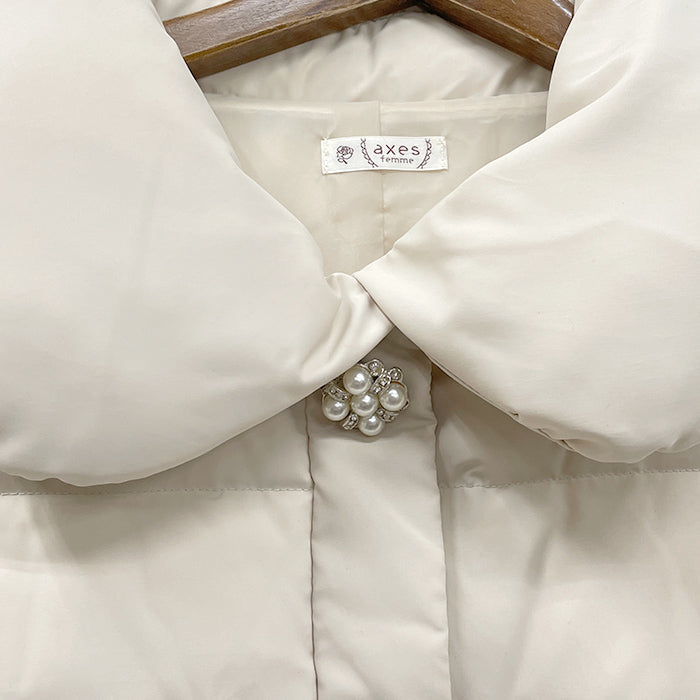 防寒性の高いショートダウンコート。ダウンの分量、ふくらみ具合を計算しすっきりしたシルエットを実現させました。ワンピースやフレアスカートを合わせたエレガンススタイルがおすすめ。