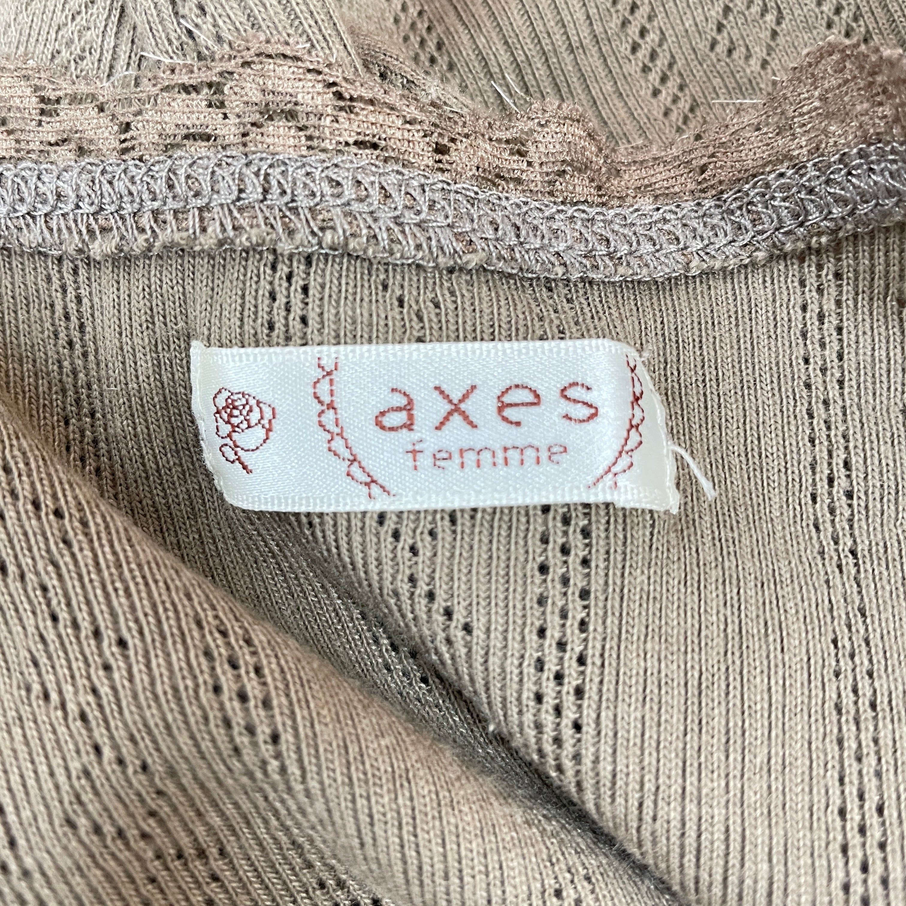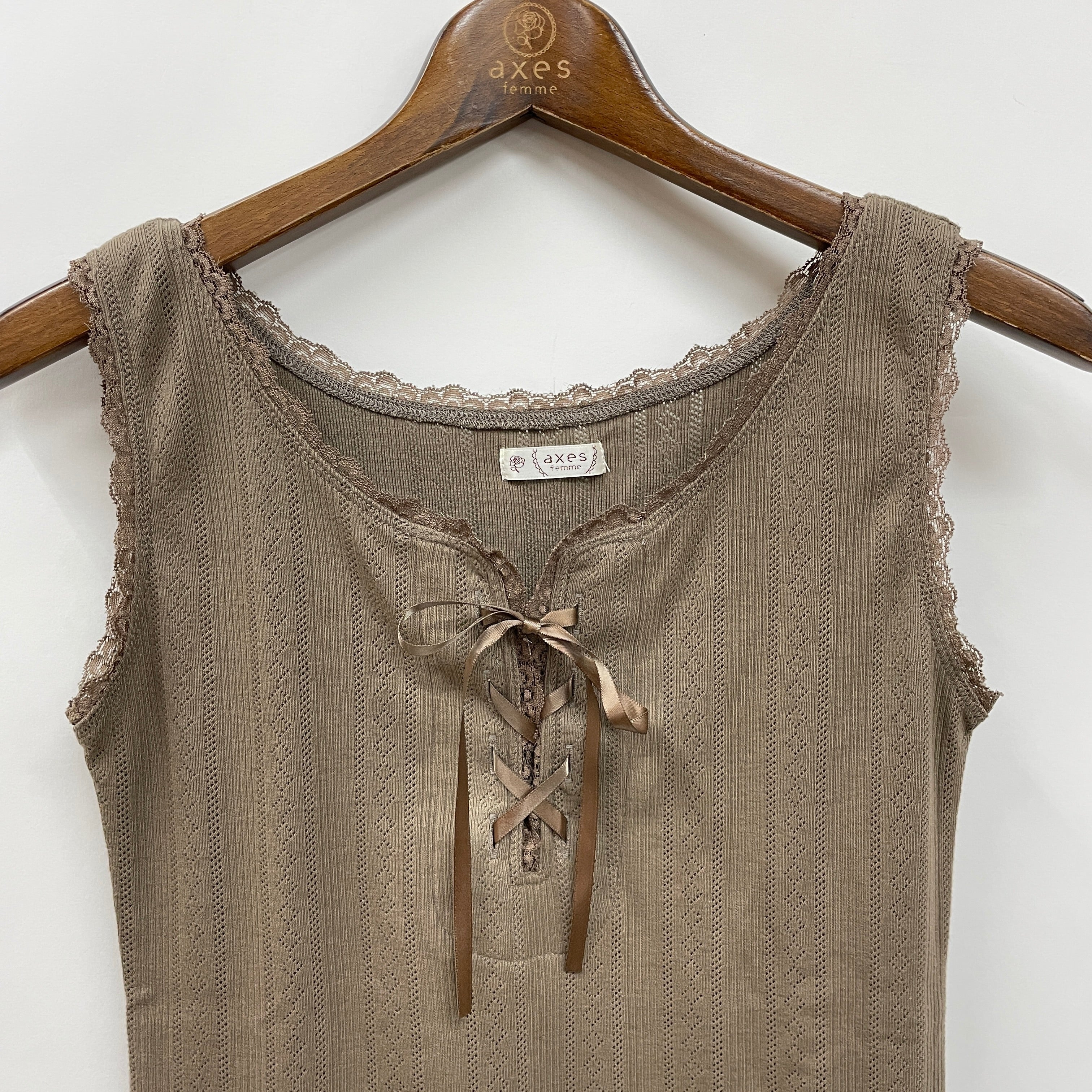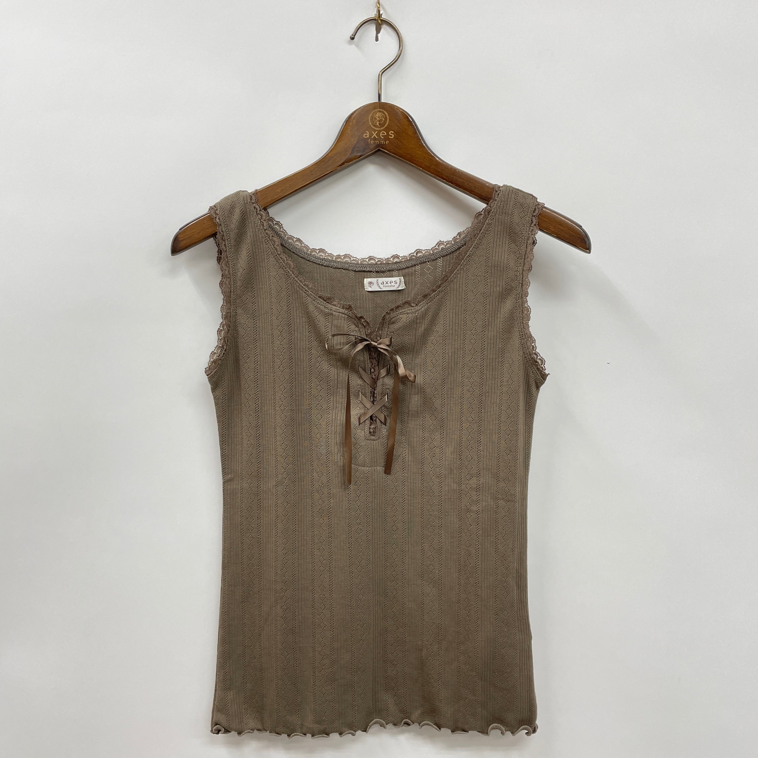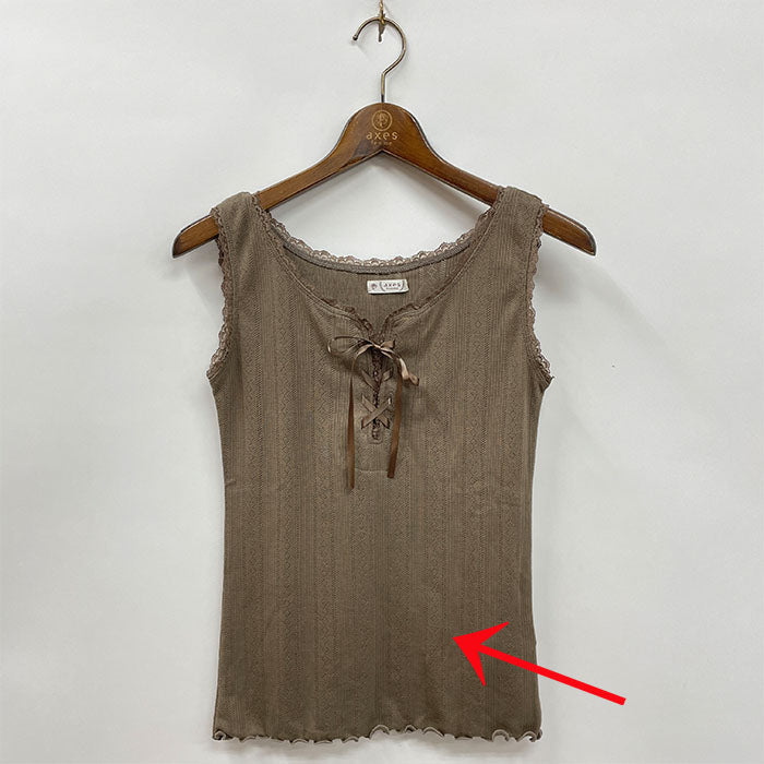 ストレッチのきいたフィット感のあるインナーです。さりげないレースデザインやフロントの編み上げデザインがポイント。Uネックで着まわしやすいアイテム。暖かい季節にはカーディガンやシャツをさらっと羽織ったスタイリングも。