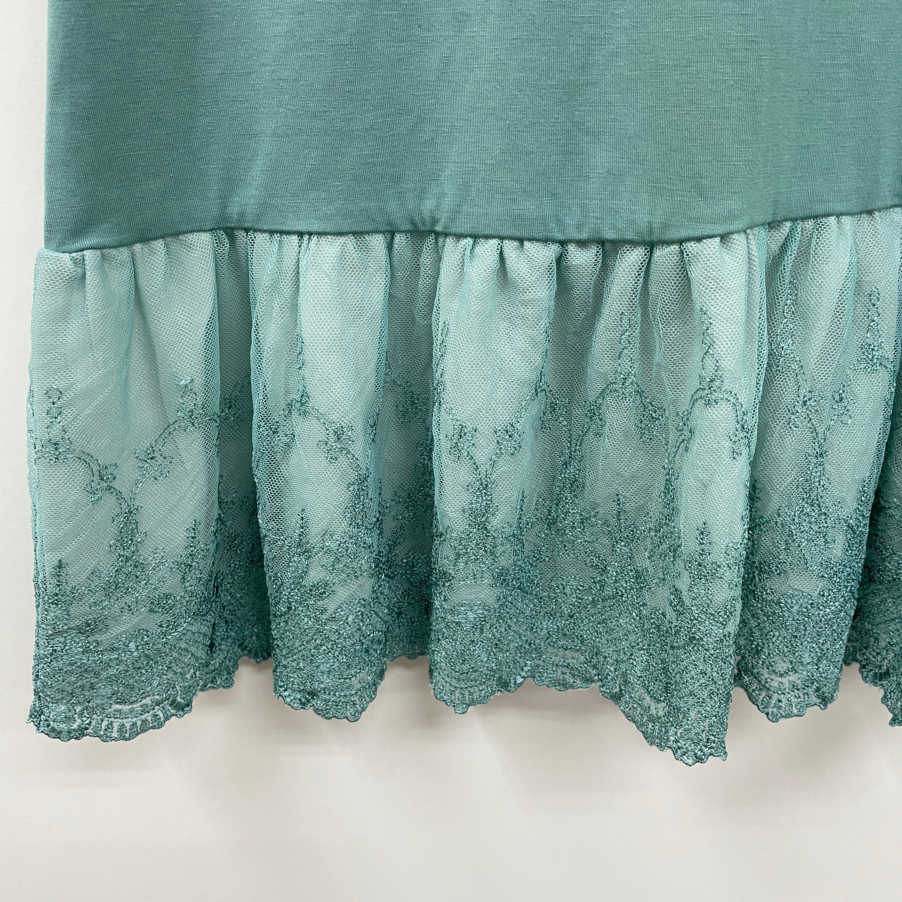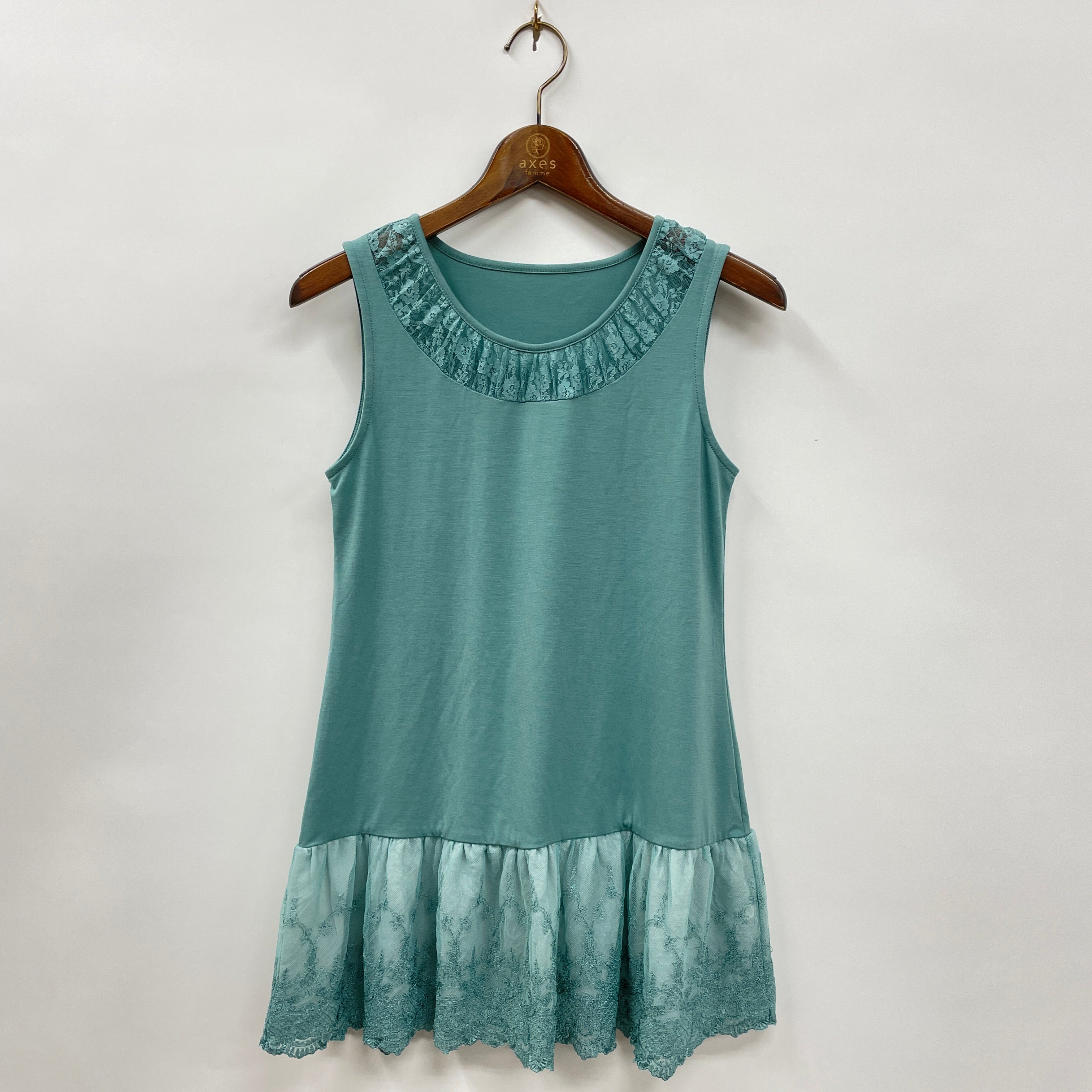 トレンドのチュニックスタイルなど、トップスの裾からチュールレースを覗かせたレイヤードスタイルが楽しめるロングタンクです。繊細な柄のレースを使用しており、中に着るだけでフェミニンスタイリングにもカジュアルスタイリングにも合わせられる便利な1枚。ウエスト~ヒップラインを隠してくれるうれしいアイテムです。