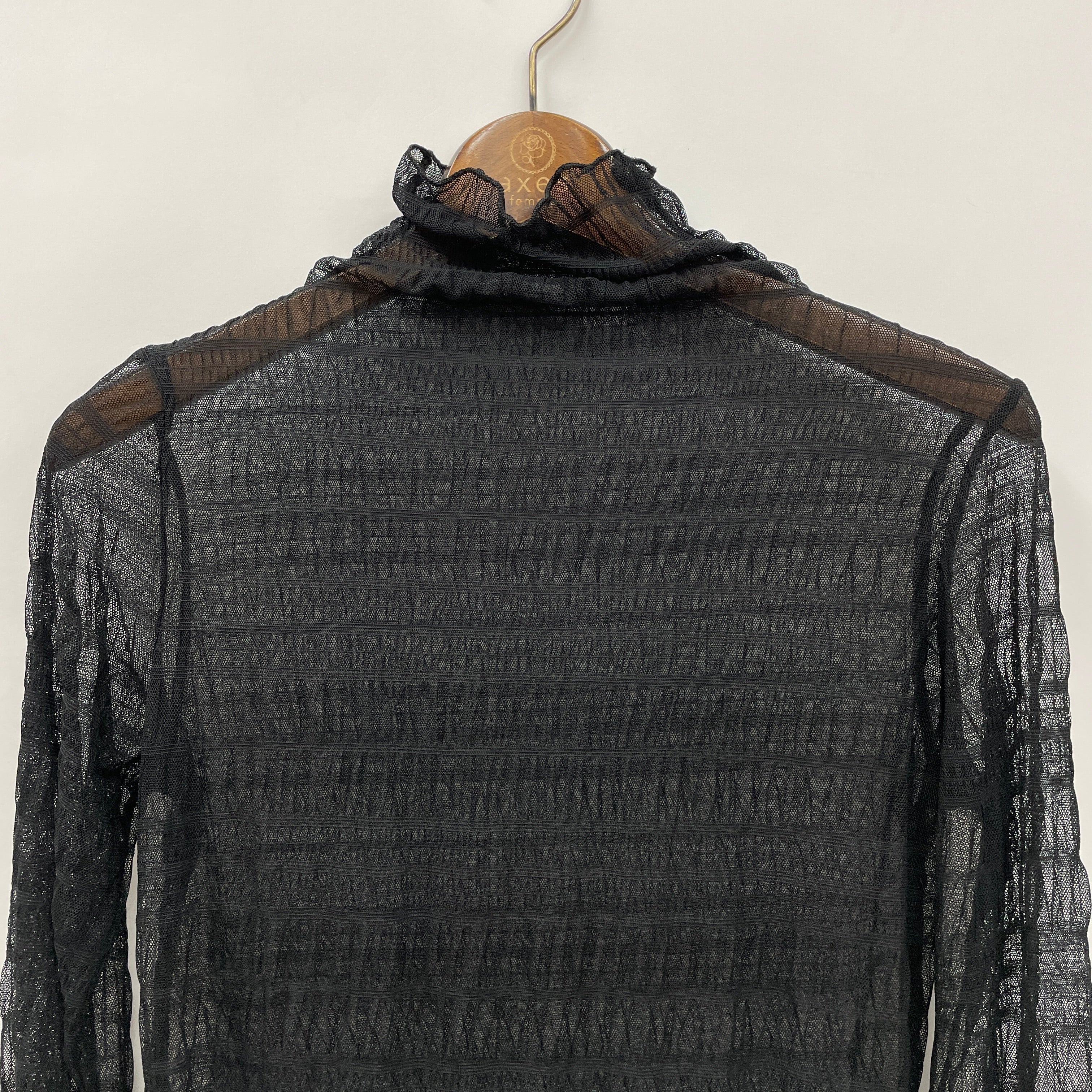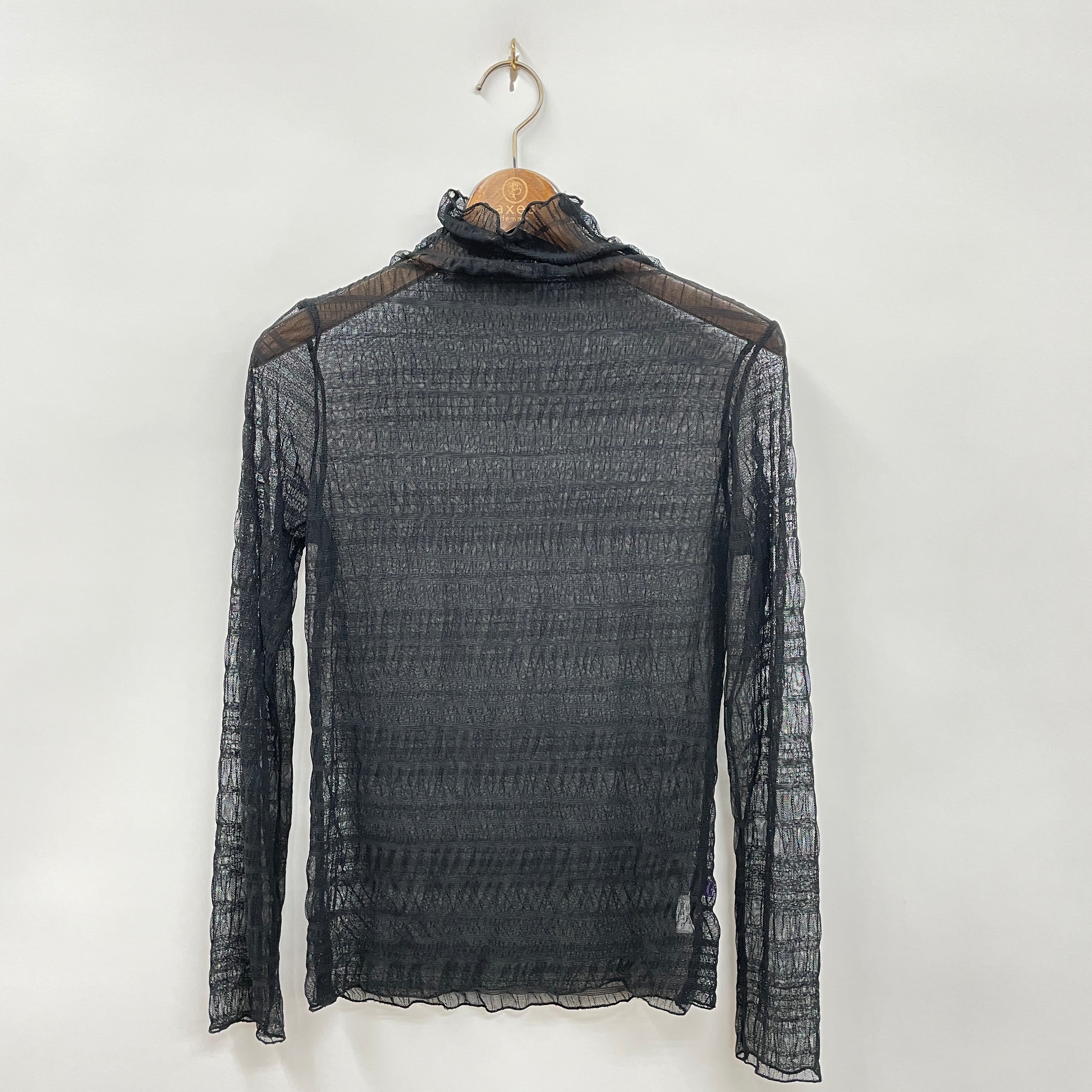 薄手で柔らかいシアー素材を使用し、涼しげで抜け感のある仕上がりに。ハイネックデザインが首元をきれいに見せ、シンプルながらも洗練された雰囲気をプラス。袖丈やシルエットは程よいフィット感があり、レイヤードスタイルにもぴったり。
