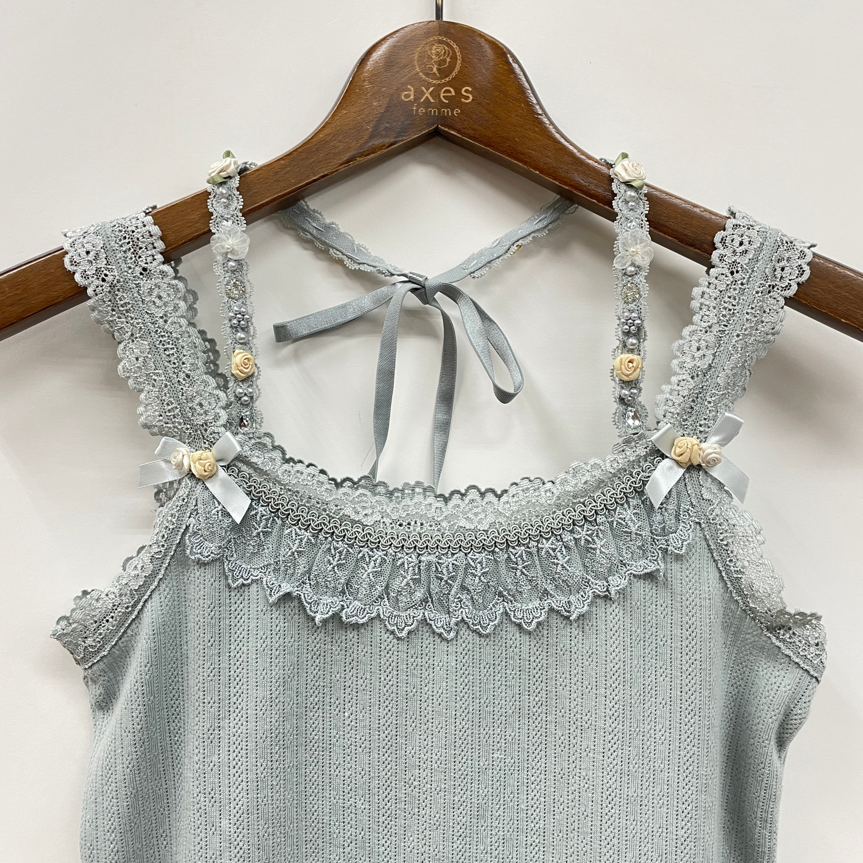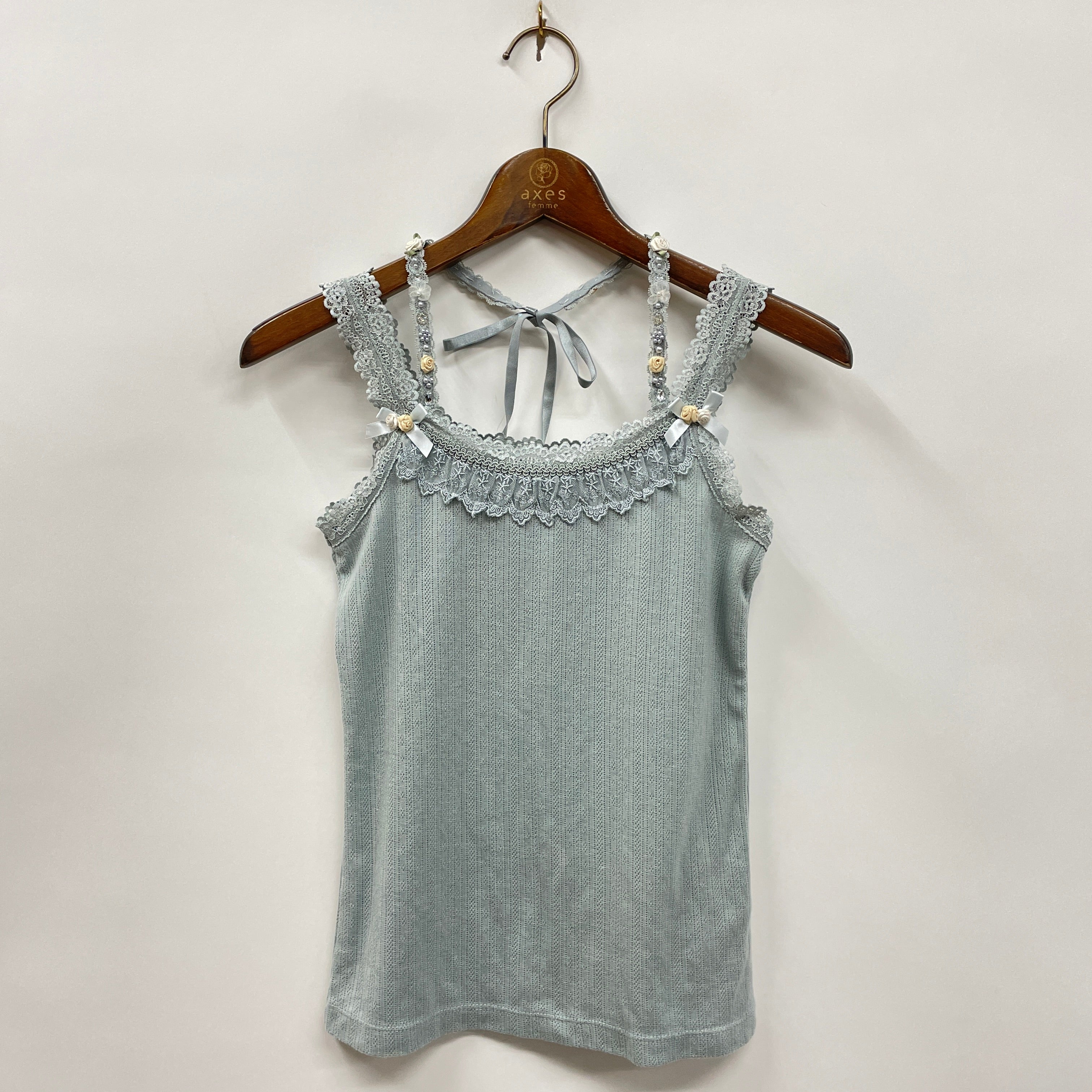 巻きバラやビジュー、パールなどが散りばめられたストラップが華やかなキャミソールです。パターンメッシュ素材なので、伸縮性が良くフィットする安心感や柔らかい着心地が◎。ストラップは取り外しができるので、肩紐の巻きバラとリボンだけがワンポイントになる形で着回しもできます。