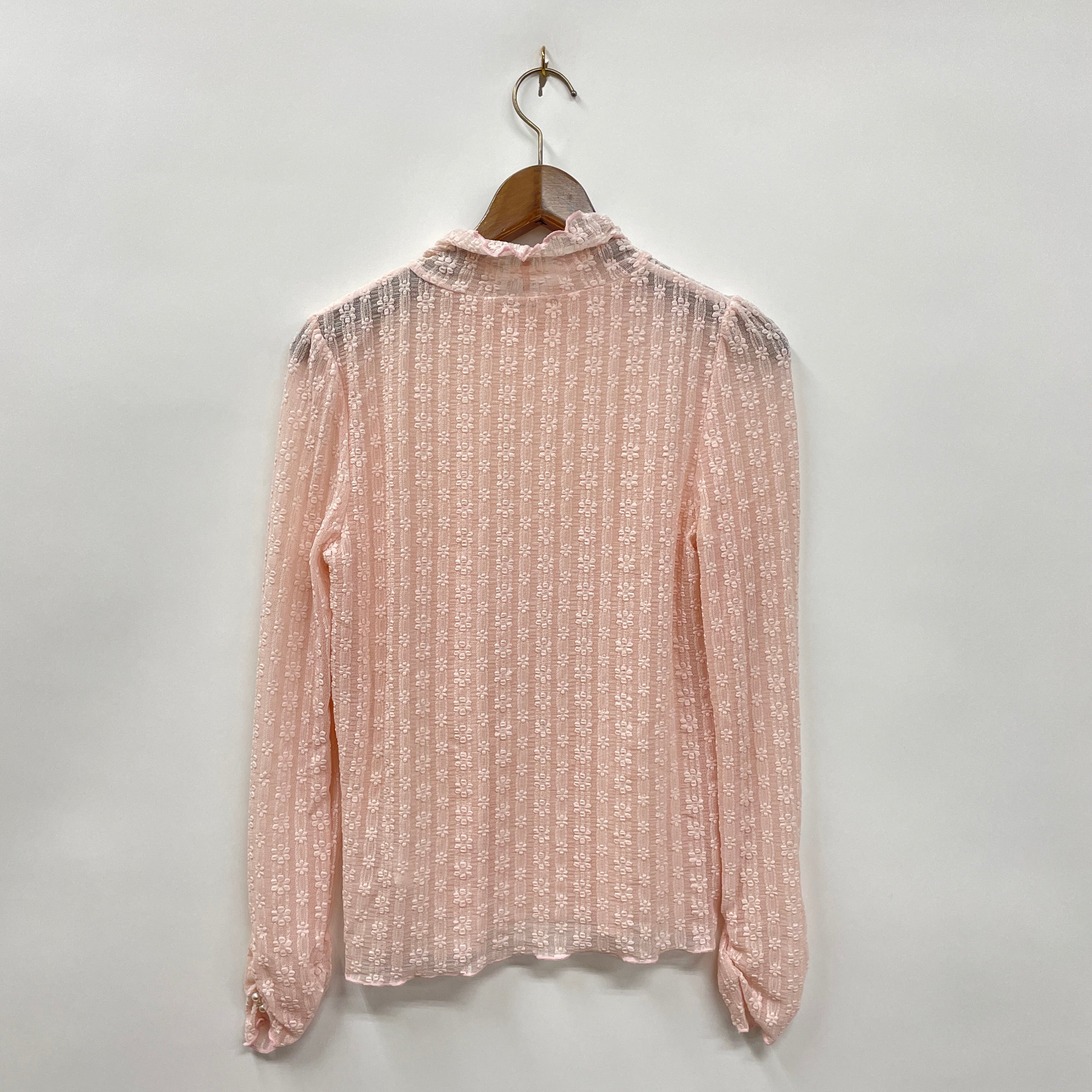 袖口にはギャザーデザイン+パールをあしらっており、上に重ねるトップスの袖口から出して可愛いデザインです。