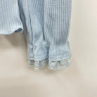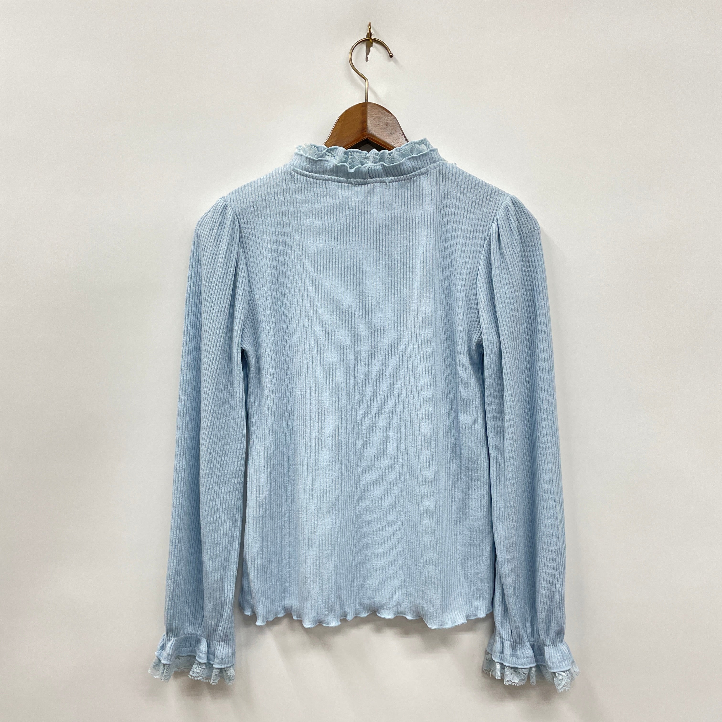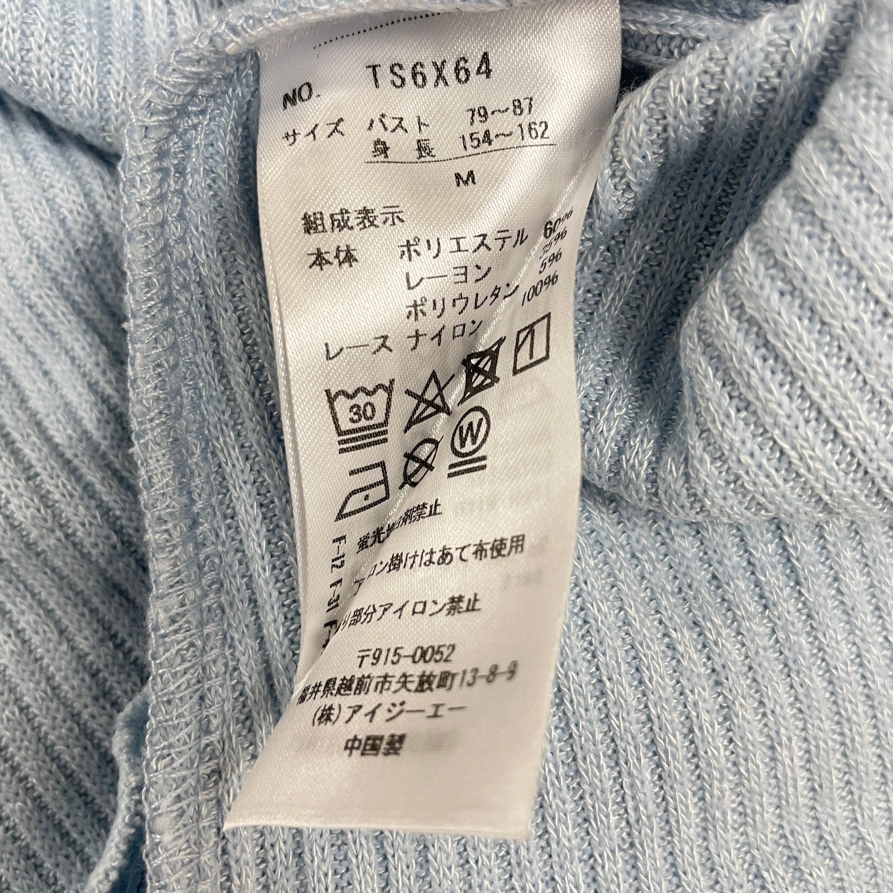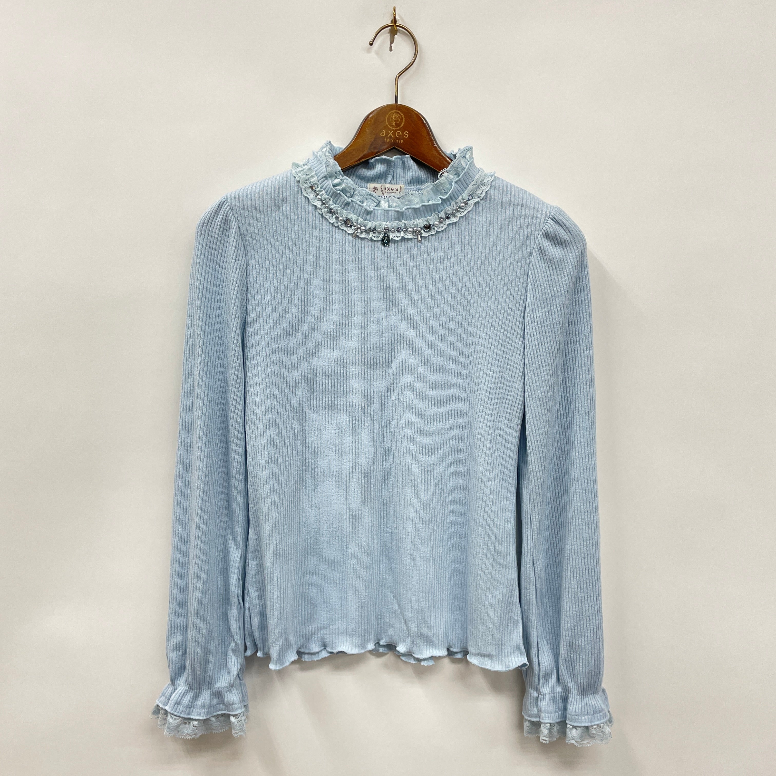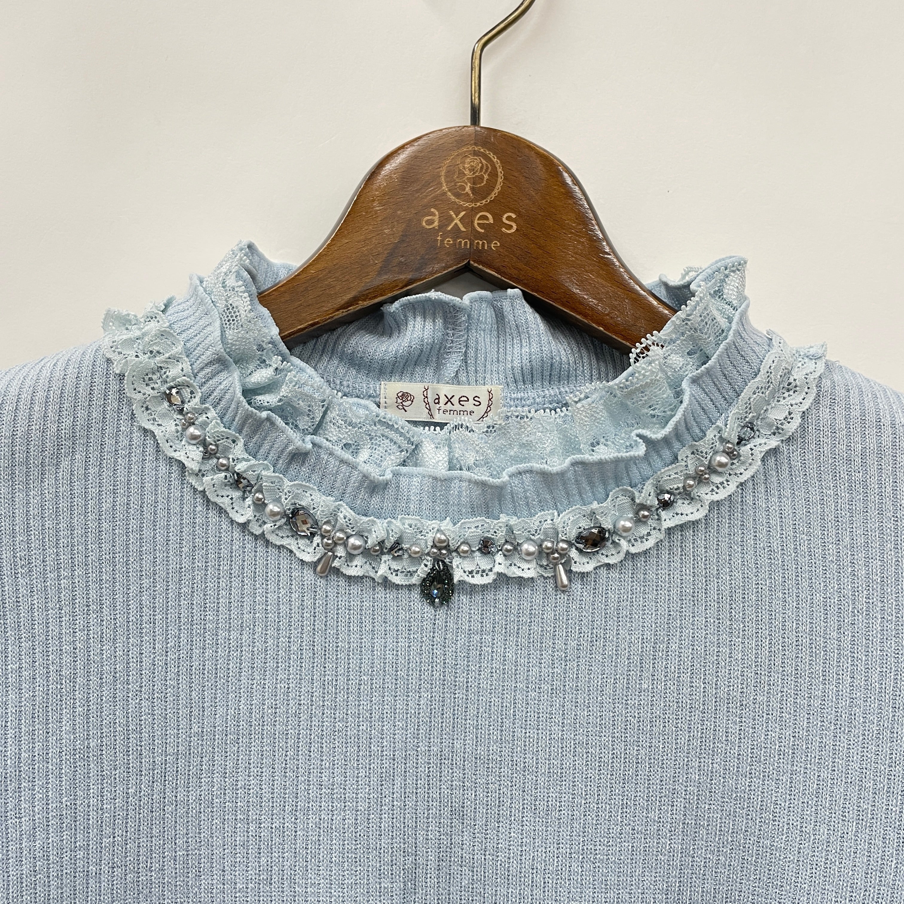 首のレースとフリルの重なりが綺麗なリブプルオーバーです。胸元にネックレス風に並んだビジューとパールがアクセントになり、華やかな印象になります。伸縮性の良いリブ素材を使用しているので、気やすさ◎ボトムスを選ばず、スカートスタイリングにもパンツスタイリングにも合わせやすい万能アイテムです。