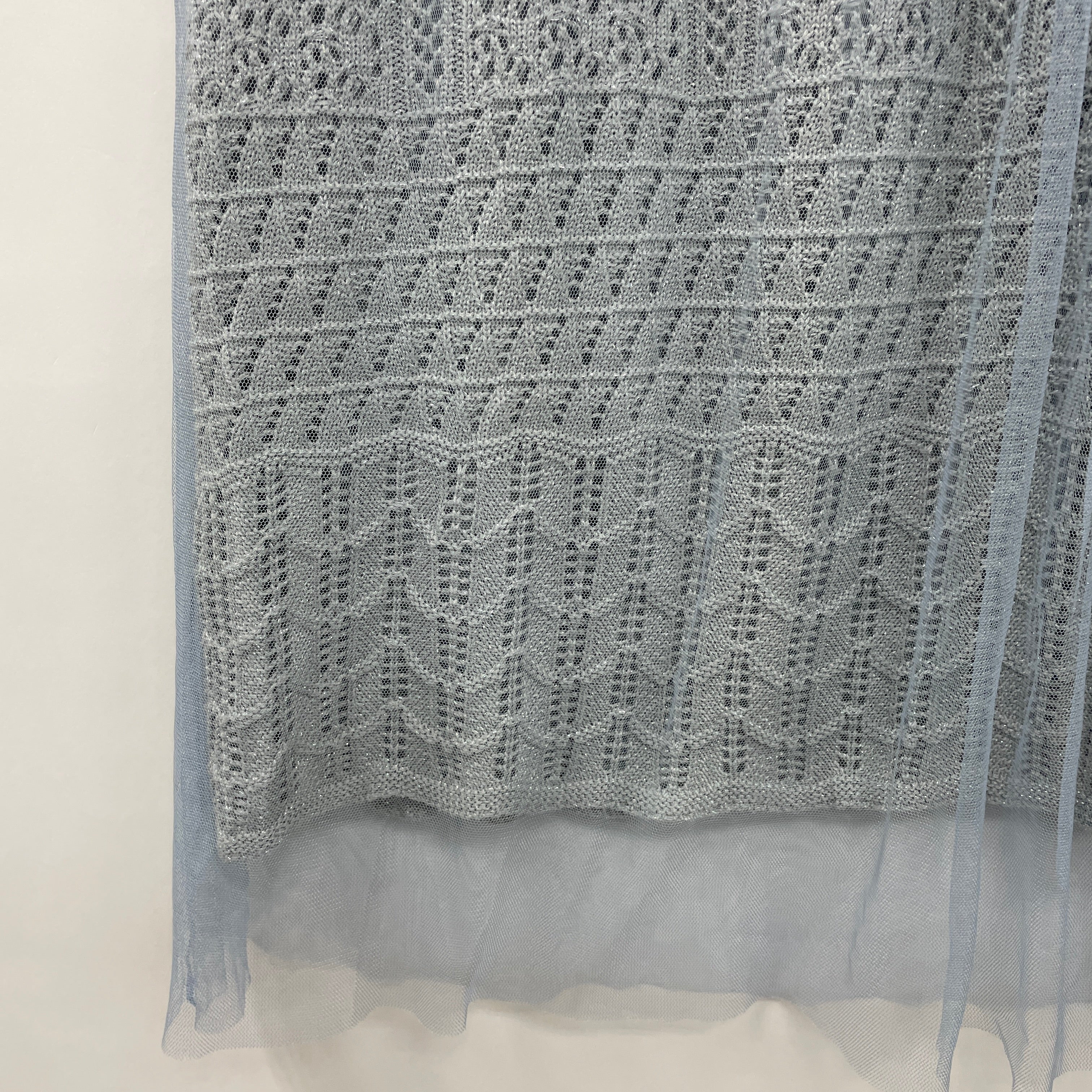 ラメ糸を織り込んだ華やかなニット地にチュールを合わせ軽やかさを出したアイテムです。