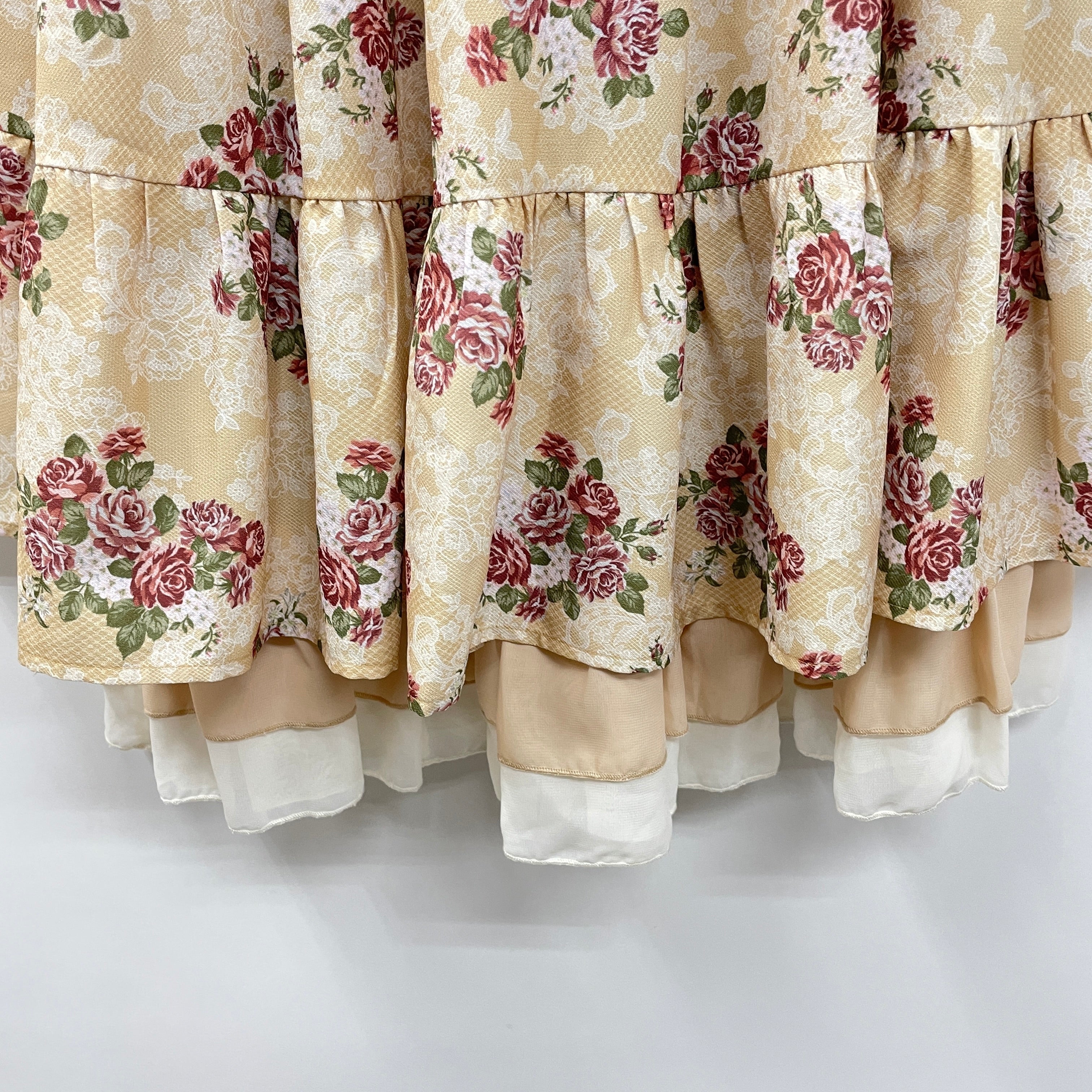 裾には2段のグラデーションフリルをあしらい、たっぷりとしたボリューム感のあるデザインです。