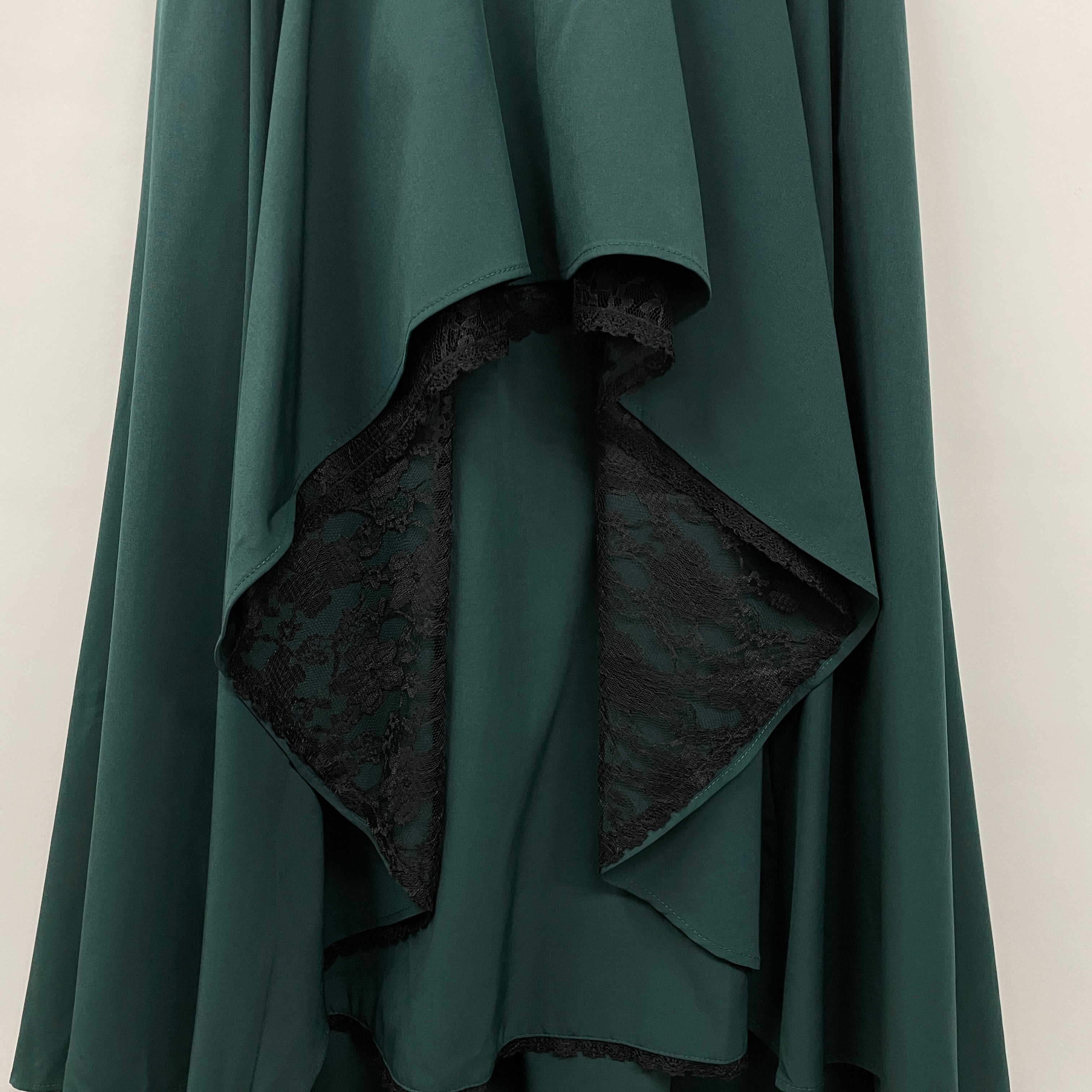 裾からのぞくバイカラーレースが華やかなアクセント。歩いたときにふんわり揺れ、後ろ姿まで美しく見せてくれます。ウエストの大きなリボンは取り外し可能で、気分に合わせたアレンジを楽しめるのもポイントです。