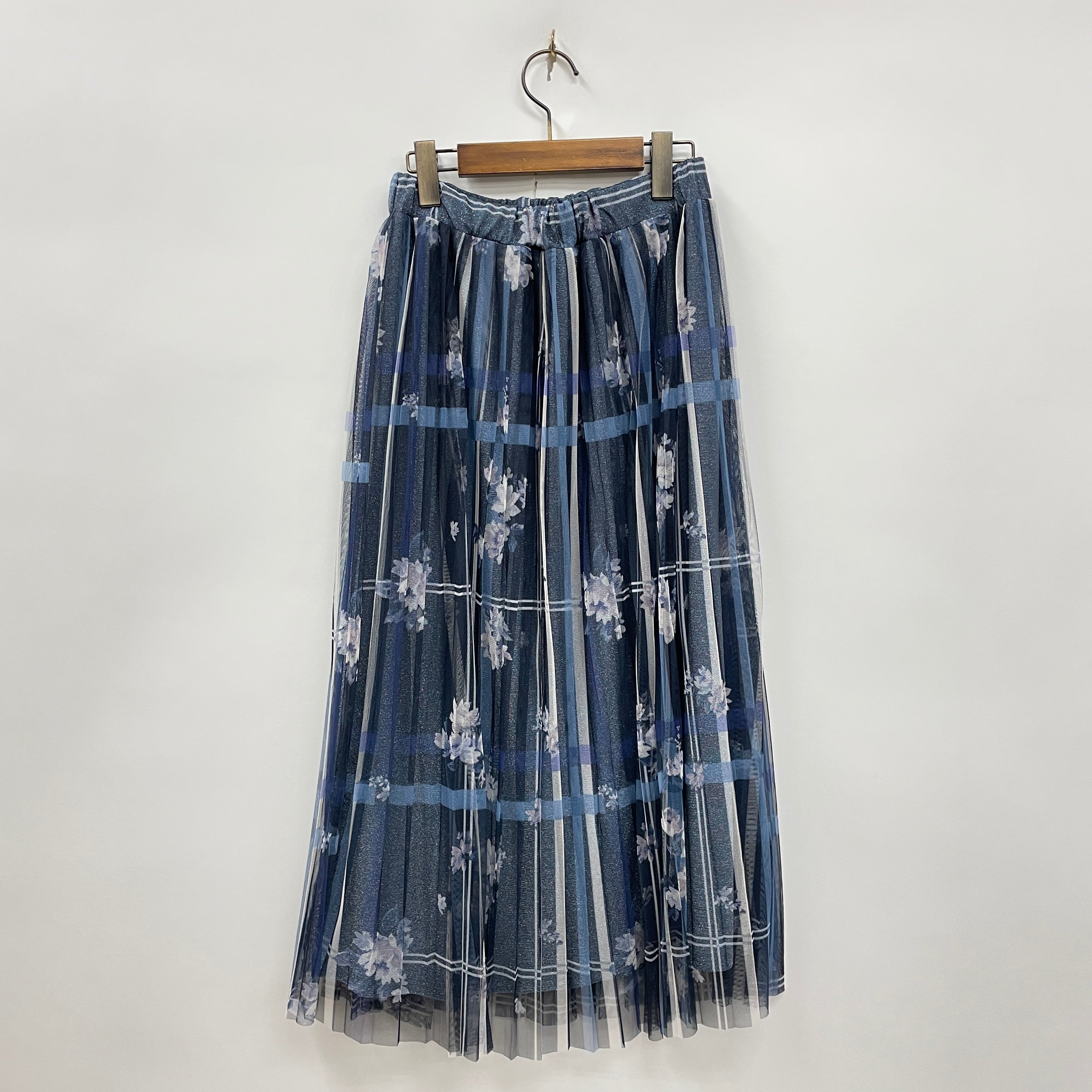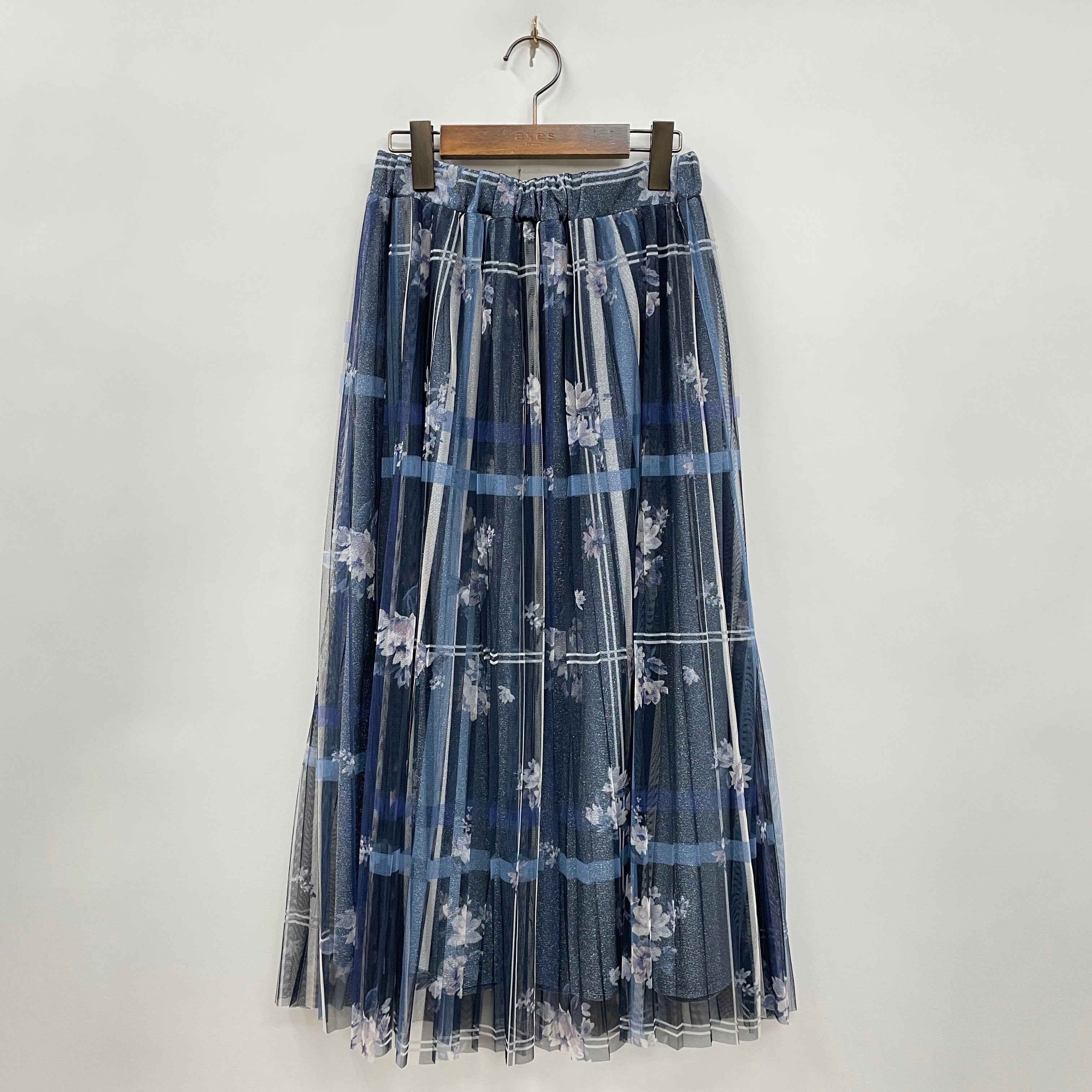 ラメカットの裏地に、花柄のプリントチュールを重ねたフェミニンなスカートです。