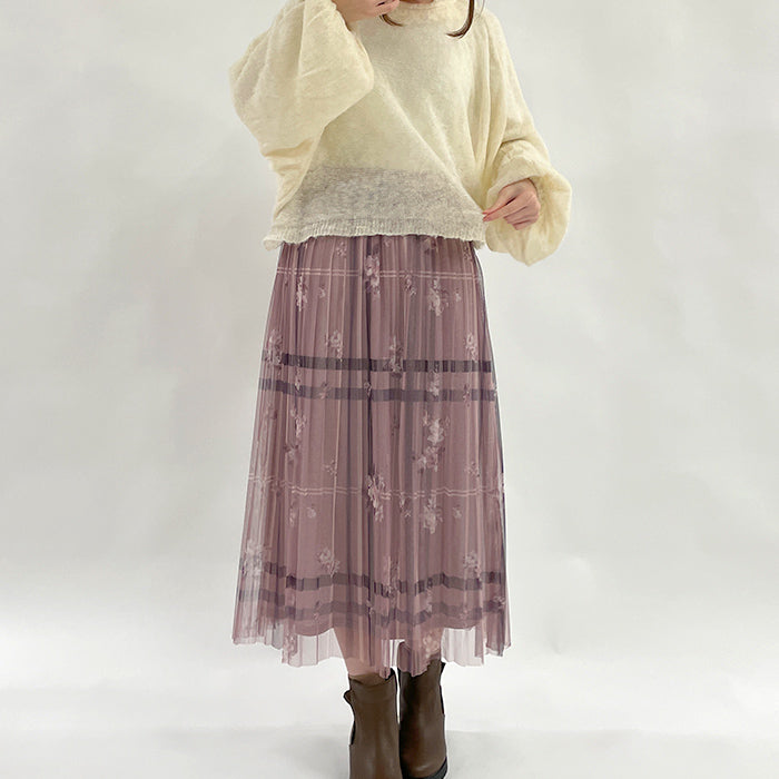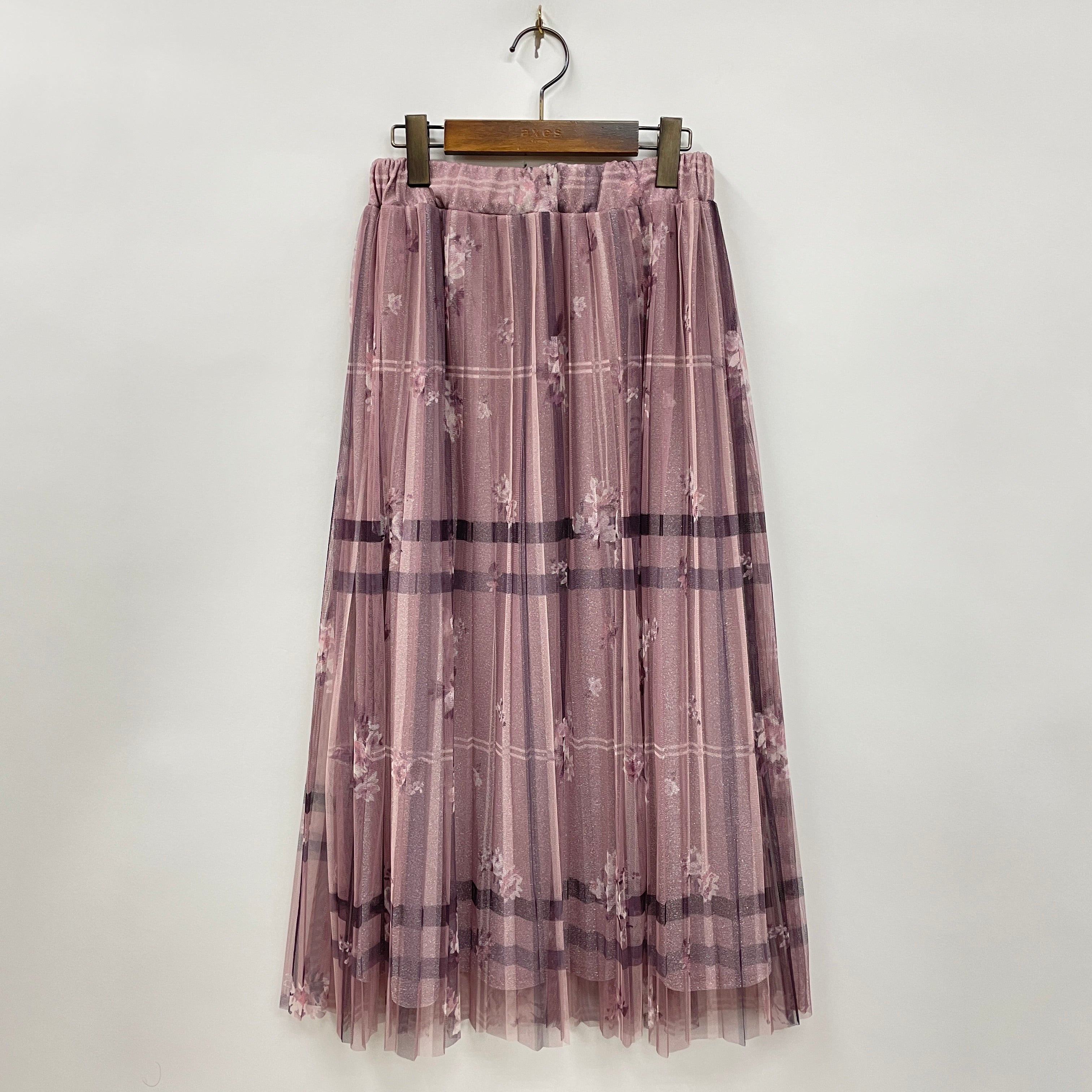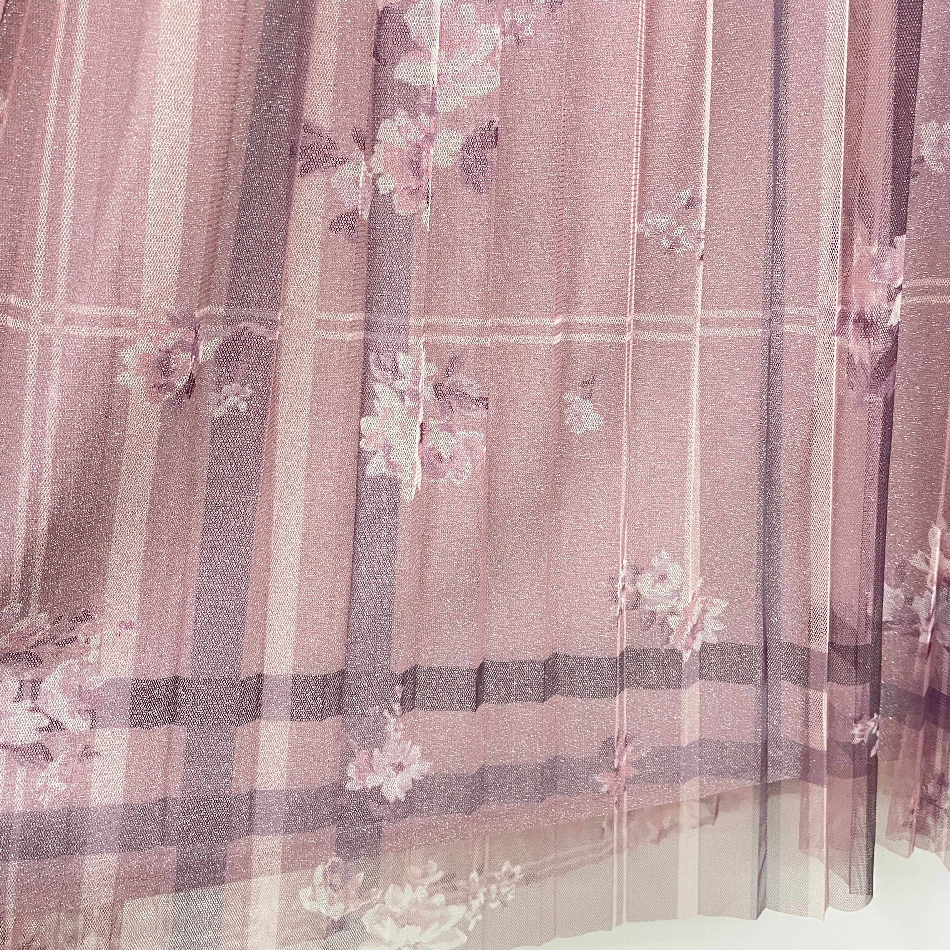 ラメカットの裏地に、花柄のプリントチュールを重ねたフェミニンなスカートです。