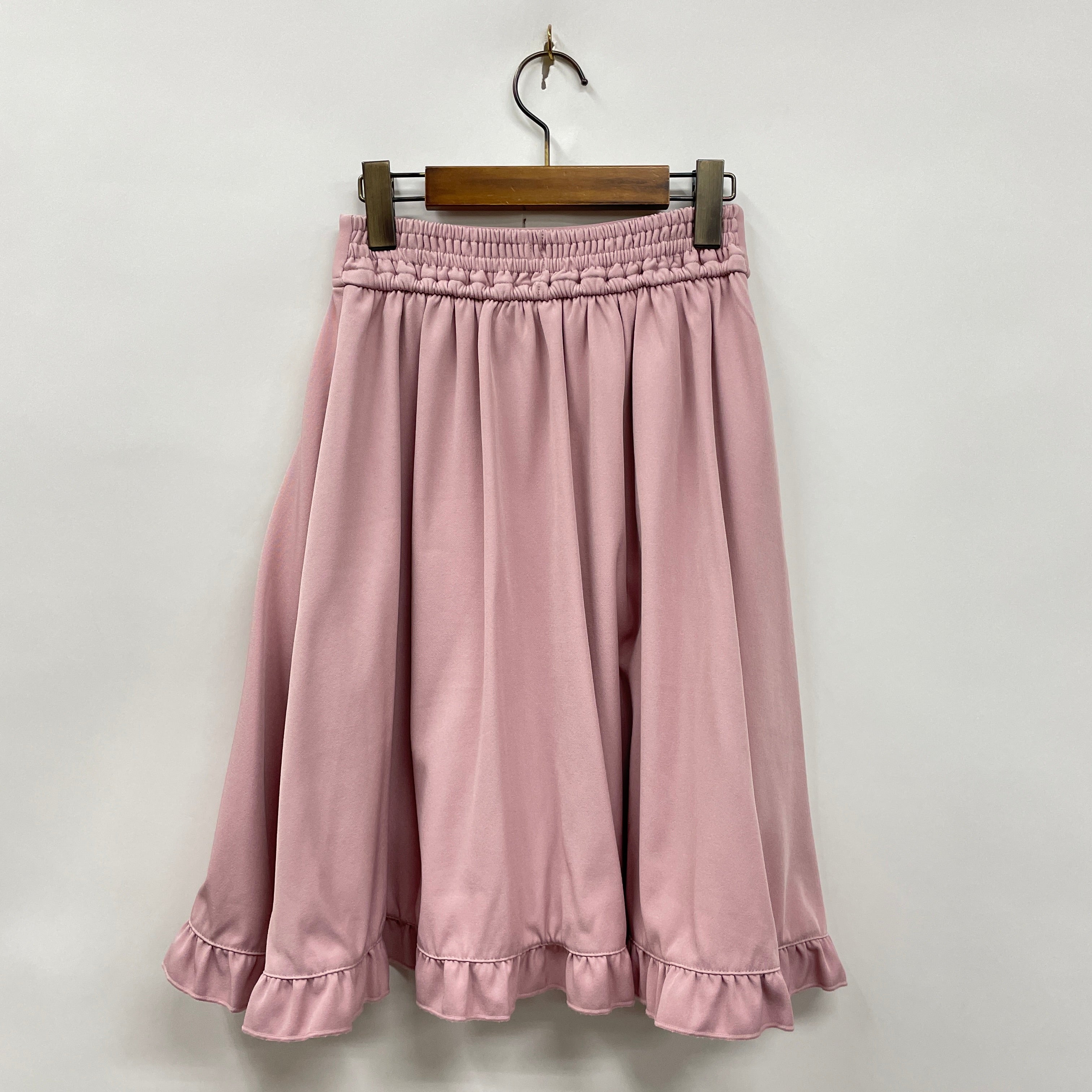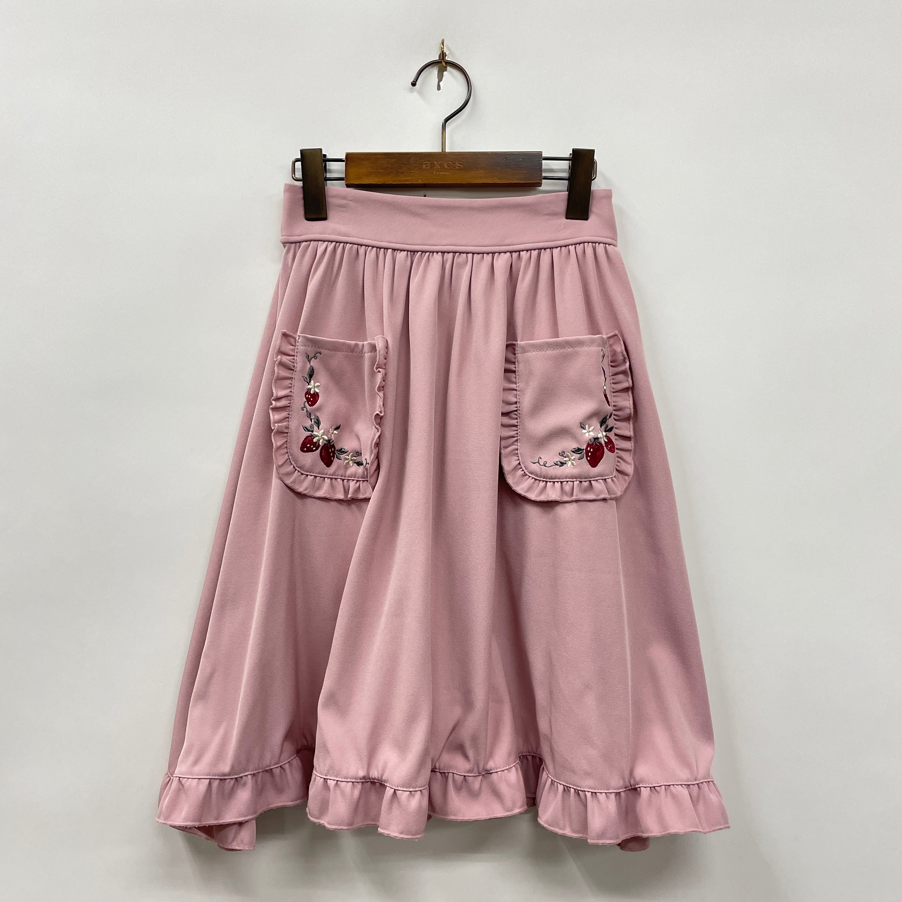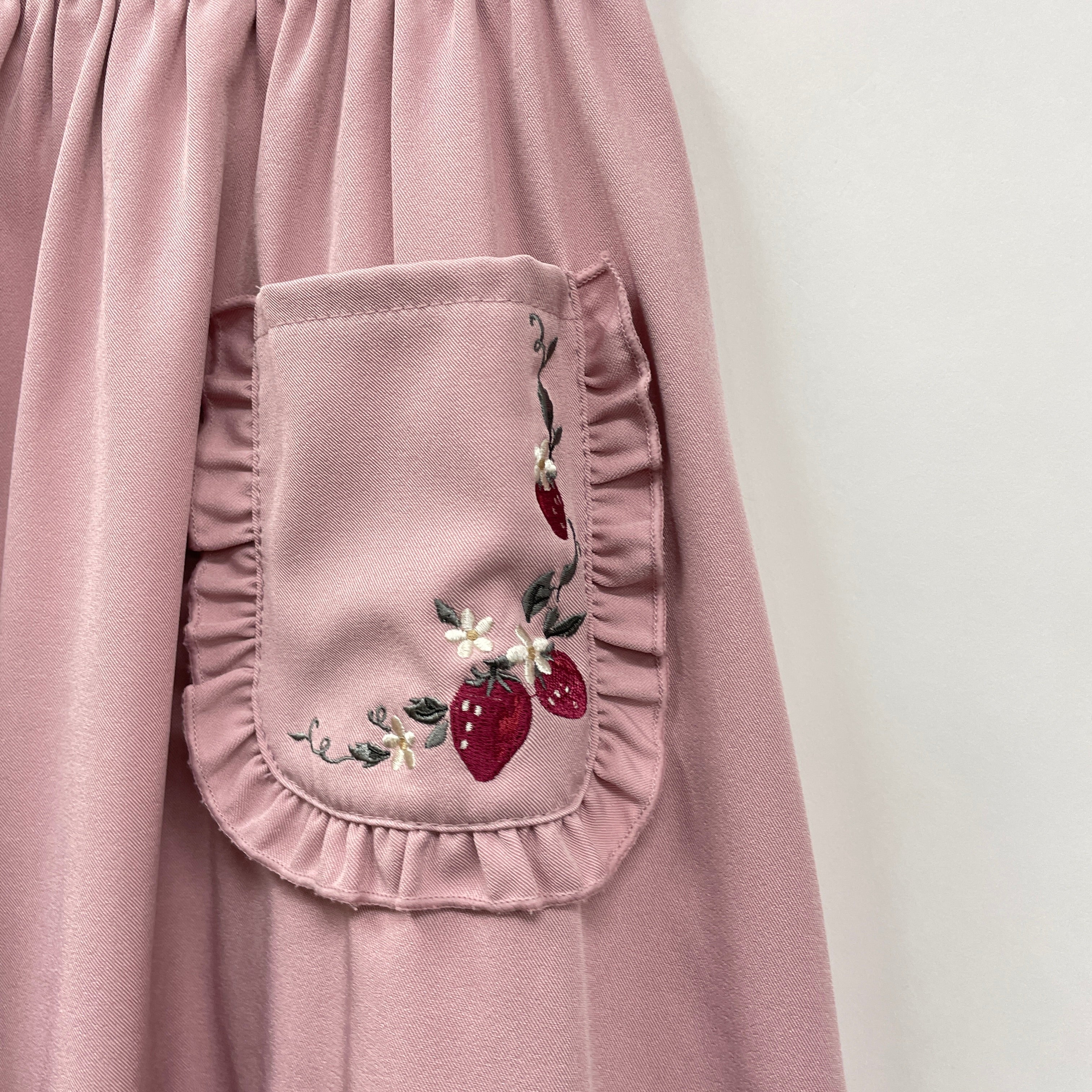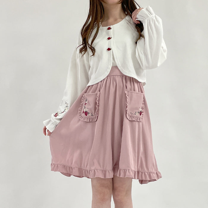 いちご柄刺繍をあしらったリボンが可愛らしいサス付スカートです。