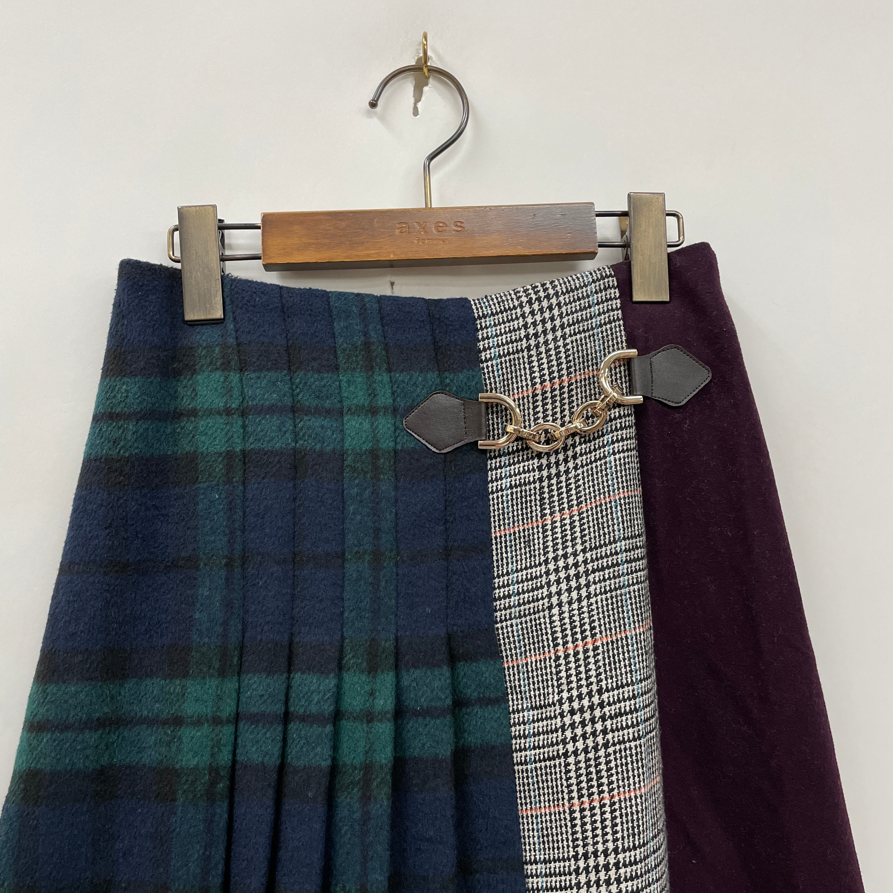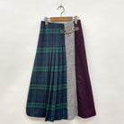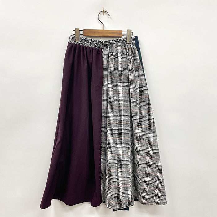 チェック柄や無地の生地をパッチワークしたデザインのスカートです。起毛した素材を使用しており寒い季節にぴったりです。すっきりとしたシルエットですが窮屈感はなく着心地◎、さりげないタックデザインとチェーンがポイントです。