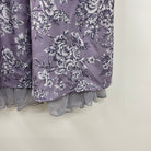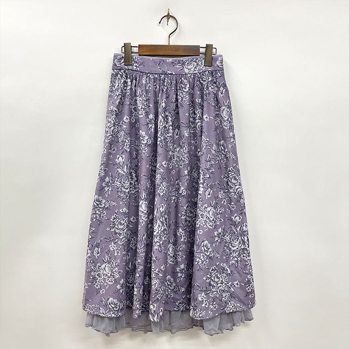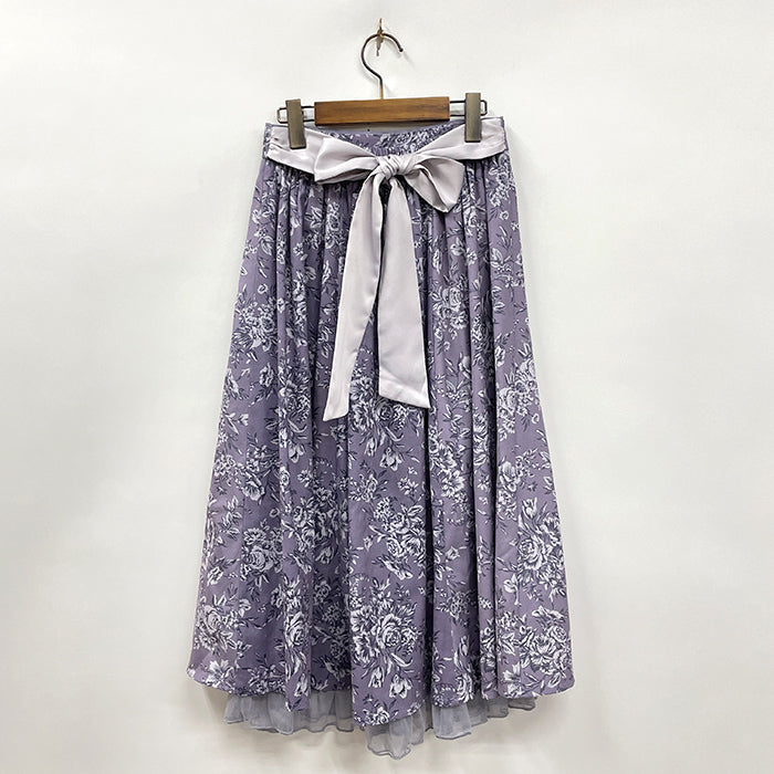 エレガントな花柄のミディ丈スカートです。大人っぽいカラー展開で、裾のチュールフリルが上品な1枚。ウエストのリボンはサイドでくっついており、結び目はお好みで前でも後ろでも◎。