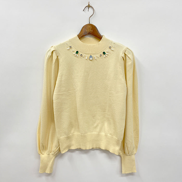 キラキラと反射するゴロゴロした大きめビジューが目を惹くニットプルオーバーです。