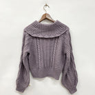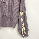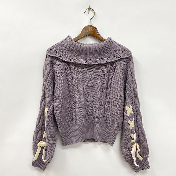 ボリューム感のあるシルエットがかわいらしいニットトップスです。編み柄がしっかり出る糸を使用しています。袖口にはベロアリボンで編み上げデザインがあしらわれておりフェミニンな印象に。