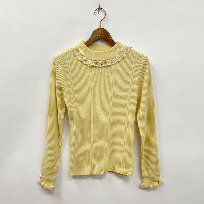 花柄のチュールレースやパール・ビーズをネックレスのように襟ぐりに施した、装飾性の高いデザイン。