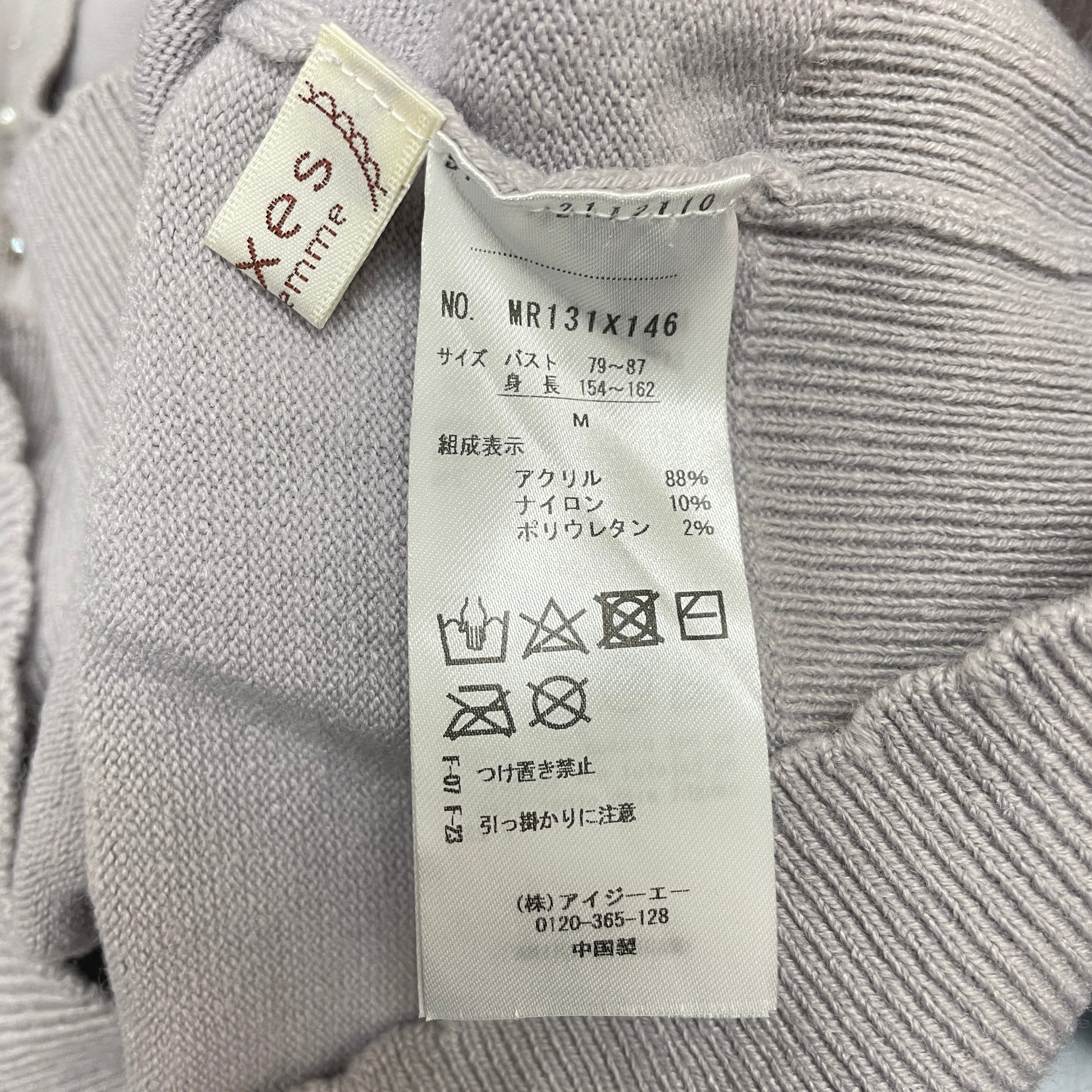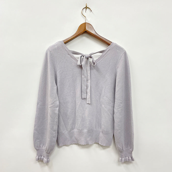ネックラインのビジューデザインがラグジュアリーなニットプルオーバー。手触りがよく着心地◎。ウエスト部分はややきゅっとしまっているのでしめつけすぎずスタイルよくみせる効果も。バックリボンデザインで後姿も可愛い1枚。