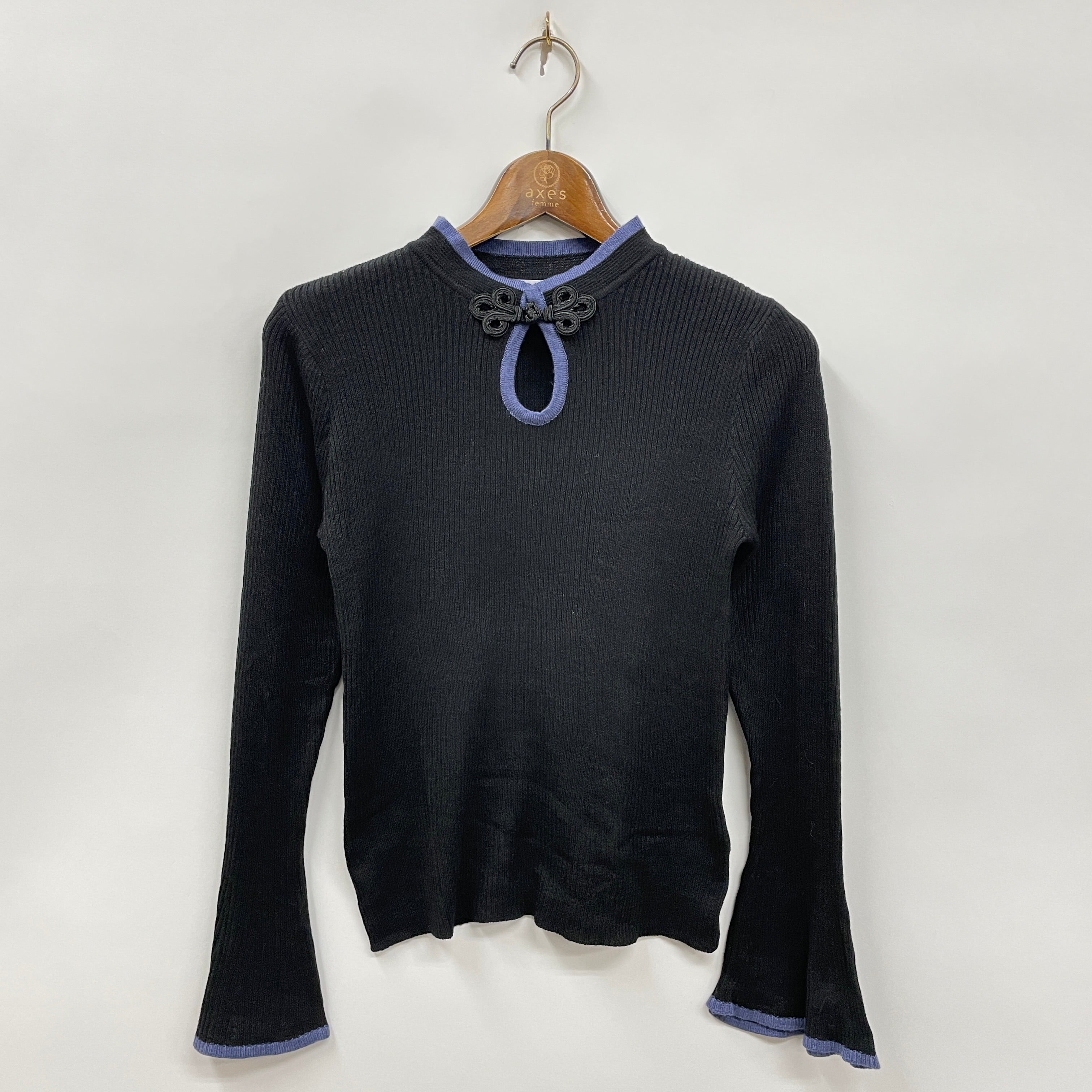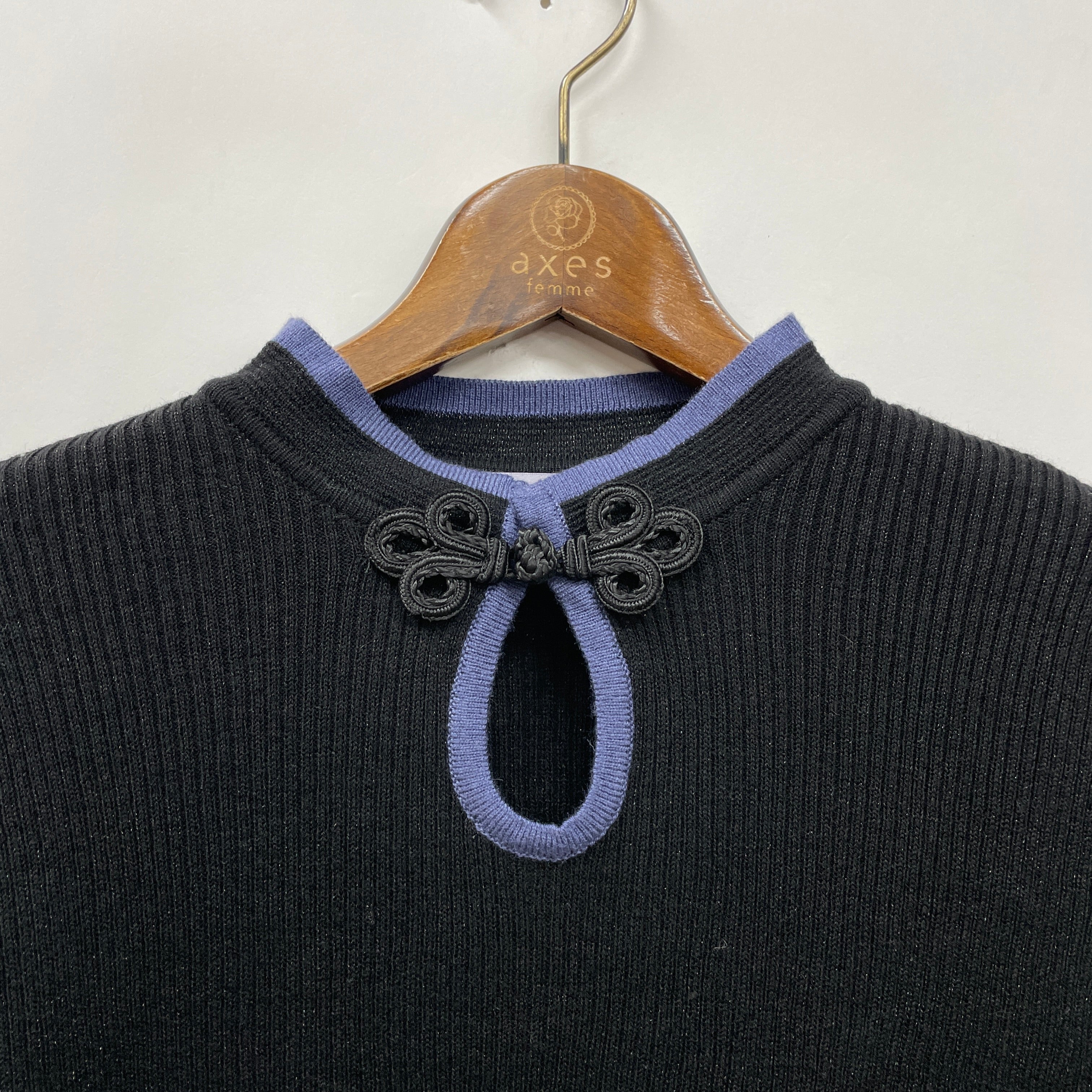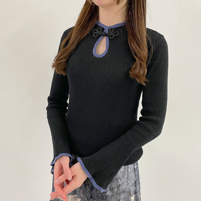襟元にあしらったチャイナボタンがアクセントになったニットプルオーバーです。