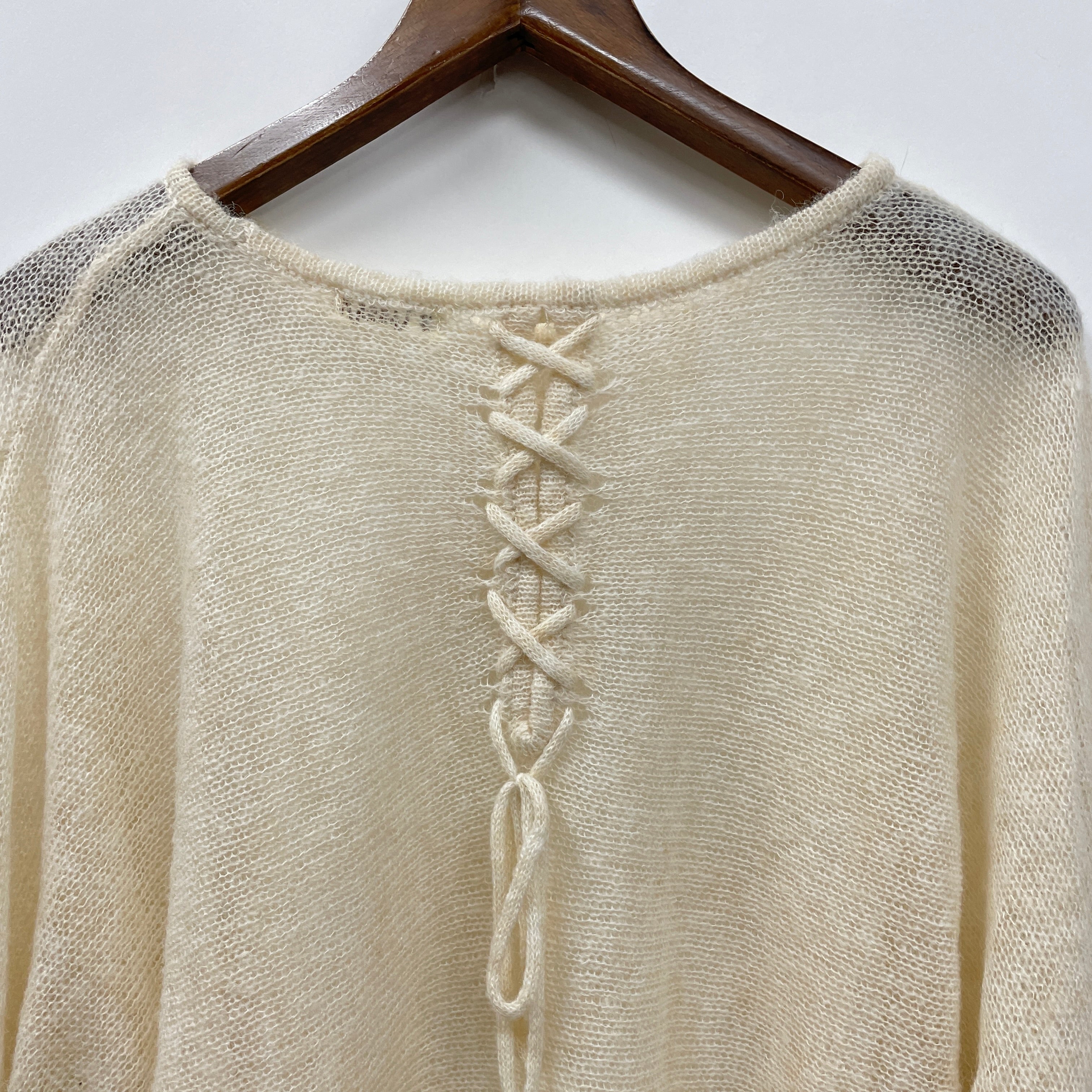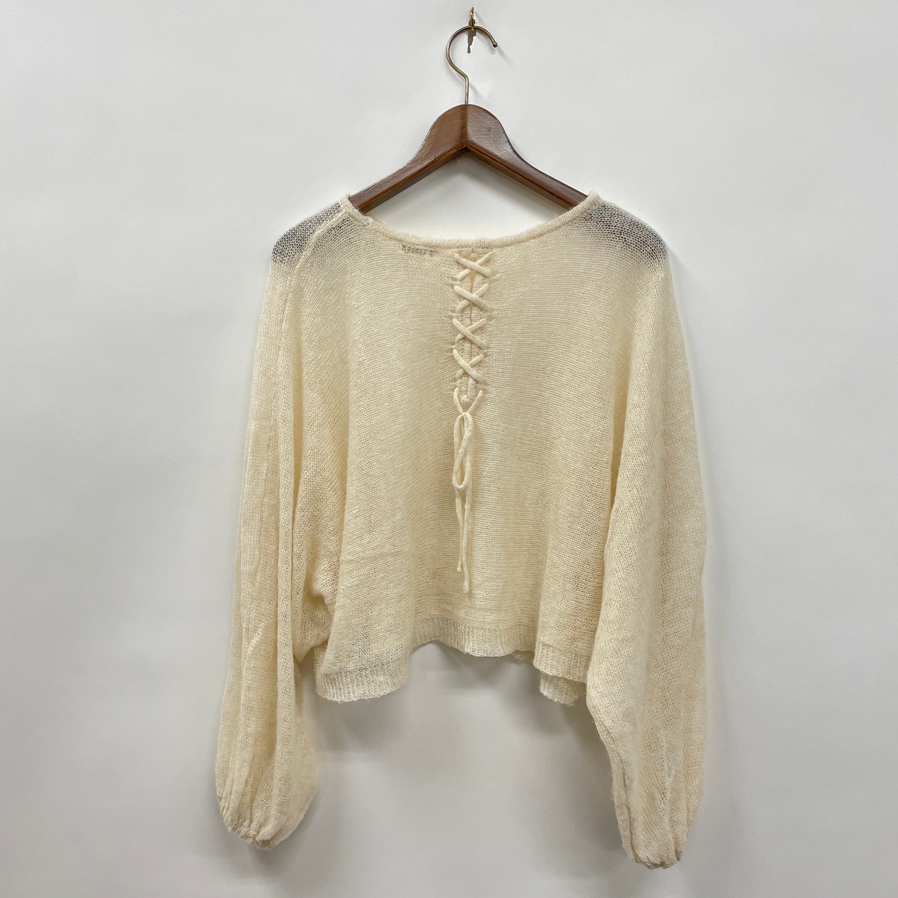 ゆったりとしたドルマンスリーブと、後ろのレースアップデザインがポイントの一枚です。