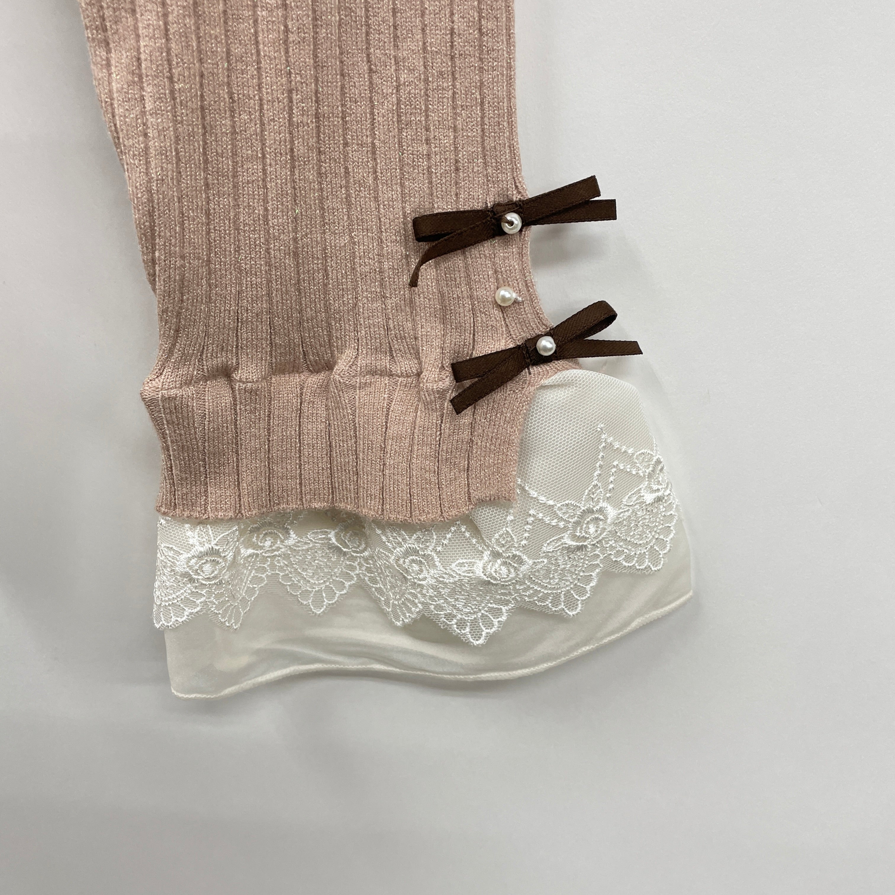 袖口ミニリボンの中央にはパールをのせ、フェミニンさをプラス。