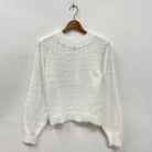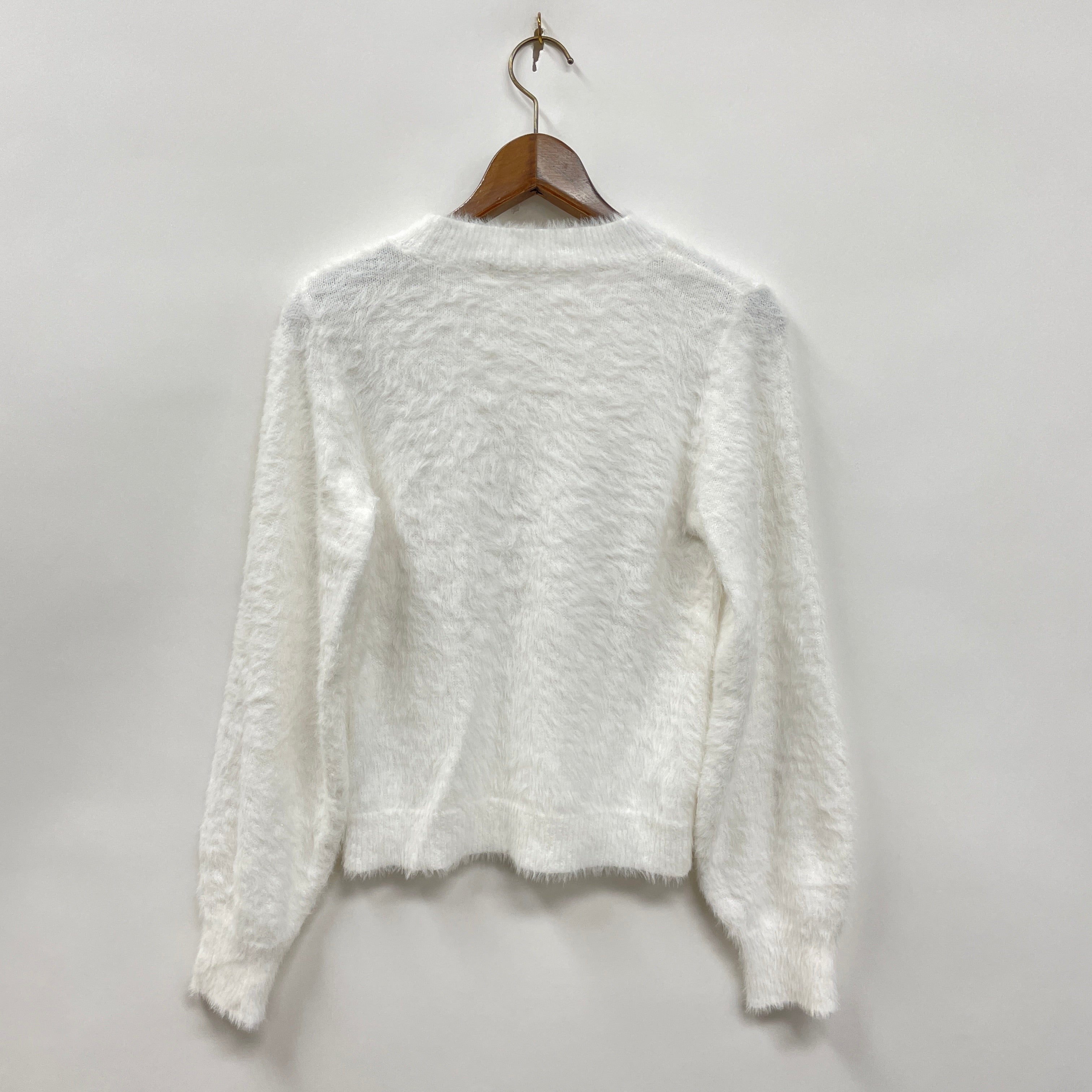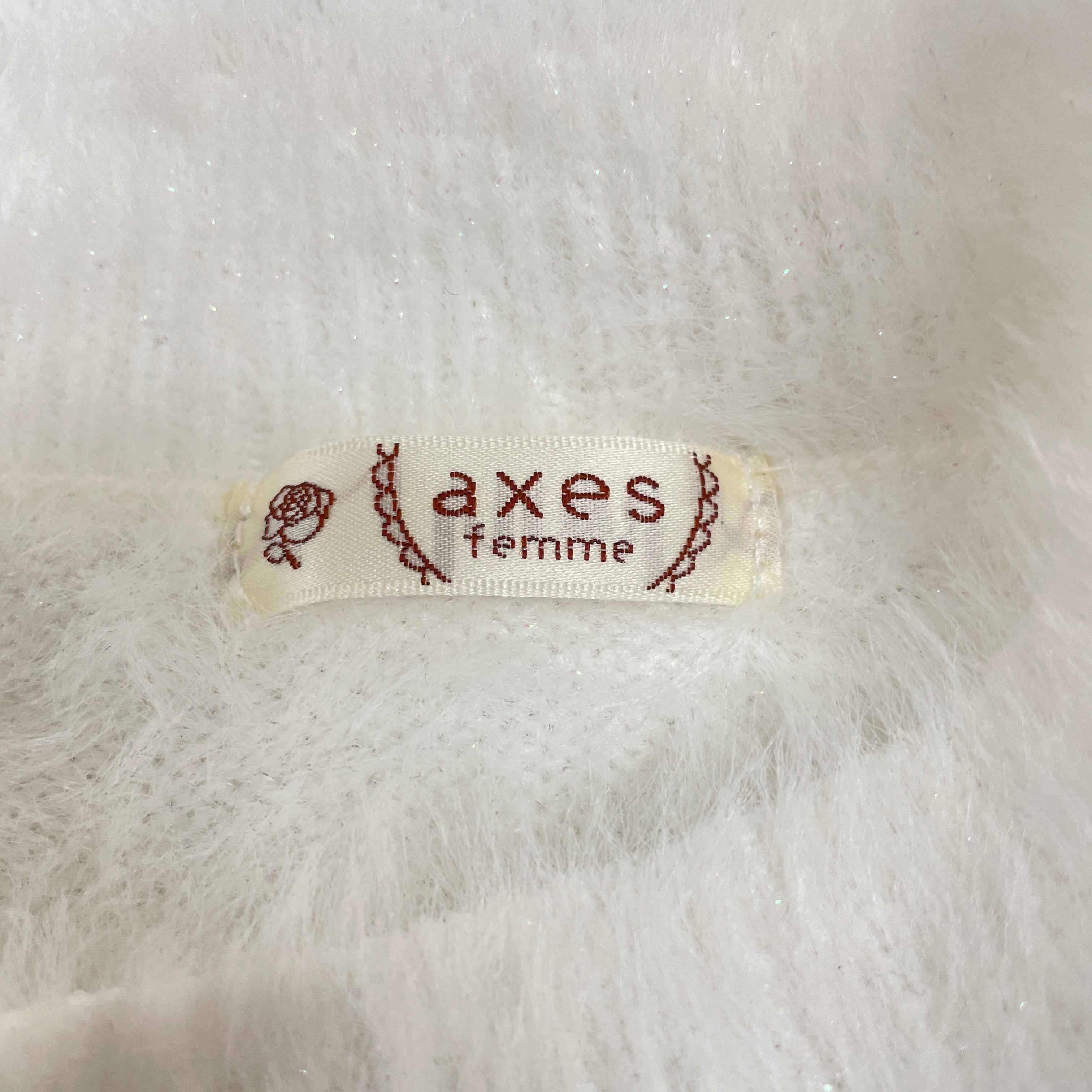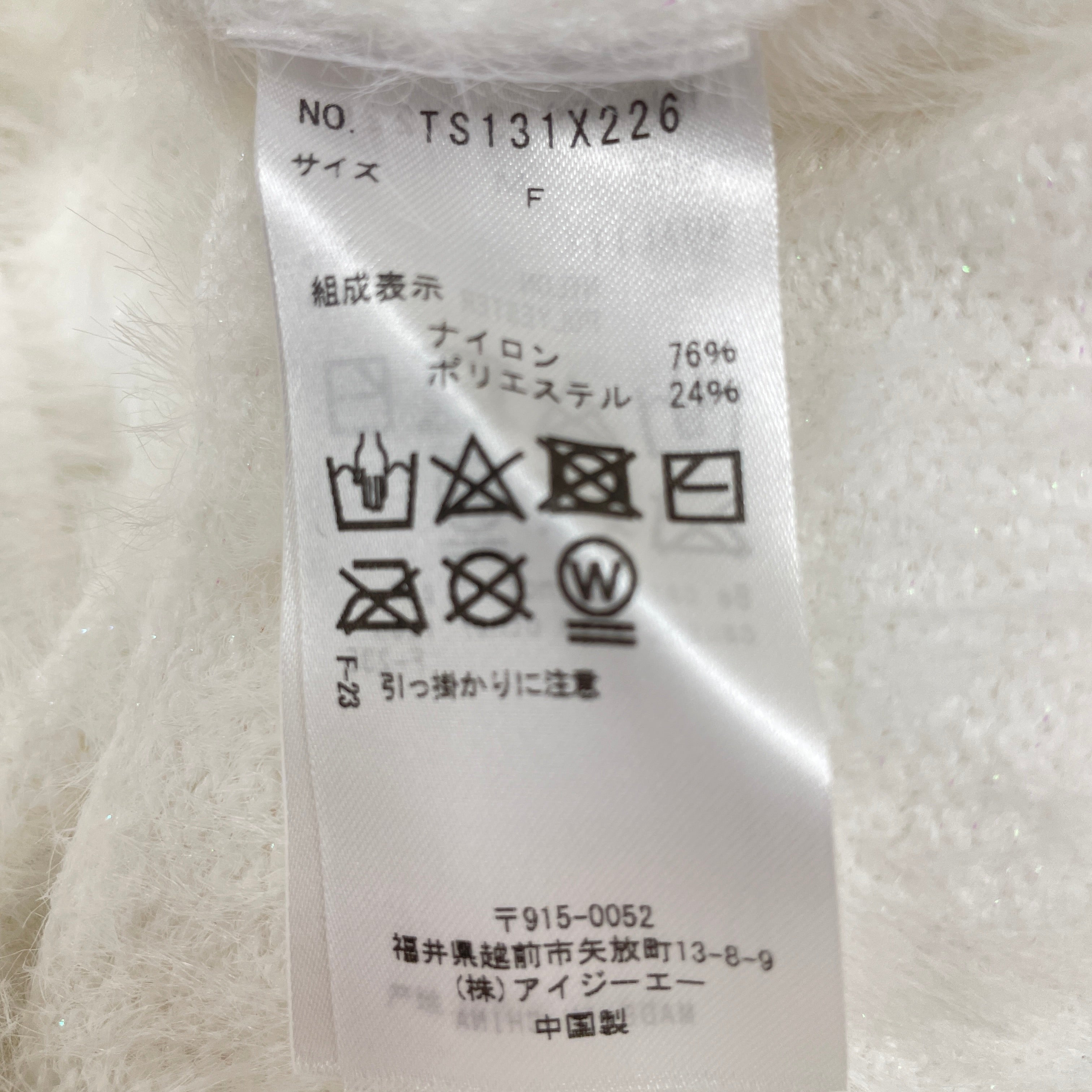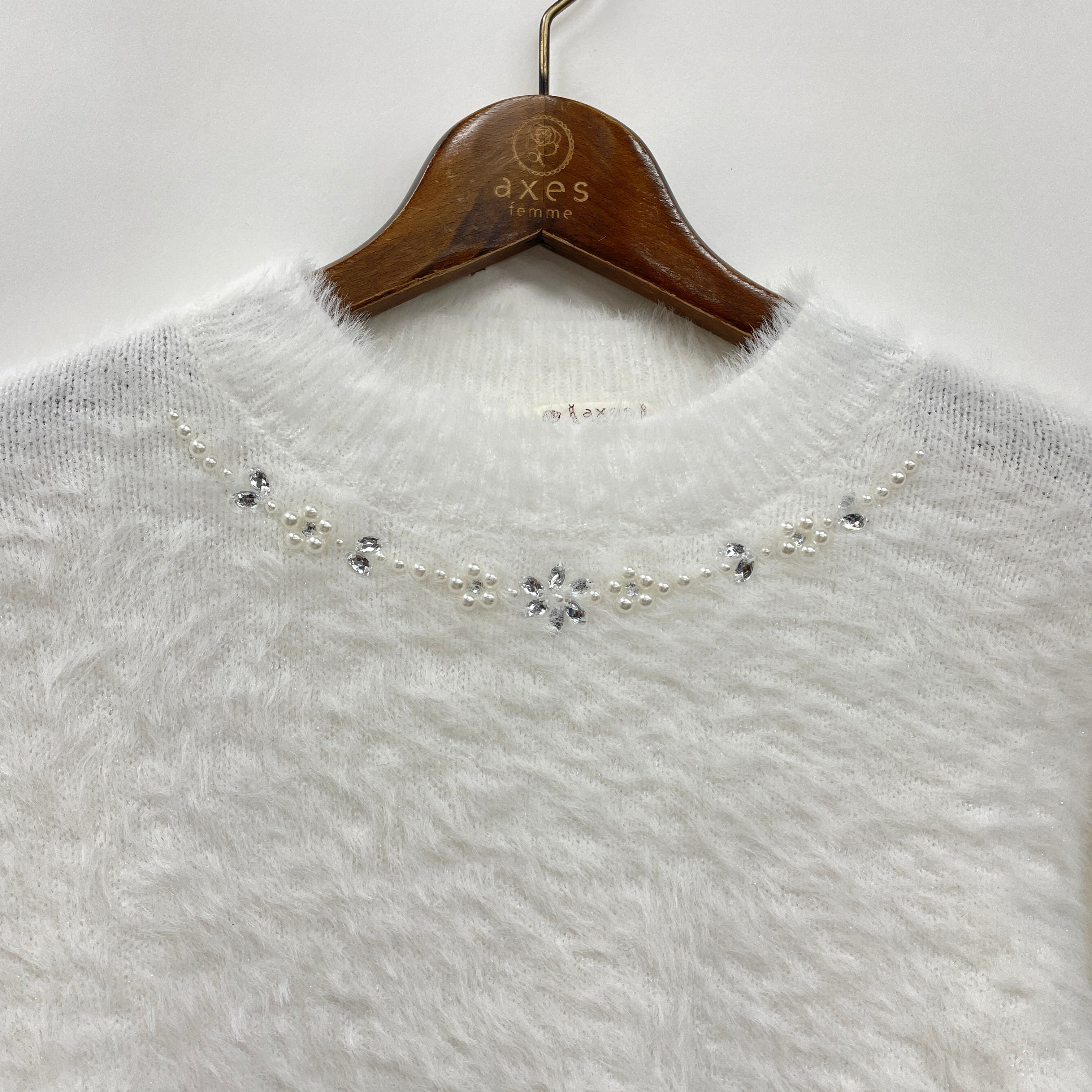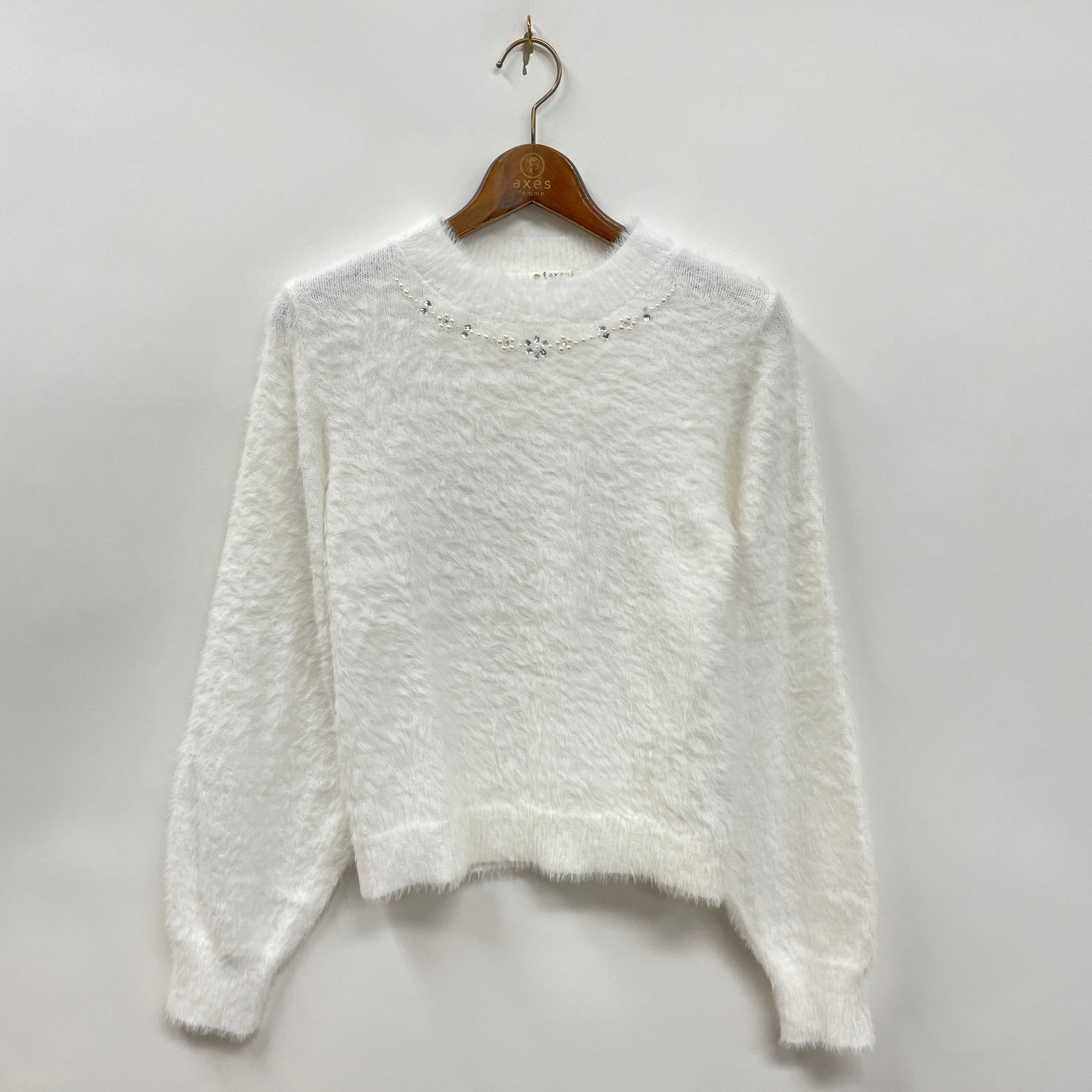 ふわふわもちもちなフェザーニットにパールでかたどったお花モチーフがポイント。