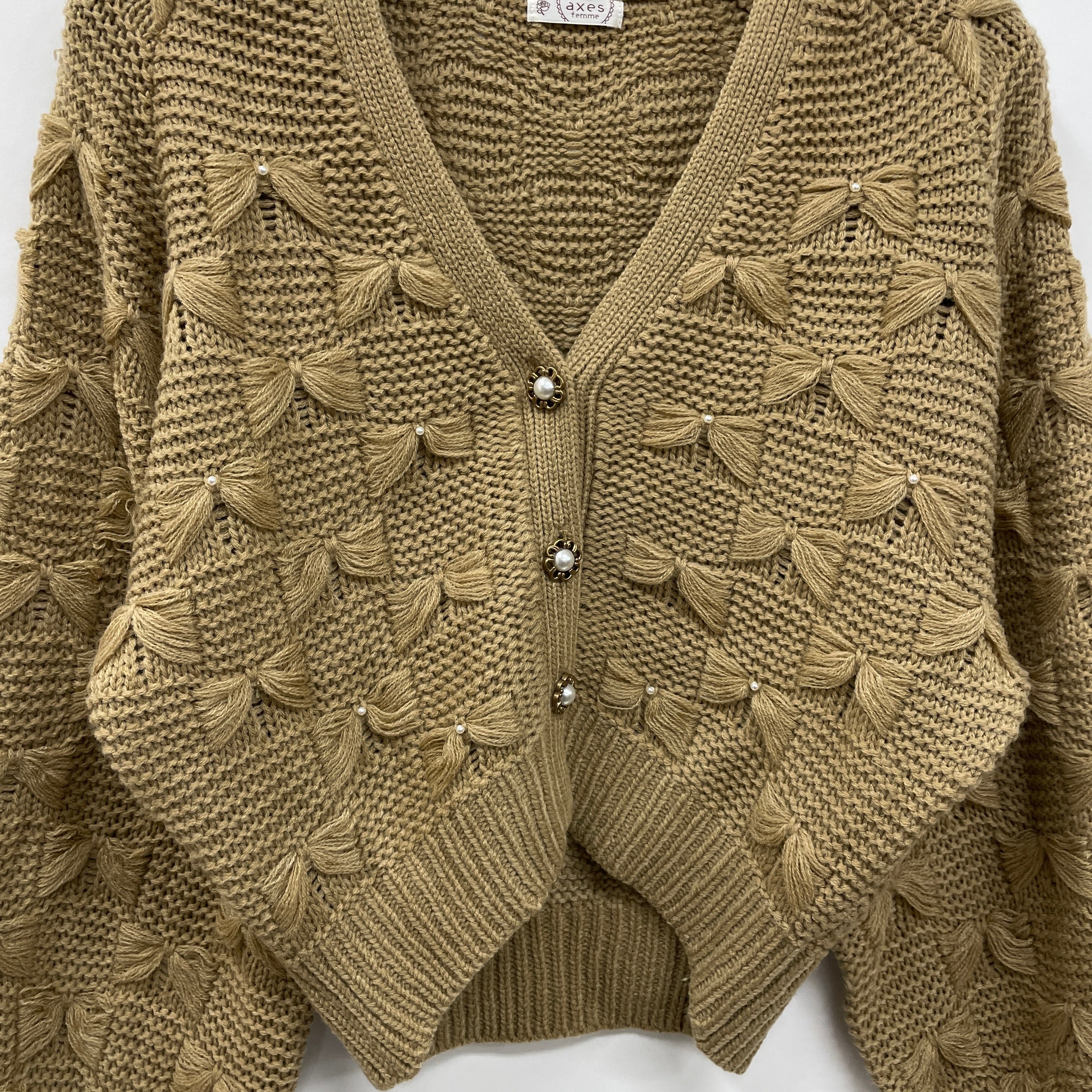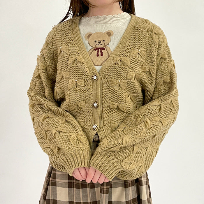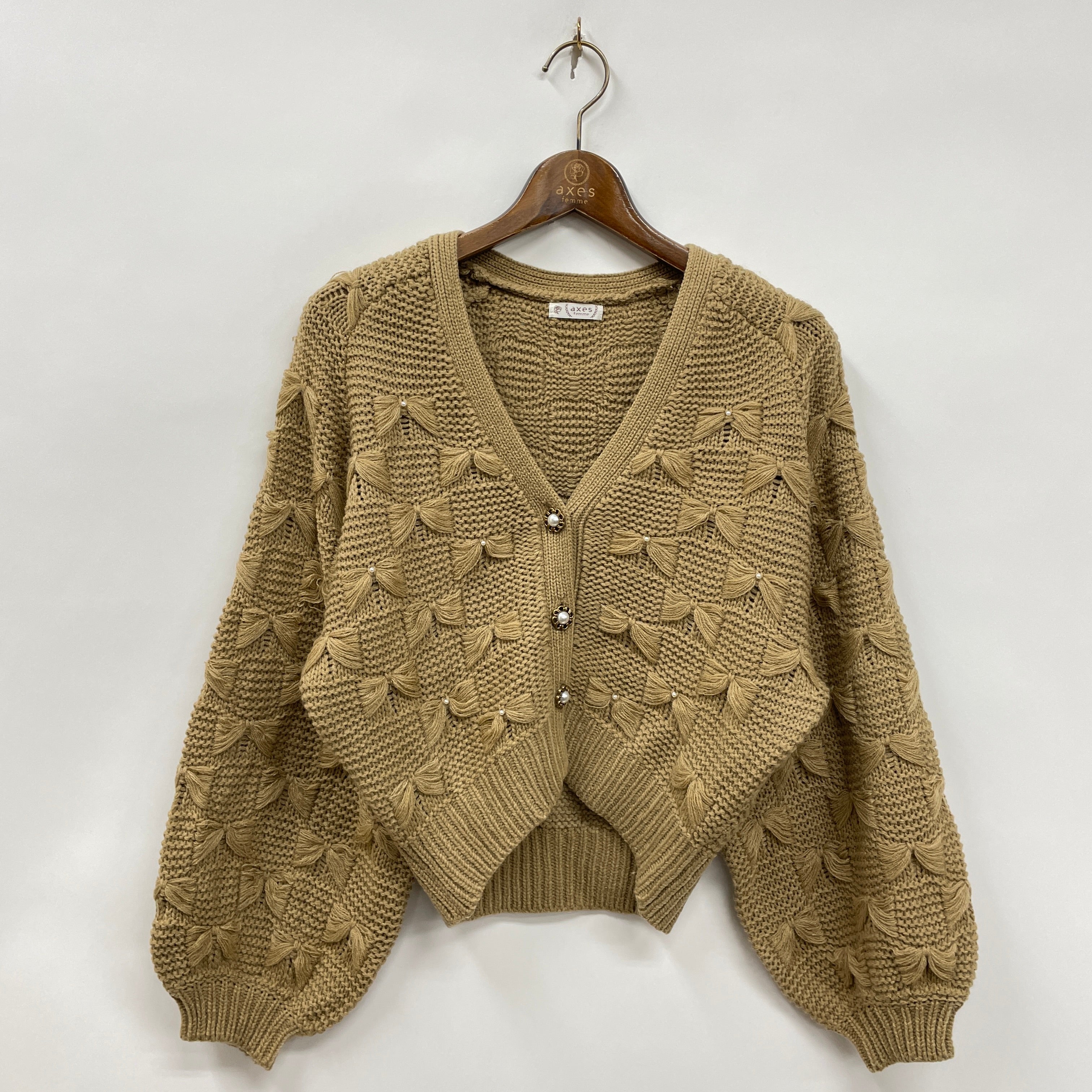 リボンのような編み目がポイントのニットカーディガン、ゆったりサイズでインナーを選ばずご着用できます。ワンピースやロング丈のボトムスと相性◎です!フロント部分には手付けでパールが施されきらっとかわいいポイントに。