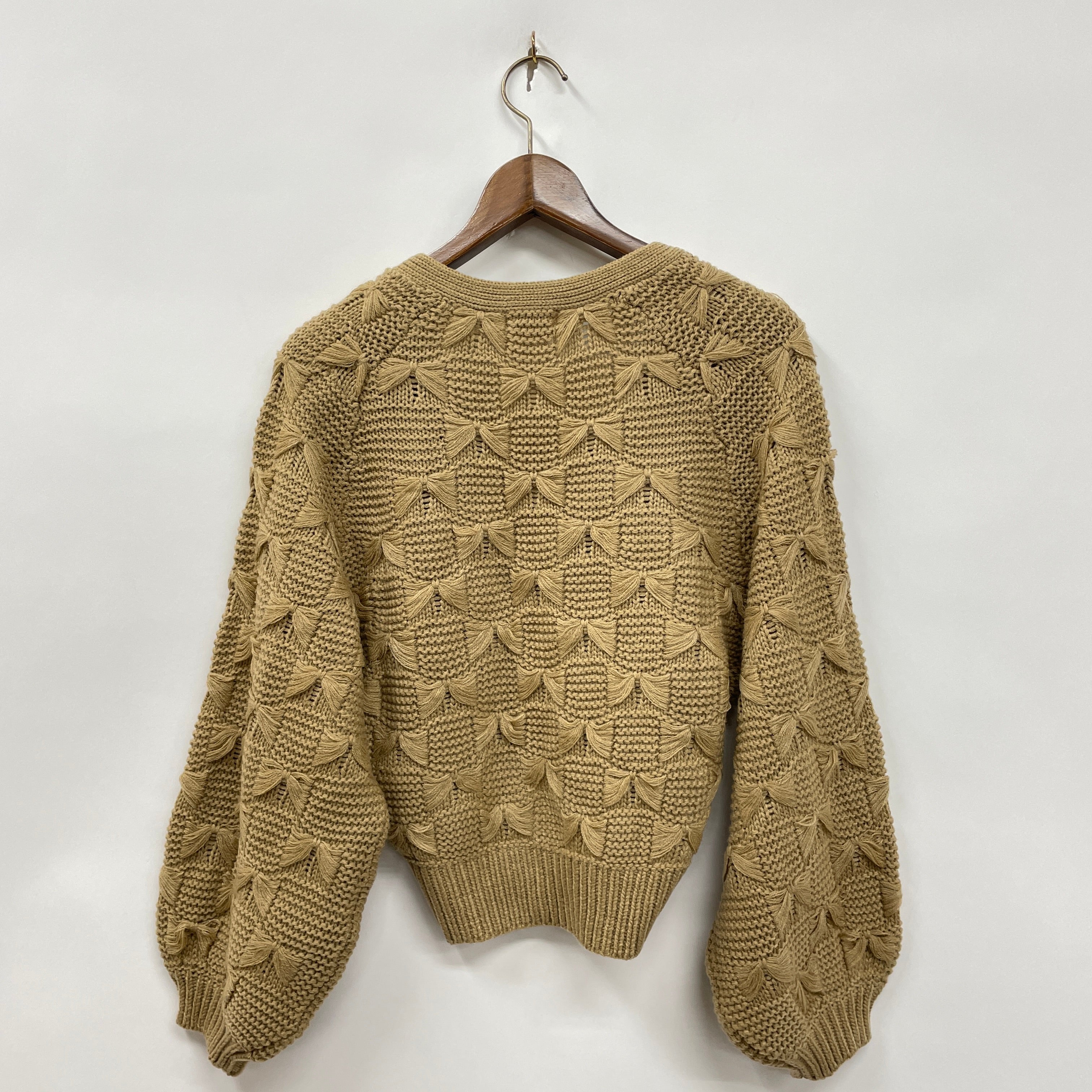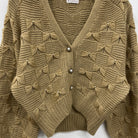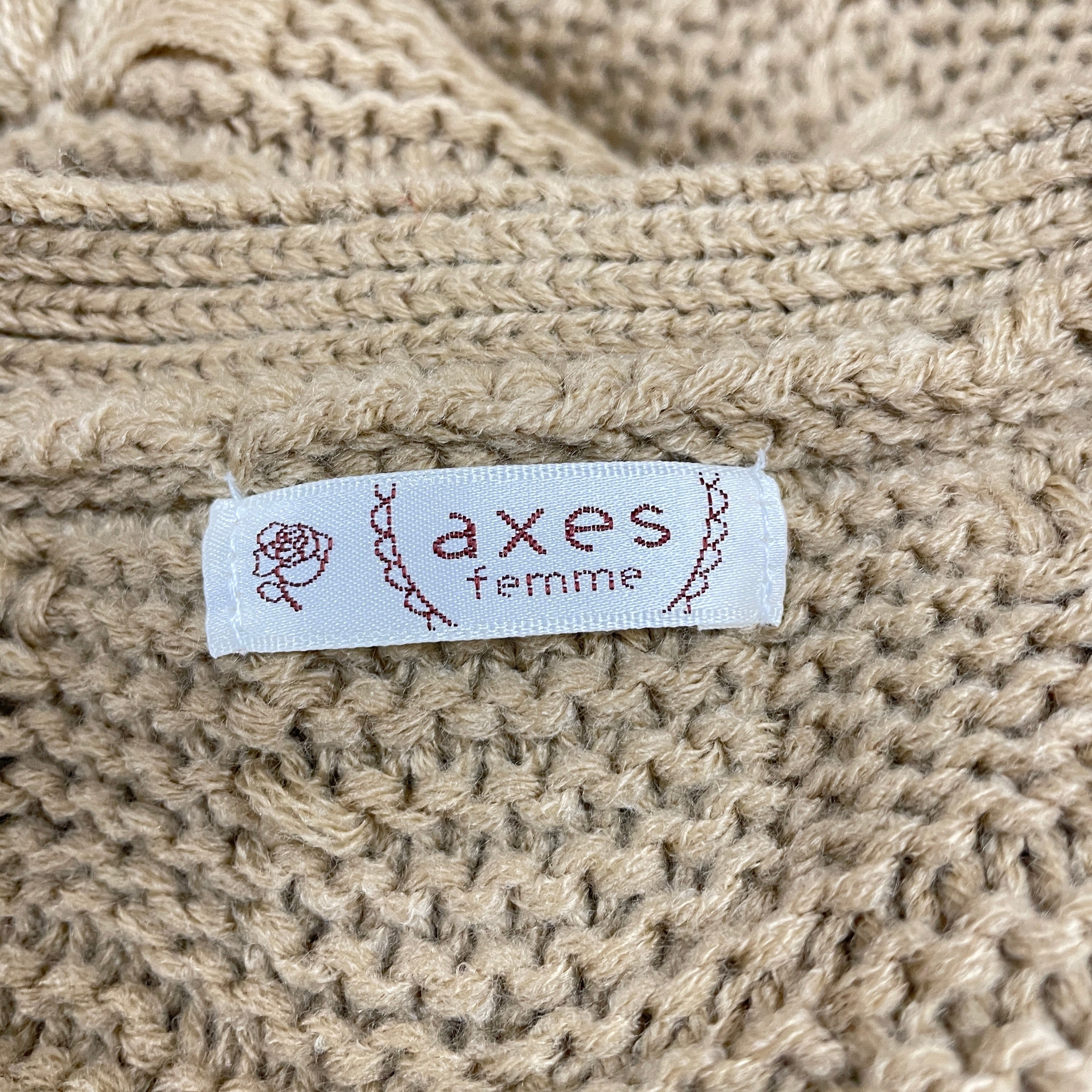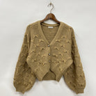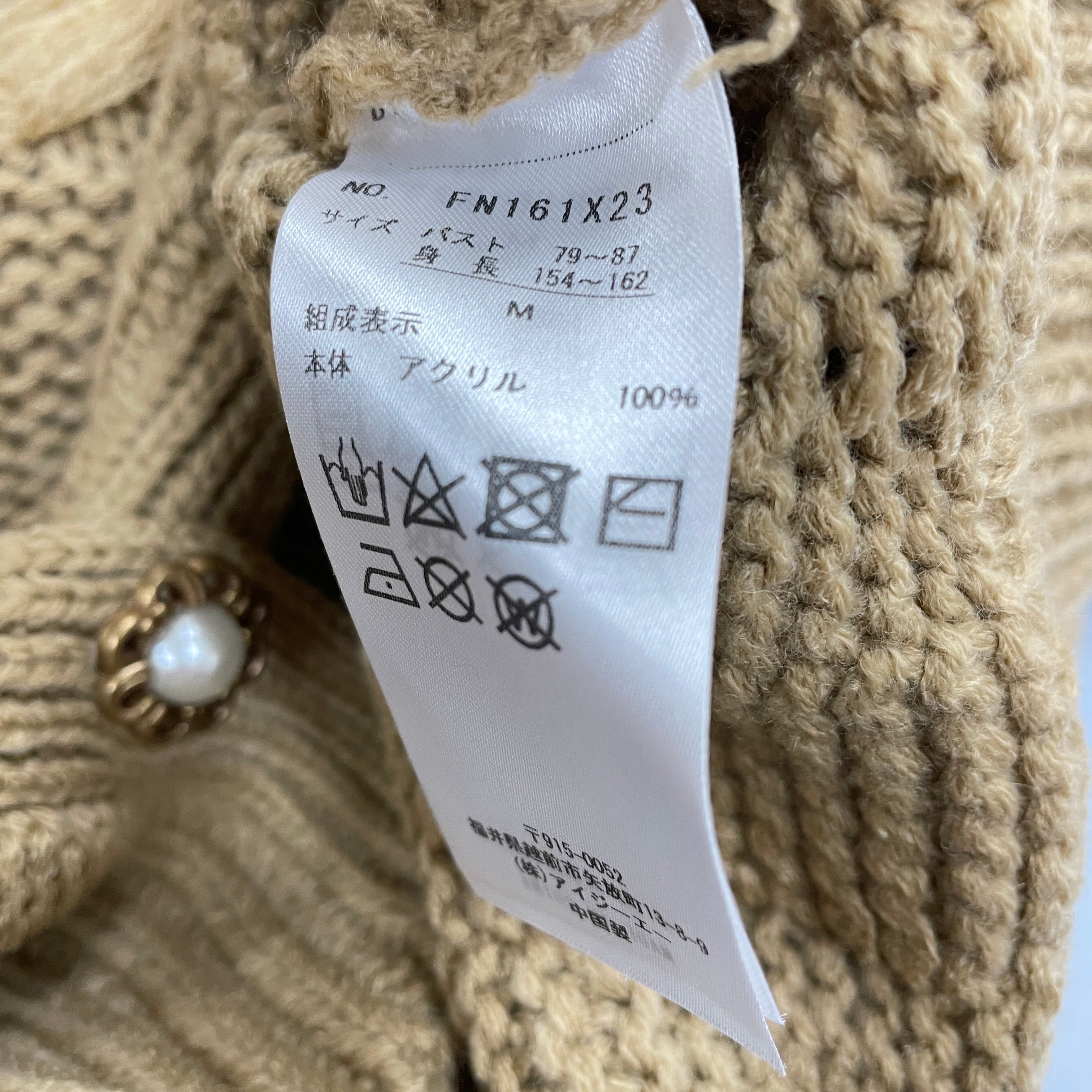 リボンのような編み目がポイントのニットカーディガン、ゆったりサイズでインナーを選ばずご着用できます。ワンピースやロング丈のボトムスと相性◎です!フロント部分には手付けでパールが施されきらっとかわいいポイントに。