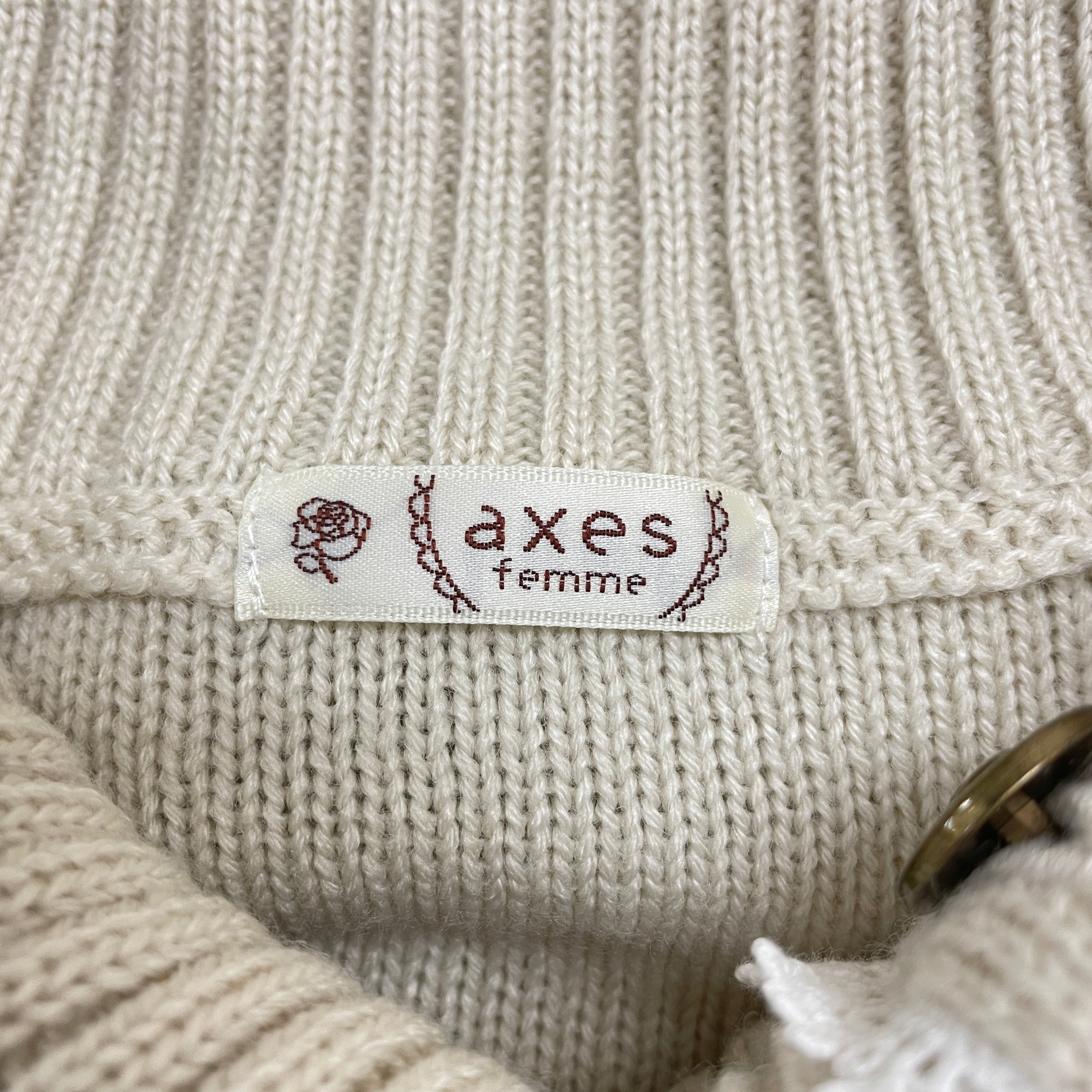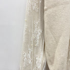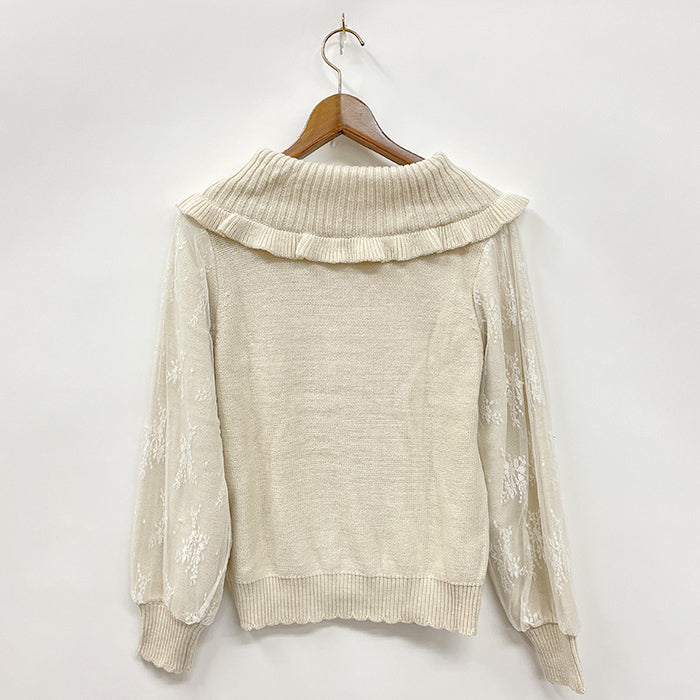 袖に繊細な柄のレースを重ねたデザインのニットプルオーバーです。レースの上にパールがあしらわれているのがポイント。毎年人気のオフタートルは、中にスタンドカラーのレースインナーなどを合わせるのがオススメです。スカートスタイリングにもパンツスタイリングにも合わせやすい万能アイテムです。