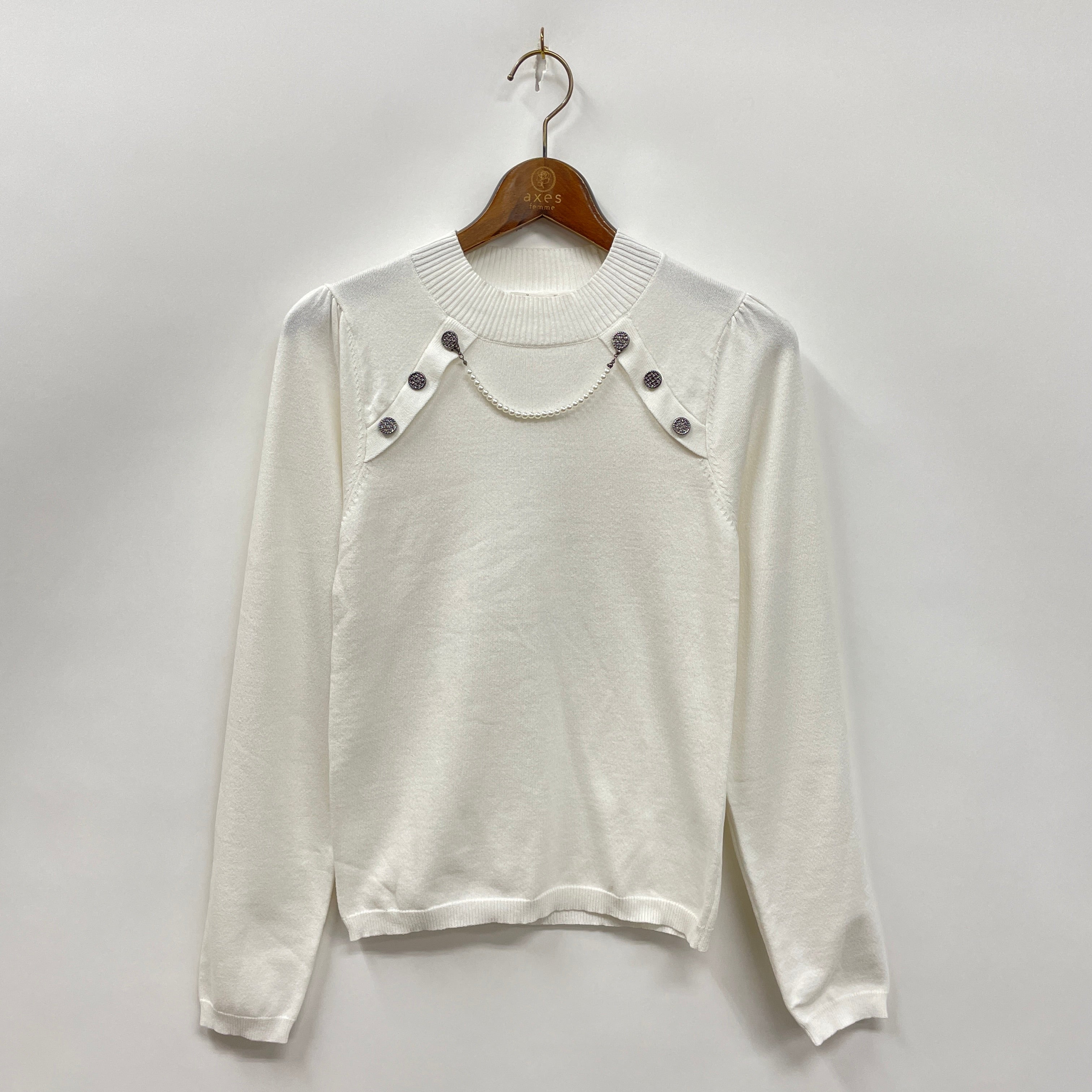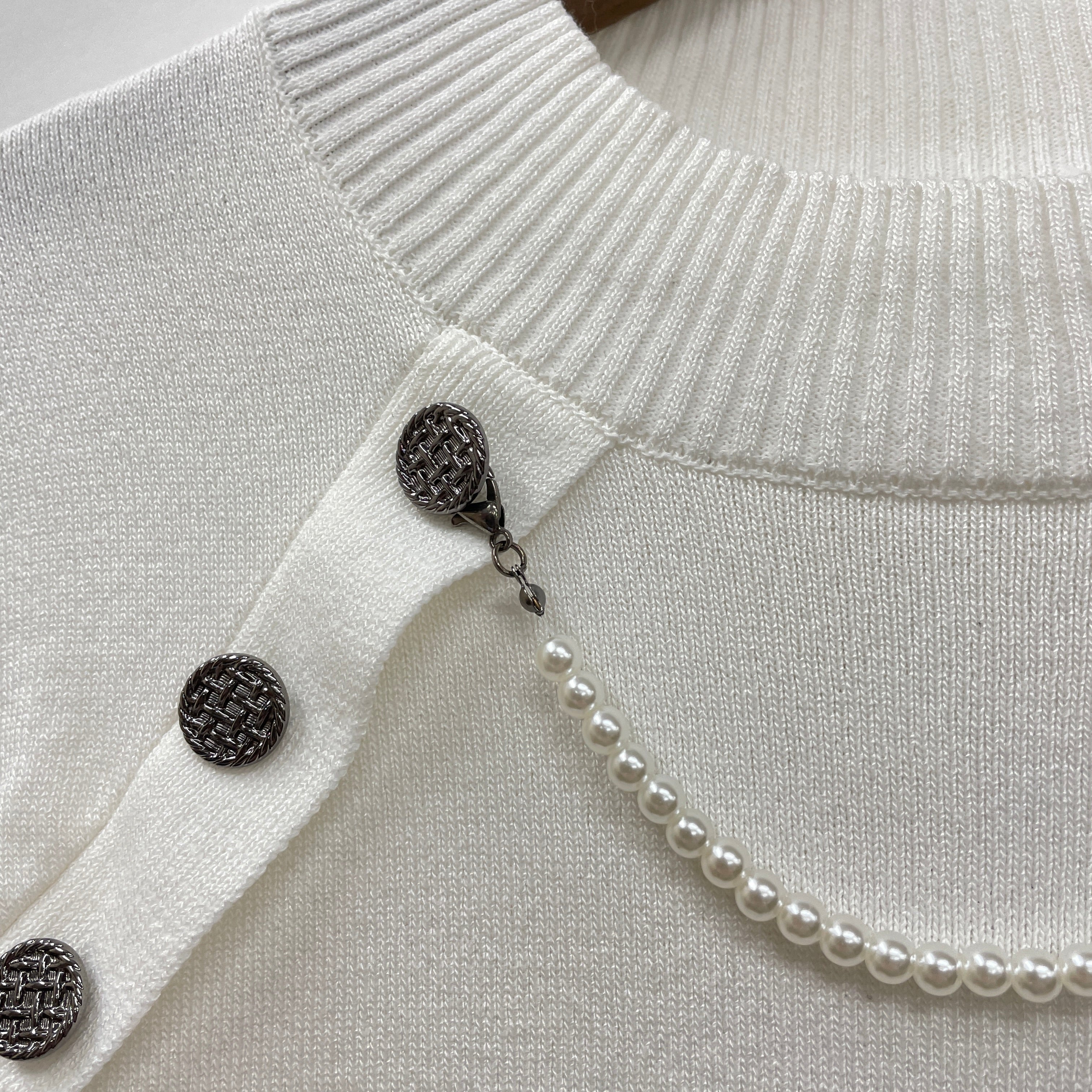 取り外しのできる上品なパールネックレス風の付属品がセットになっています。ボタンの留めつけ部分にひっかけていただくと簡単に取り付けていただけす。