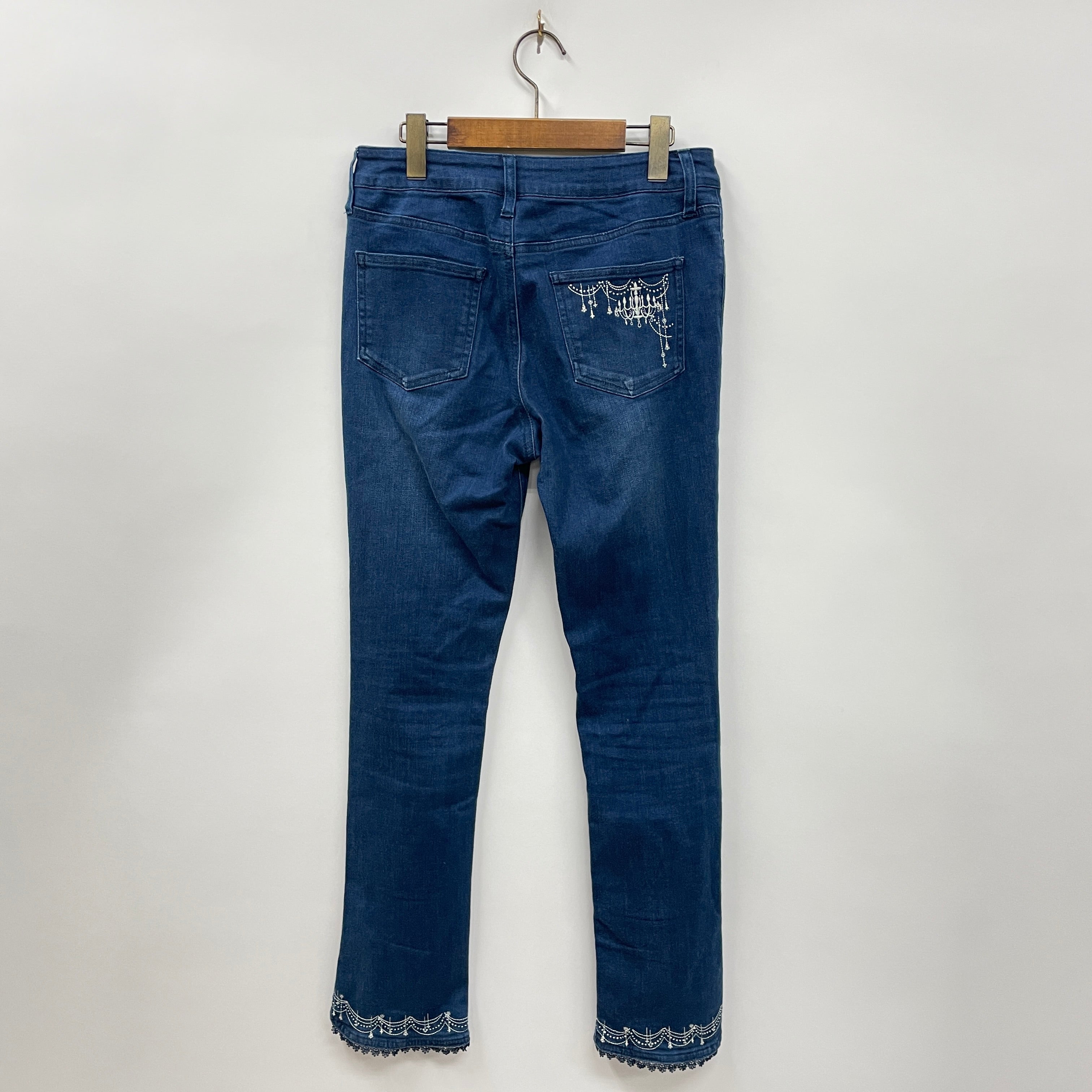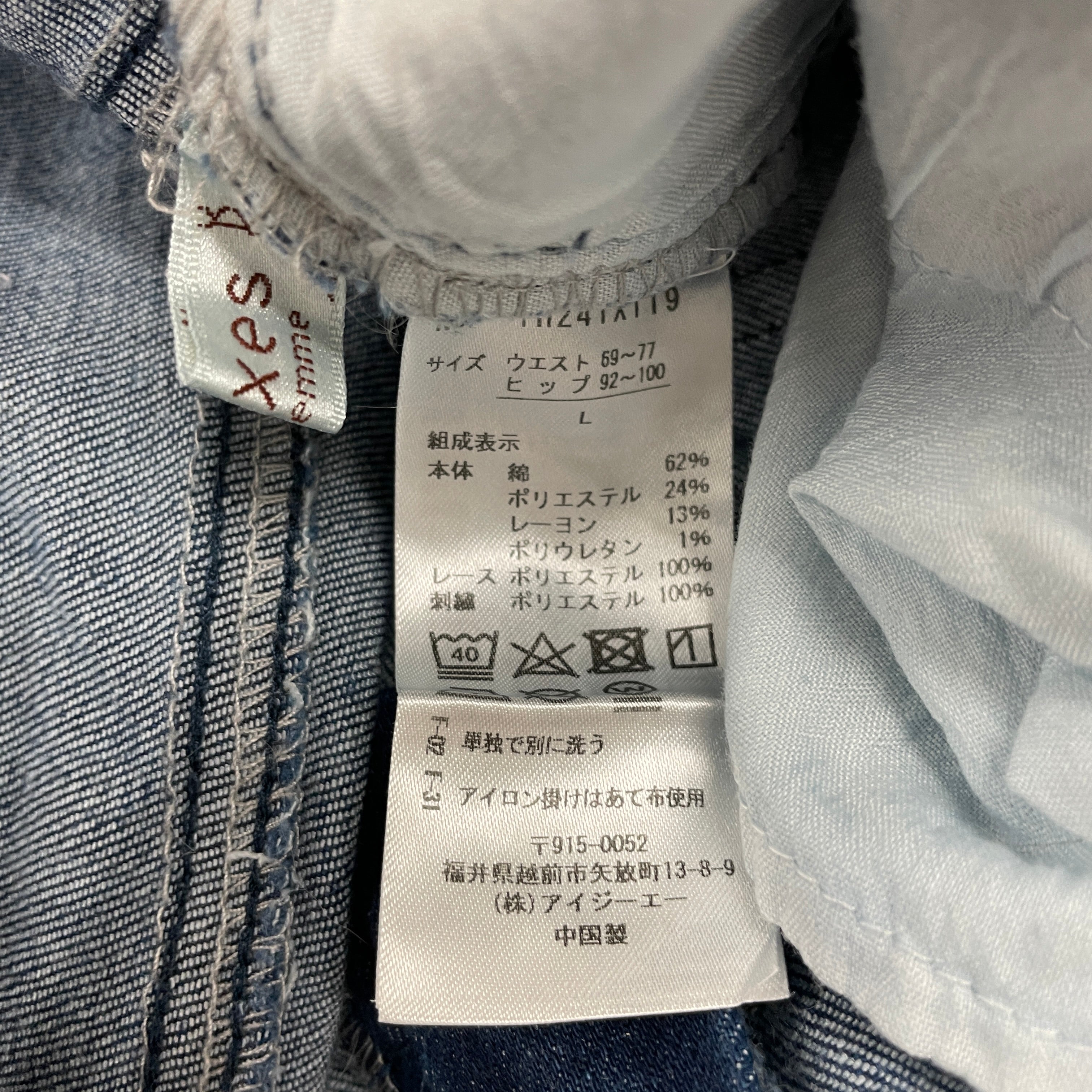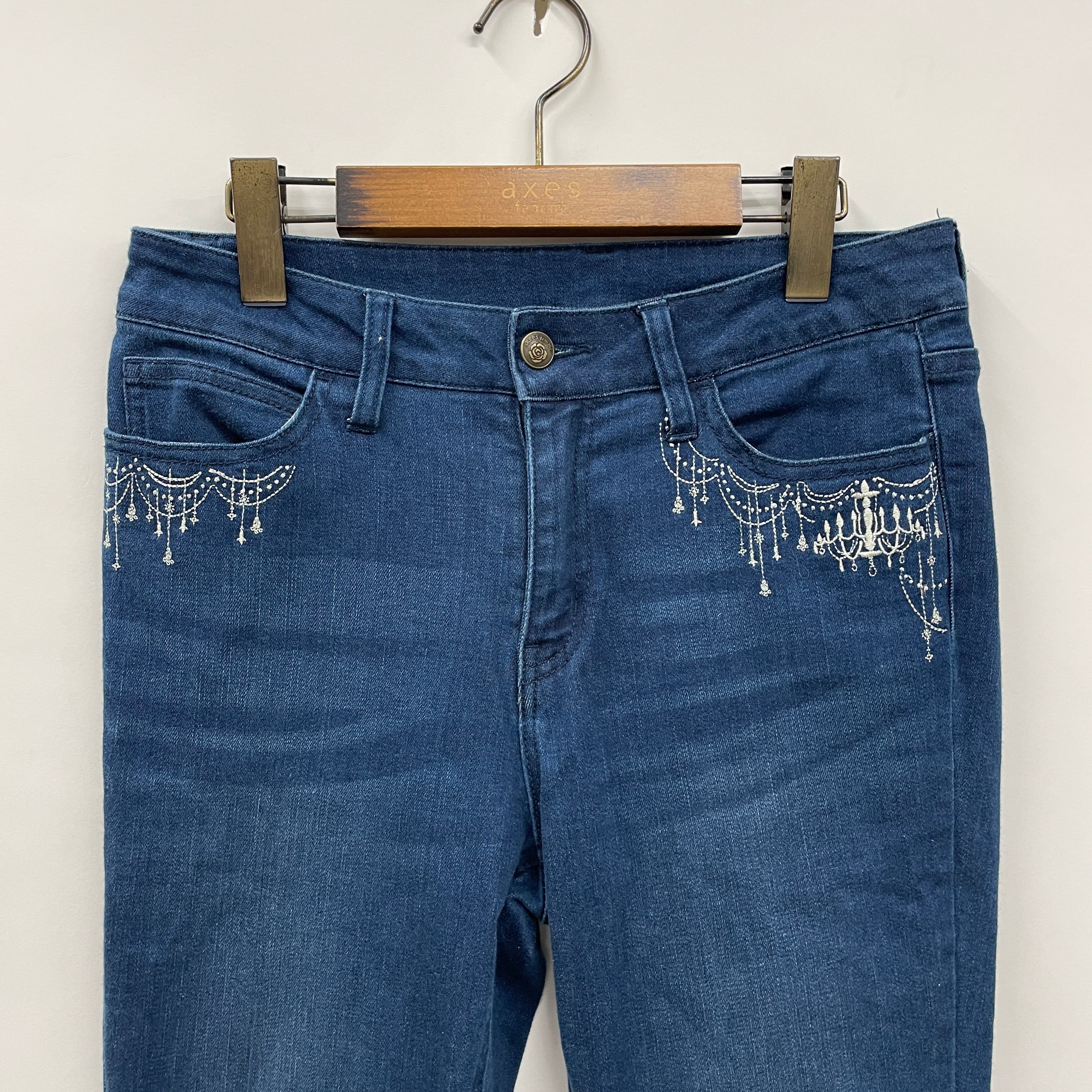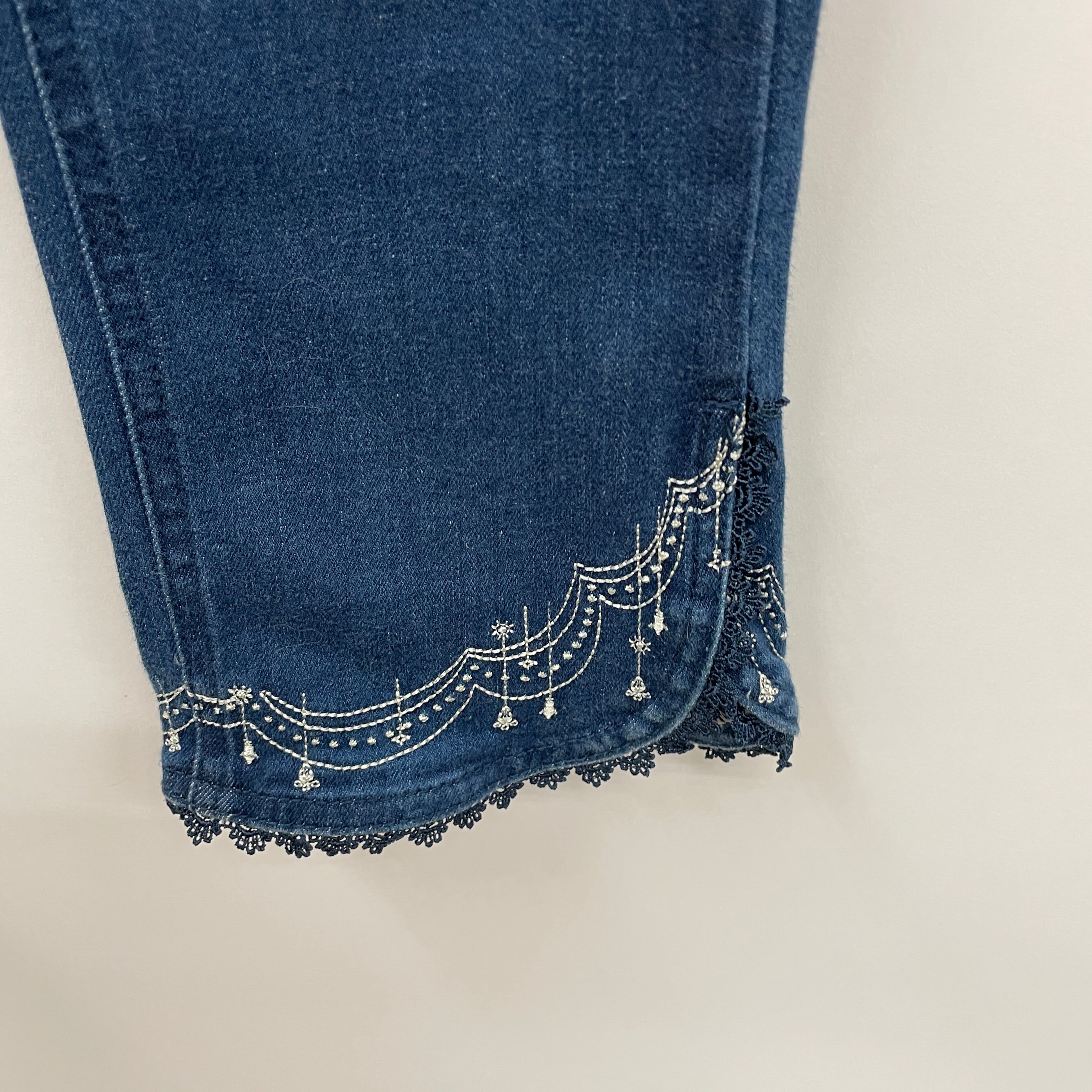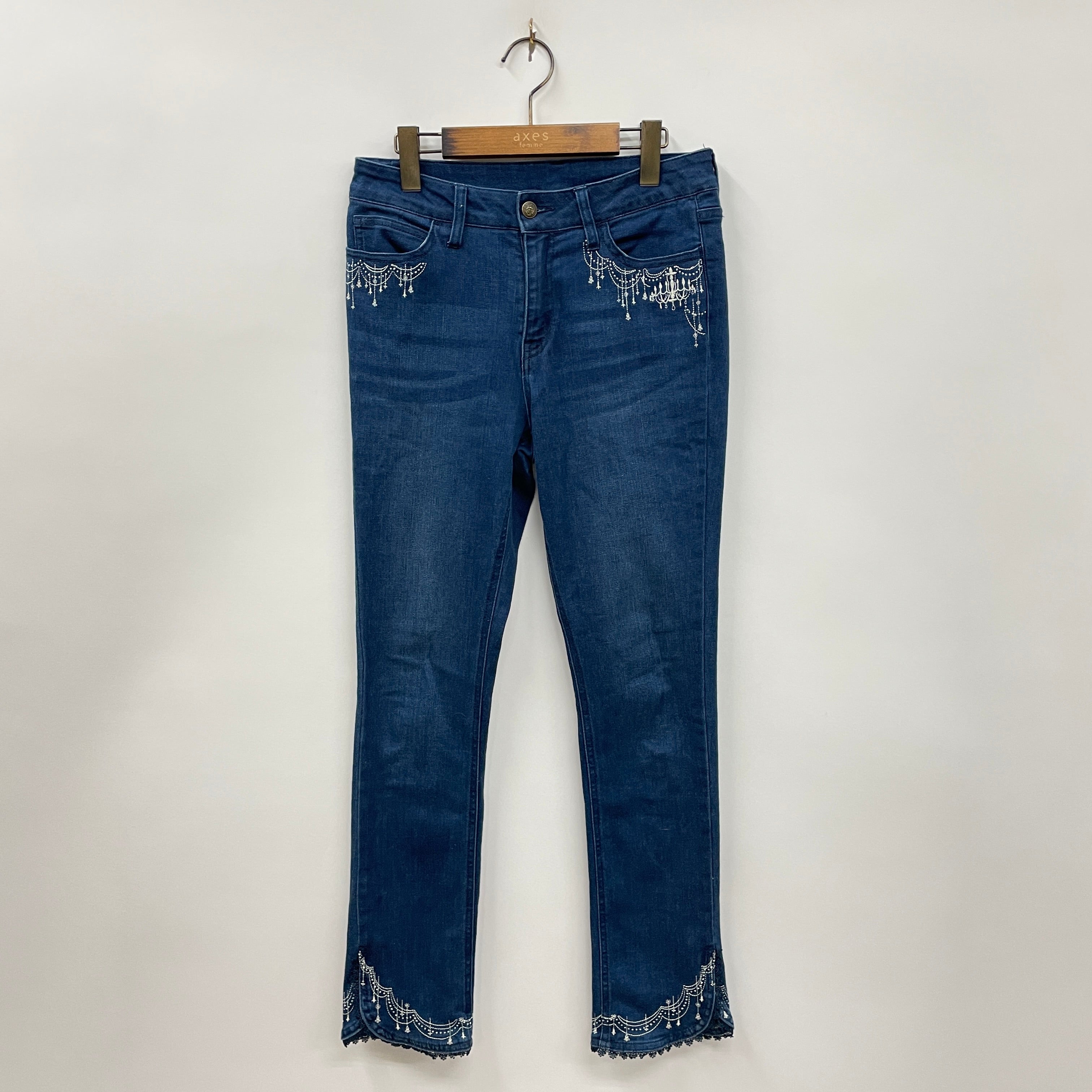 アンティークなシャンデリアやタッセルなどのモチーフの刺繍が施されたaxes femmeらしいデニムパギンスです。裾まで刺繡が施されている為、ウエスト周りの刺繡が隠れてしまっても華やかさがあるデニムパギンスです。後ろウエストはゴム仕様で生地は伸縮性の良い素材を使用しているため動きやすく履き心地も◎