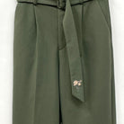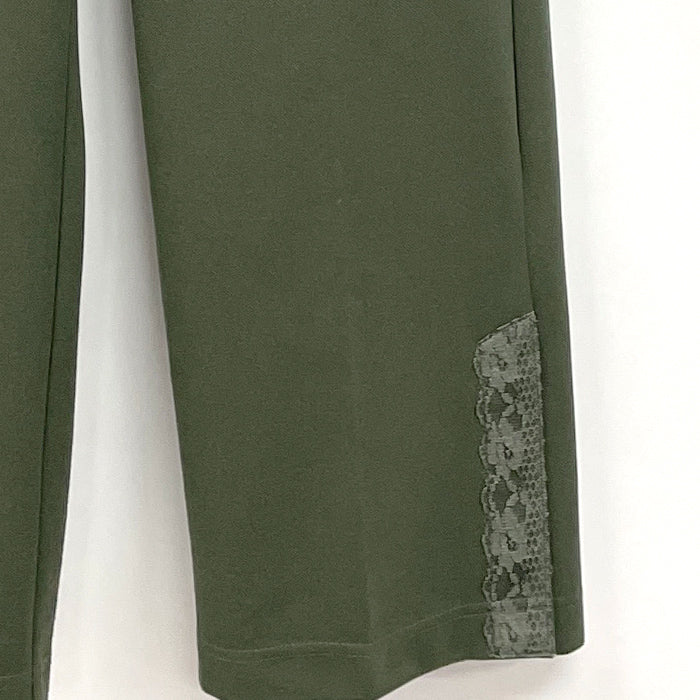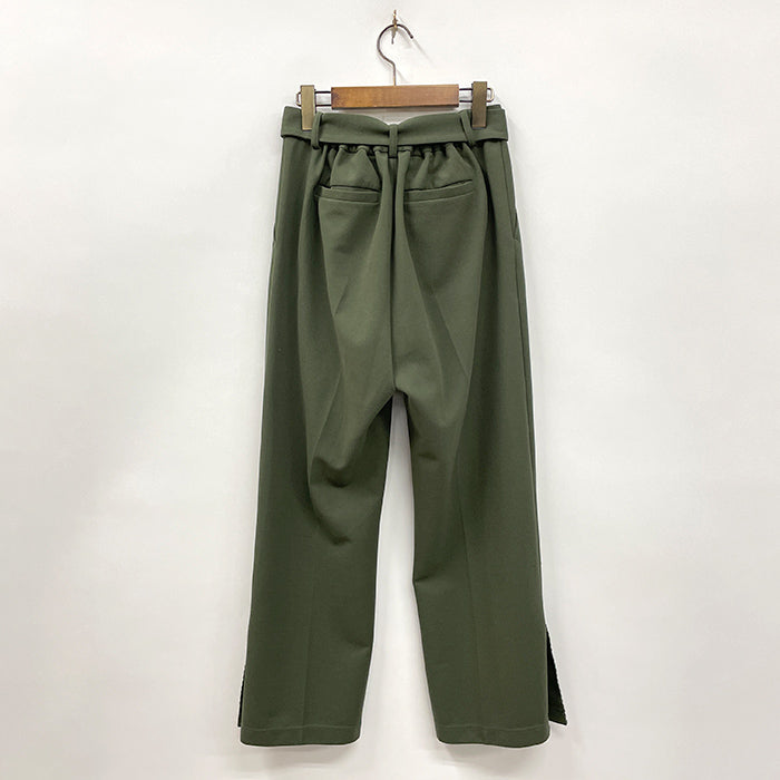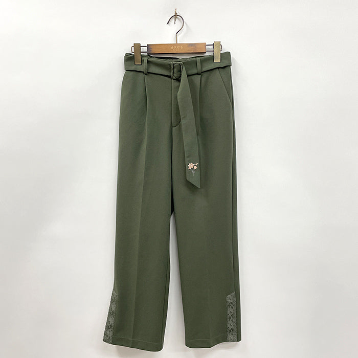 ベルト先にワンポイントで花刺繍の入ったカットパンツです。裾はスリットデザインになっており、隙間からのぞくレースがポイント。柔らかくて伸縮性の良いカット素材を使用している、トレンド感のあるアイテムです。すっきりしたシルエットですが、ウエストは後ろがゴムの仕様なため安心して履ける便利な1枚です。