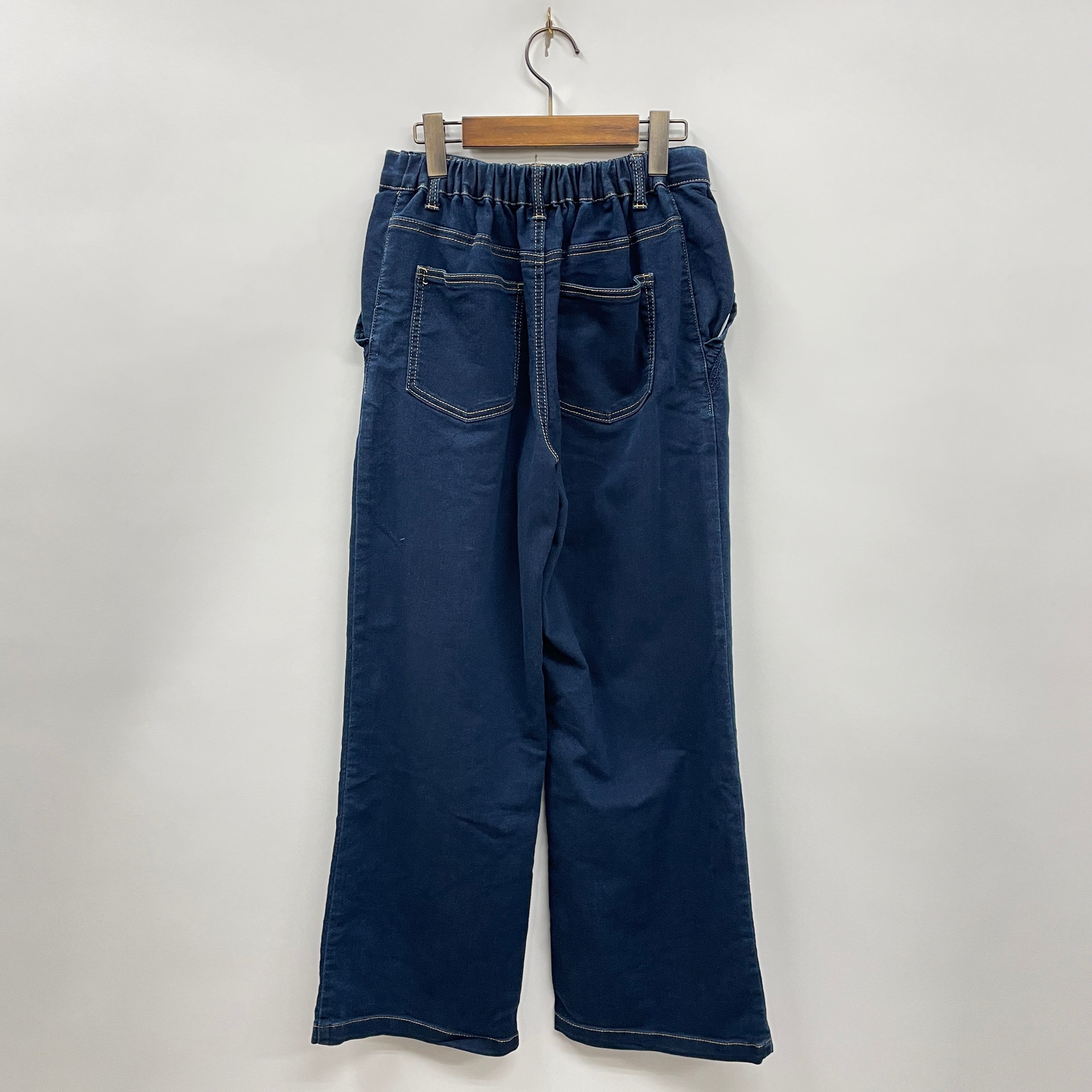 ウエストの後ろの部分にはゴムが入っており、ベルトループも付いているのでジャストサイズで履いていただけます。