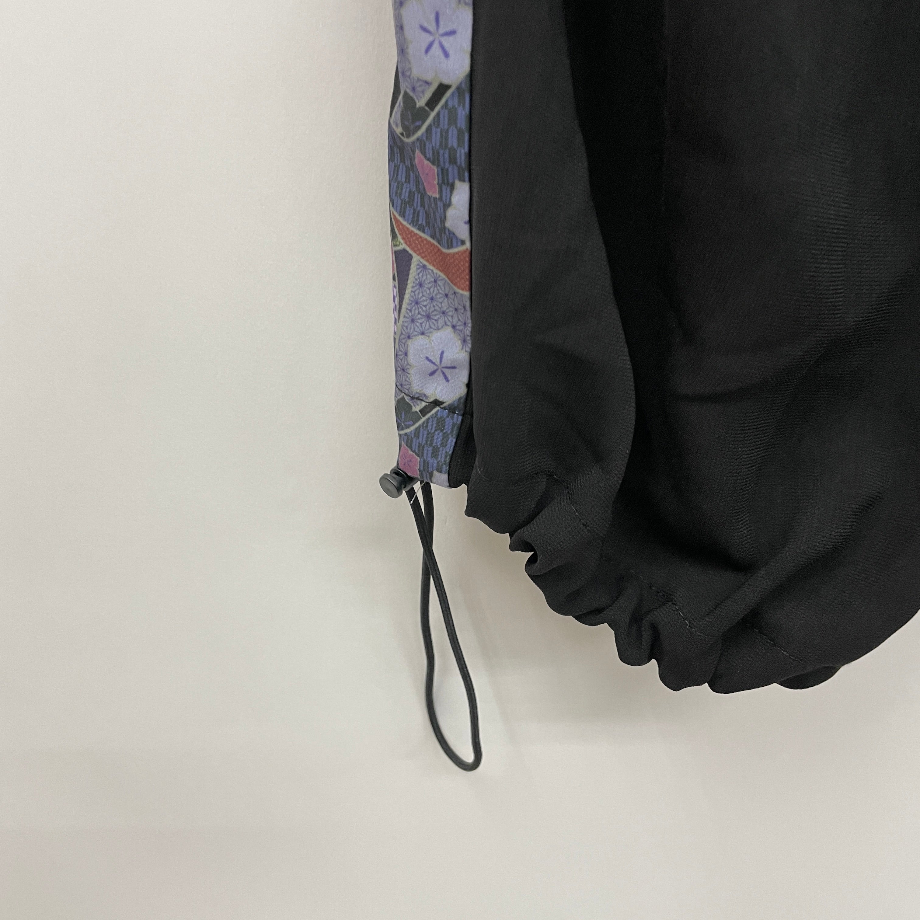 スタイリッシュなサイドのライン切替に紫式部を連想したコラージュプリントを取り入れ、和風MIXのパンツが完成しました。
