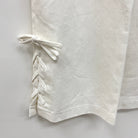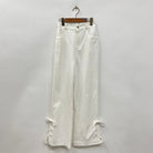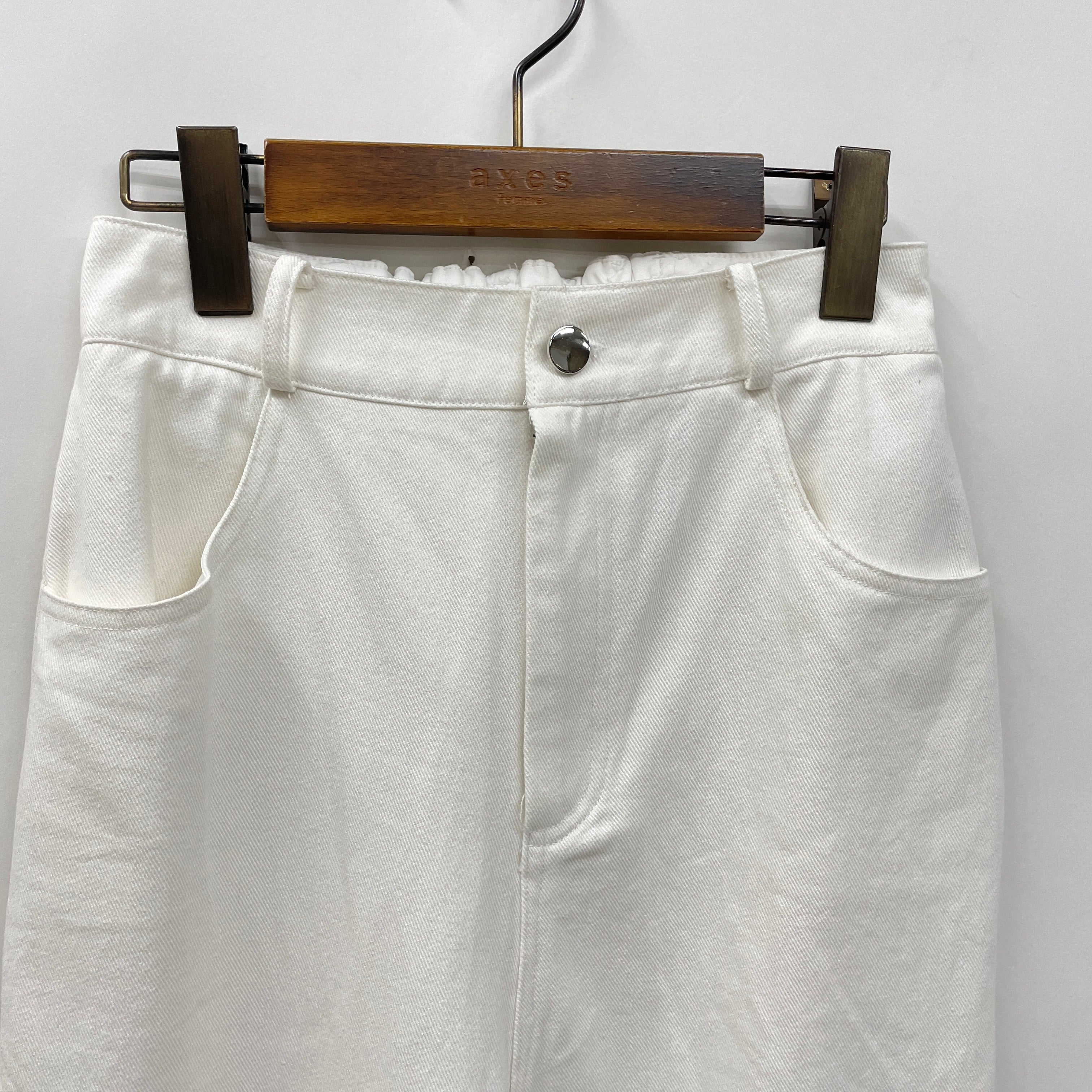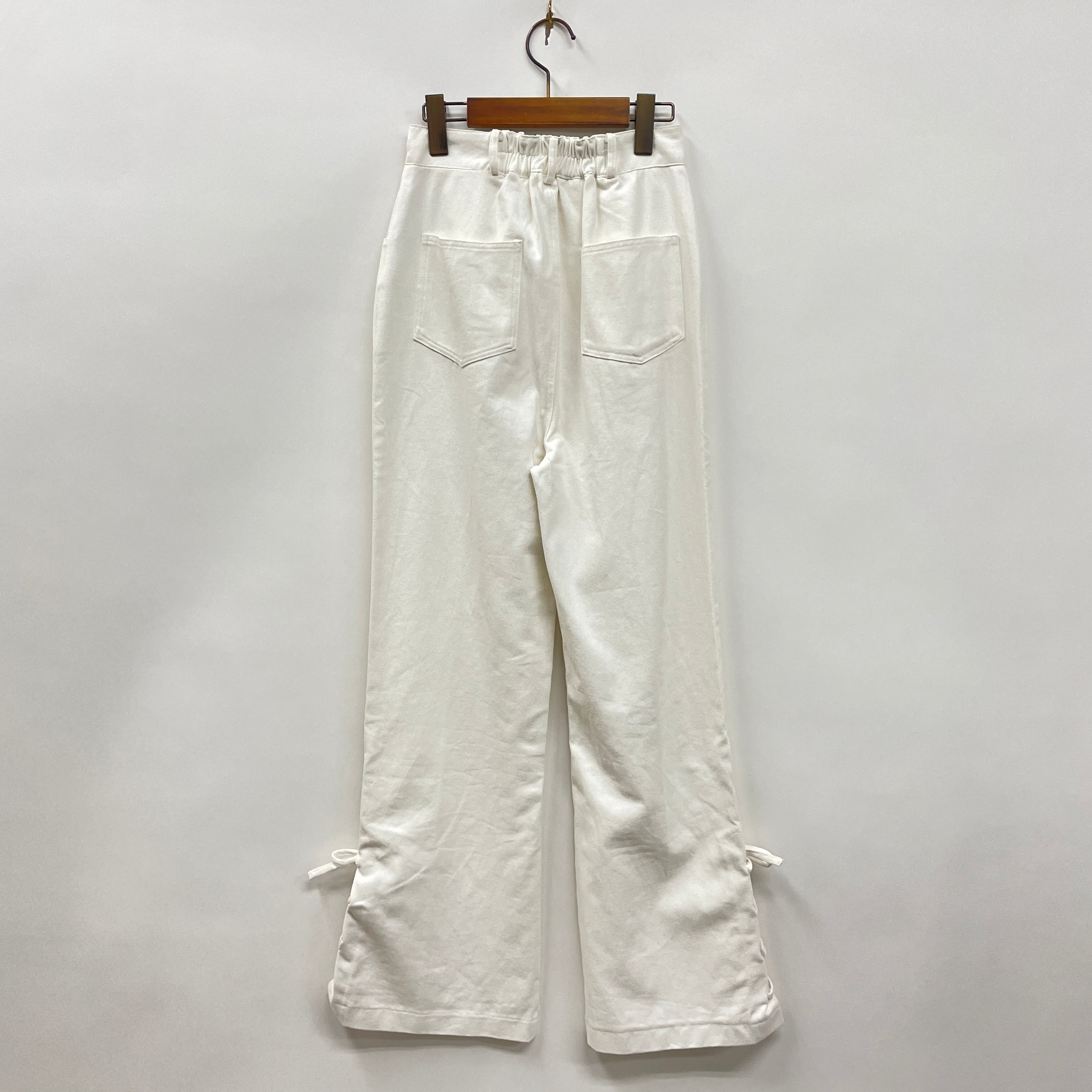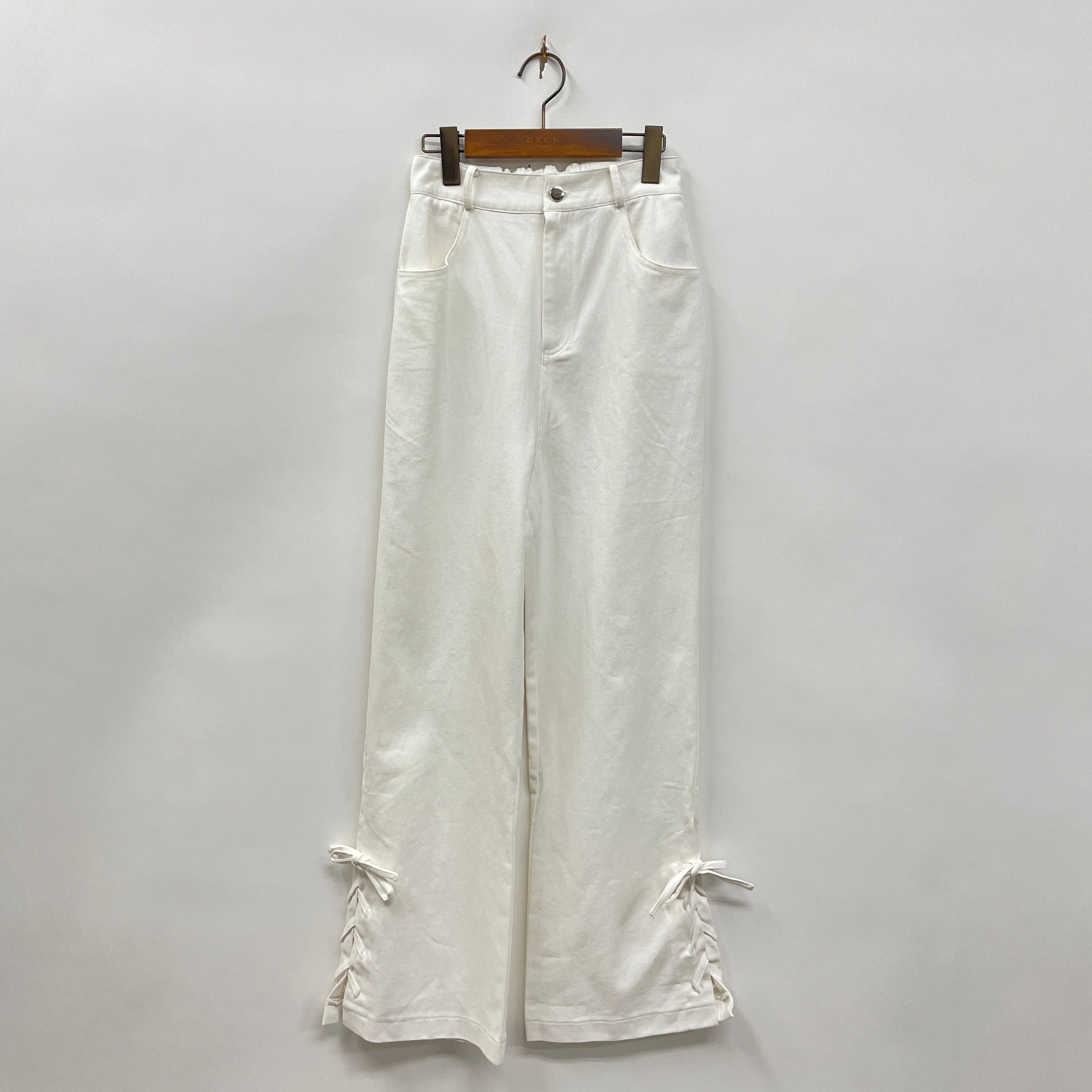 ハイウエストデザインで後ろ中心が一部ゴムになっており、伸縮性がある履きやすいパンツです。裾がレースアップデザインになっています。