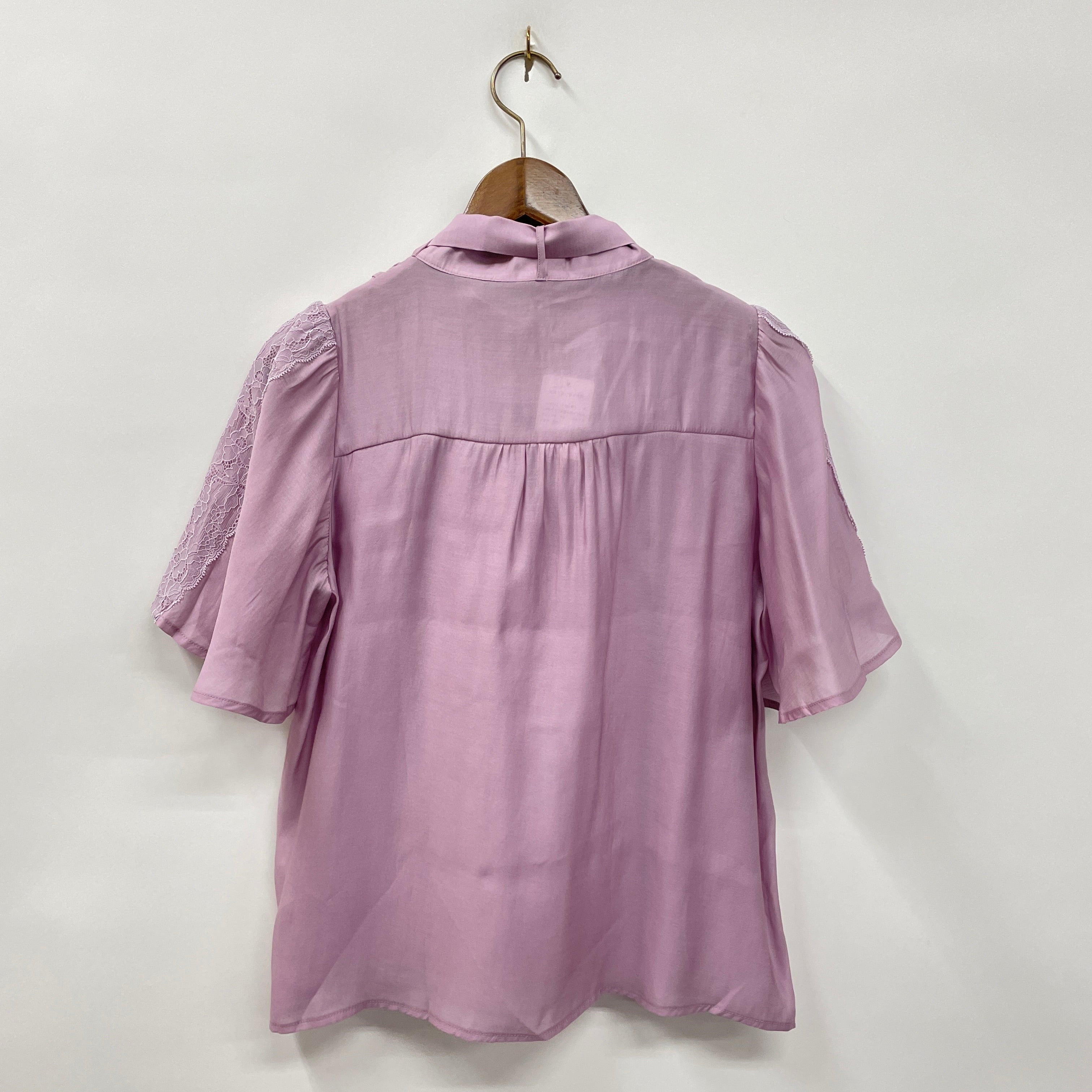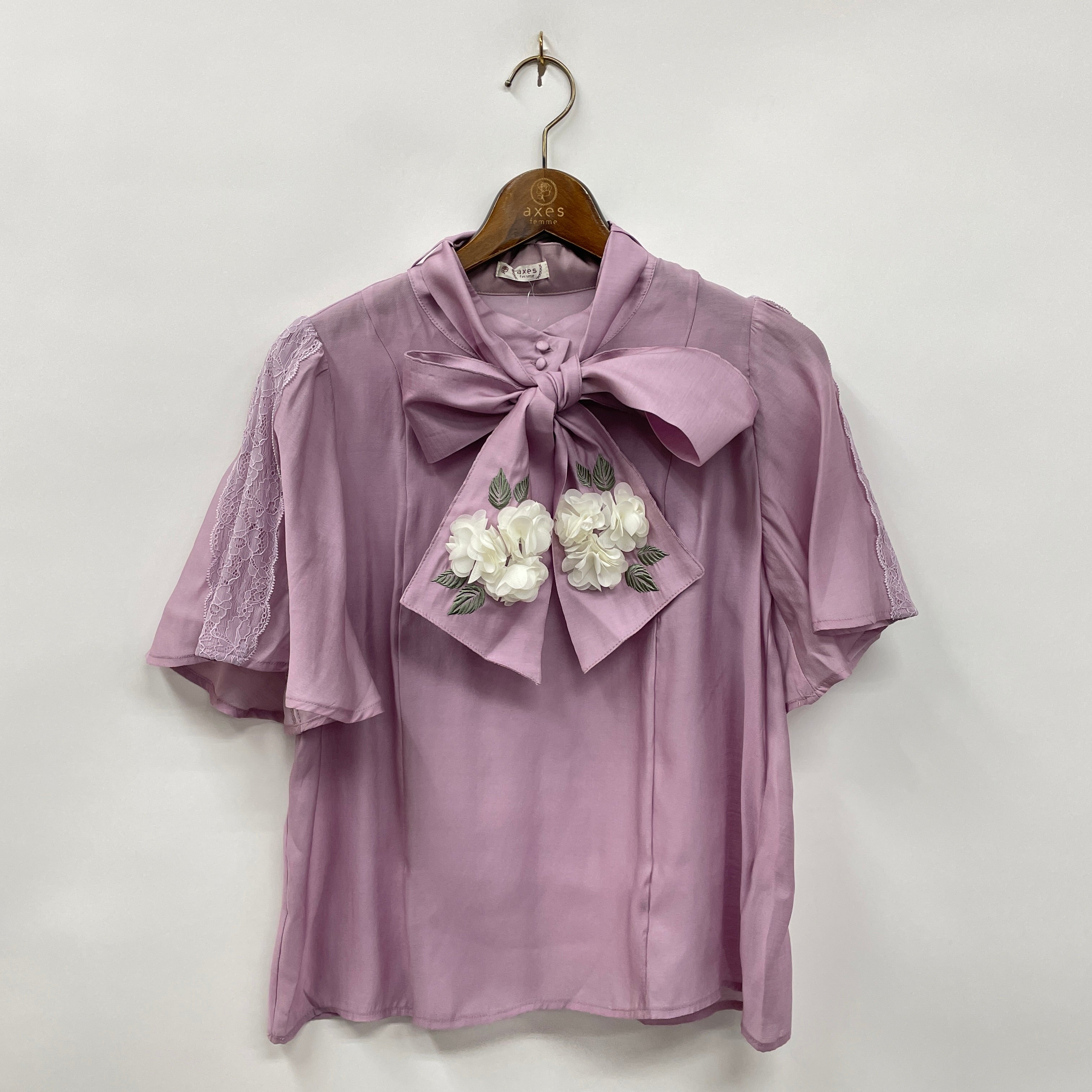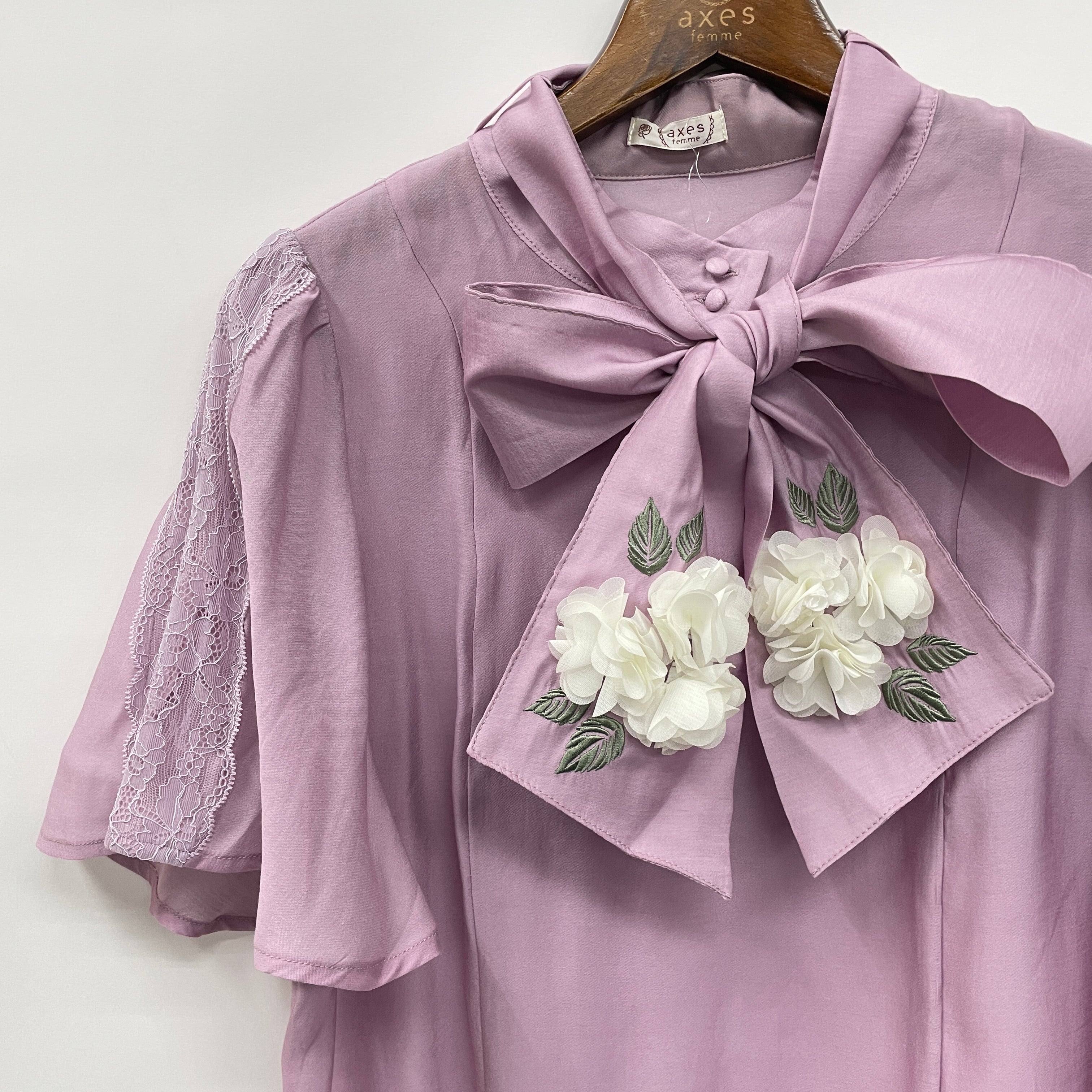 梅雨の時期を鮮やかに彩る紫陽花をシフォン生地のモチーフで表現したブラウスです。
