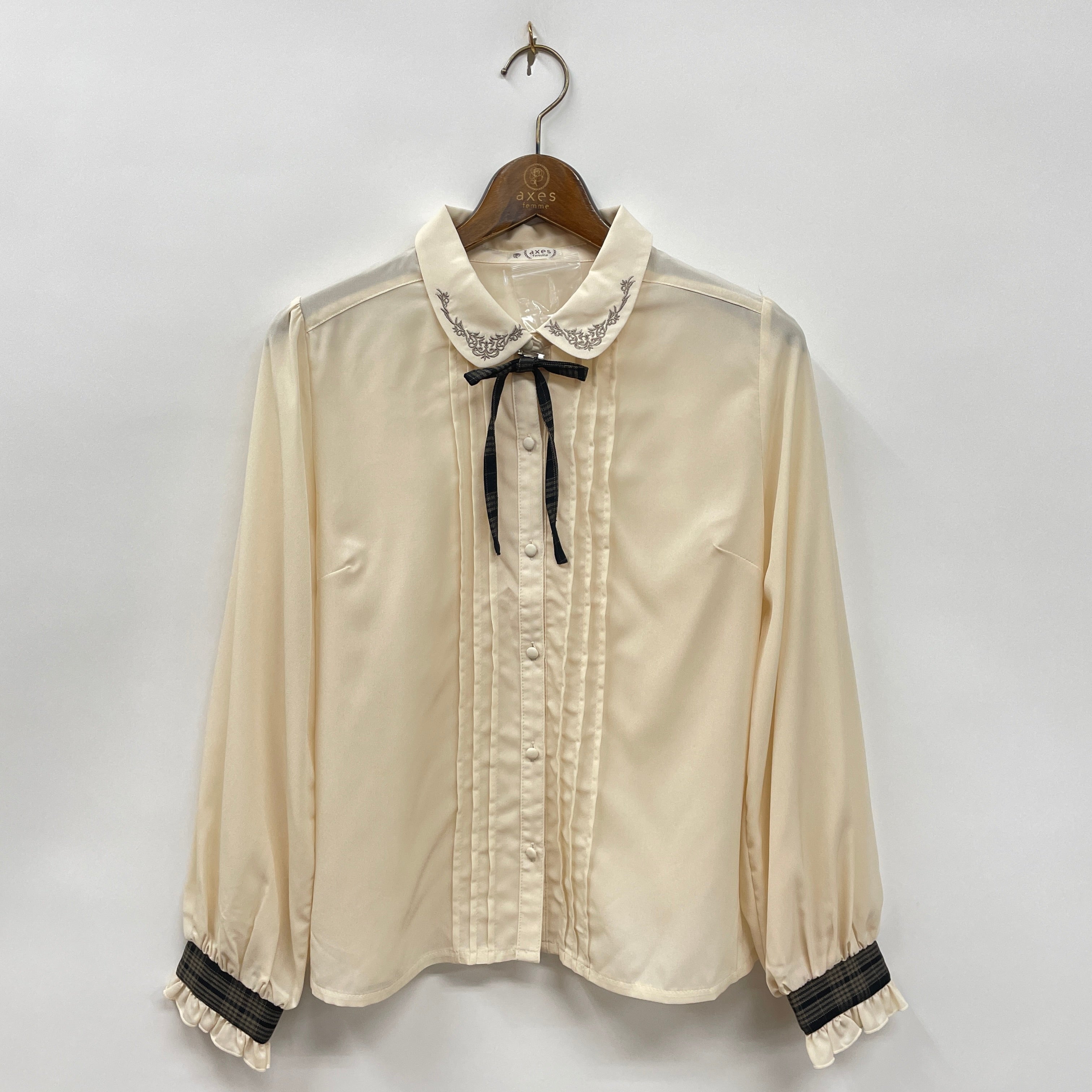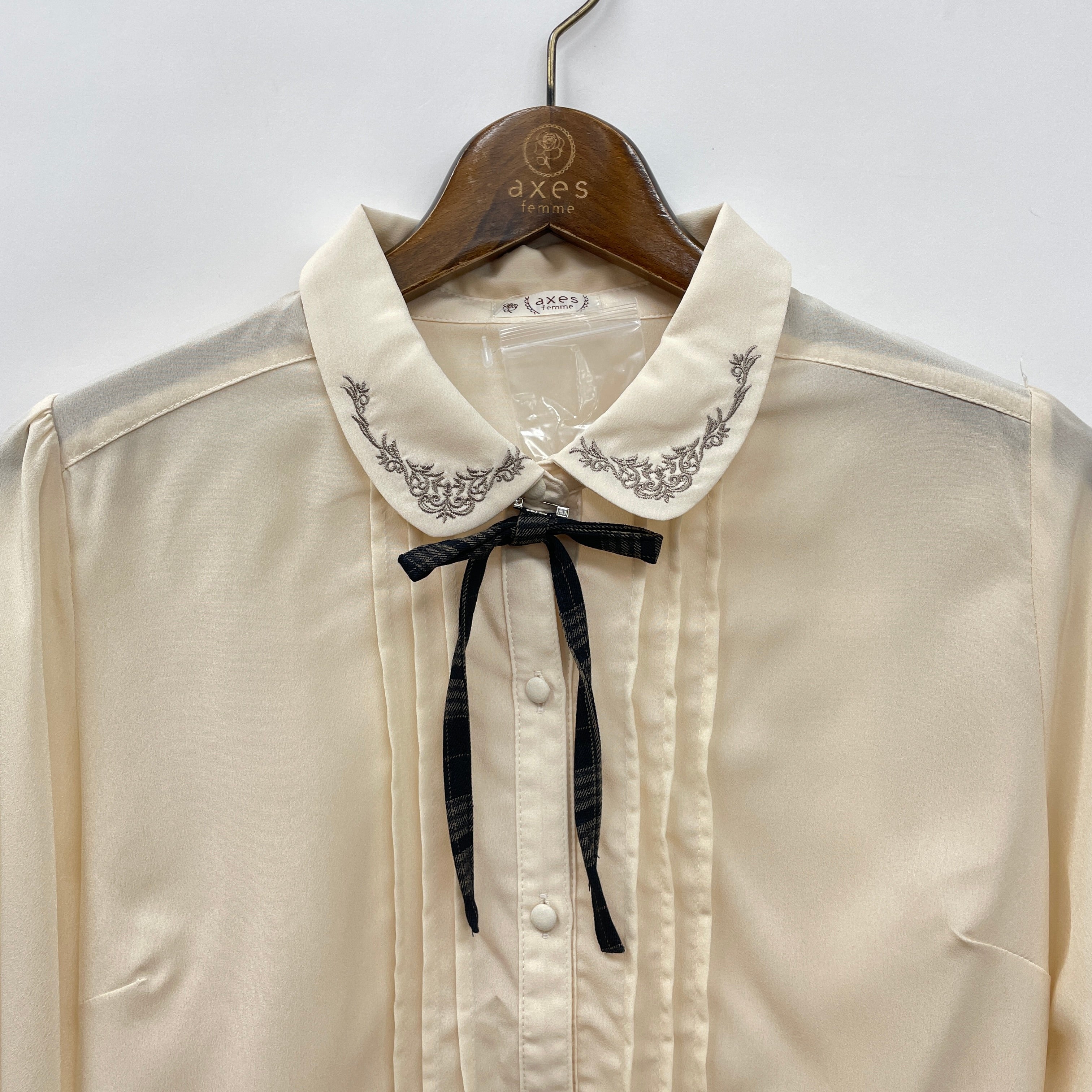 襟に刺繍をあしらい、上からニットプルオーバーやカーディガンを合わせてもポイントになるデザインです。