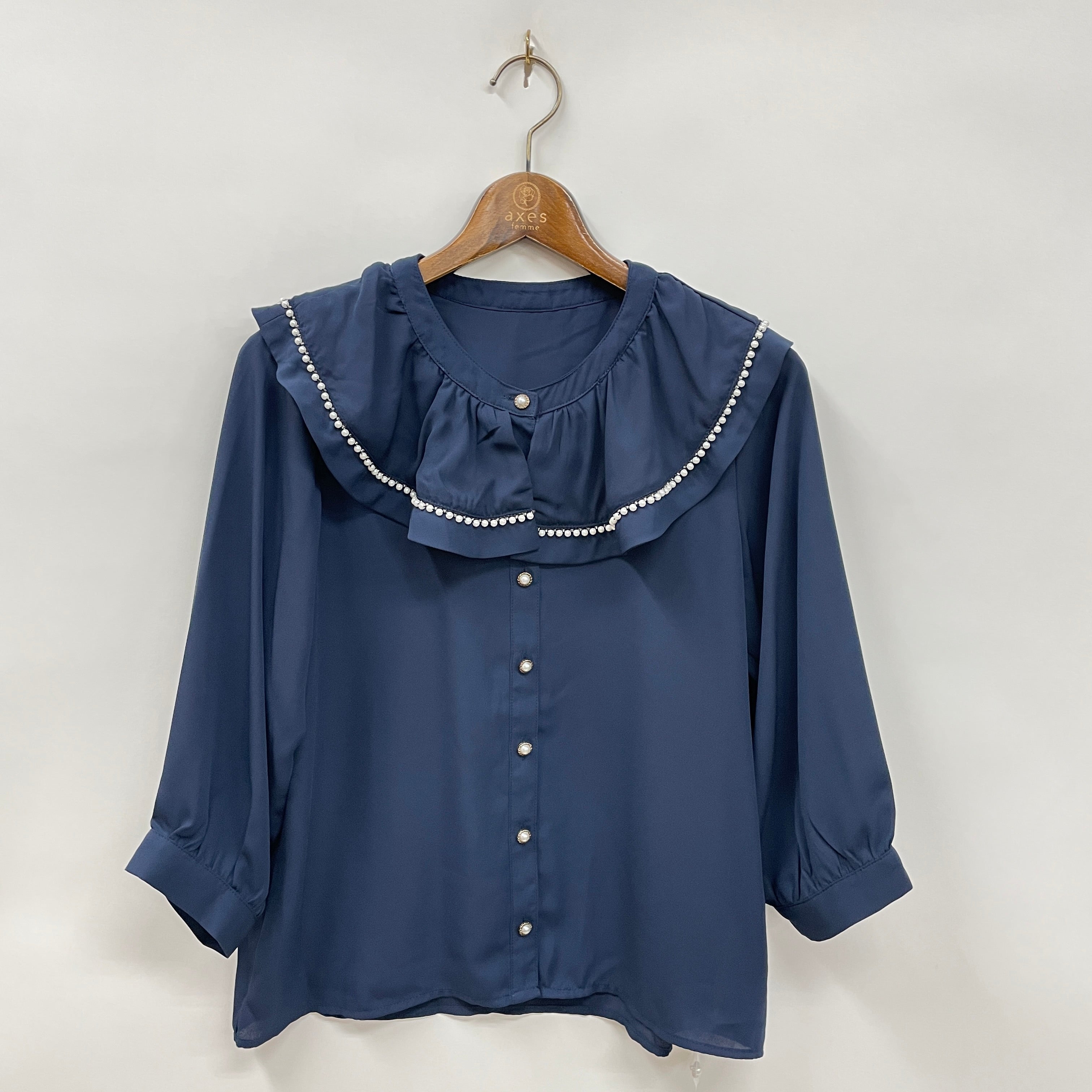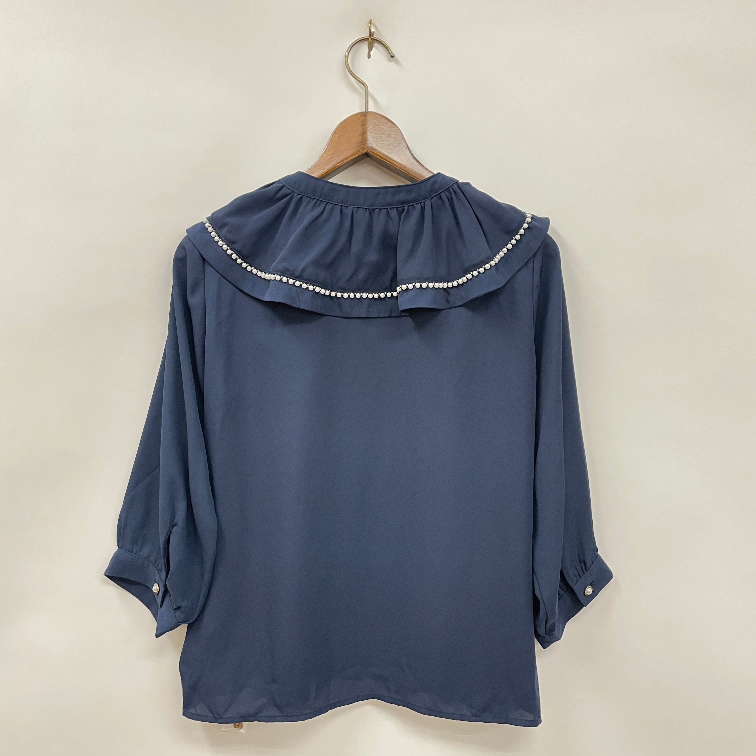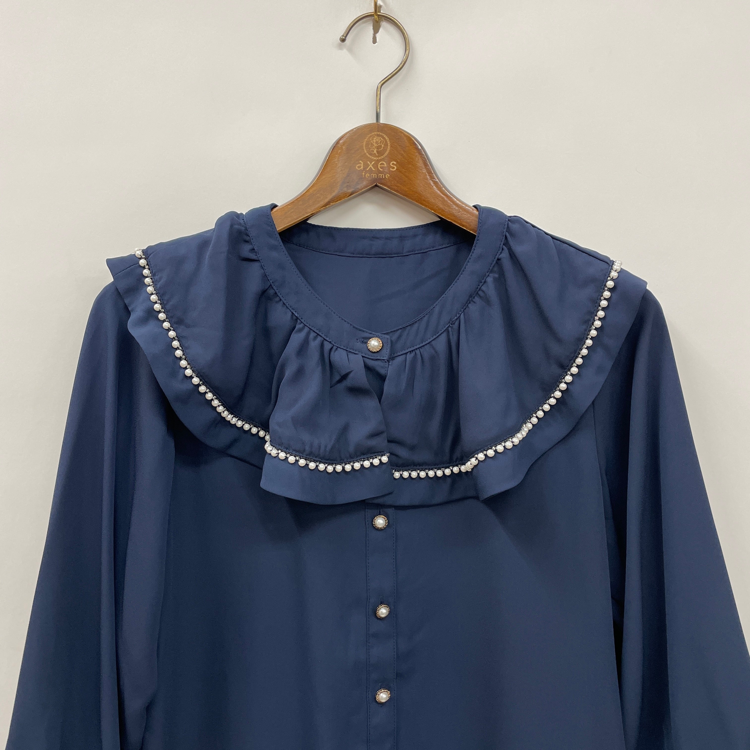 パールを贅沢にあしらったギャザーフレアーの襟がポイント。