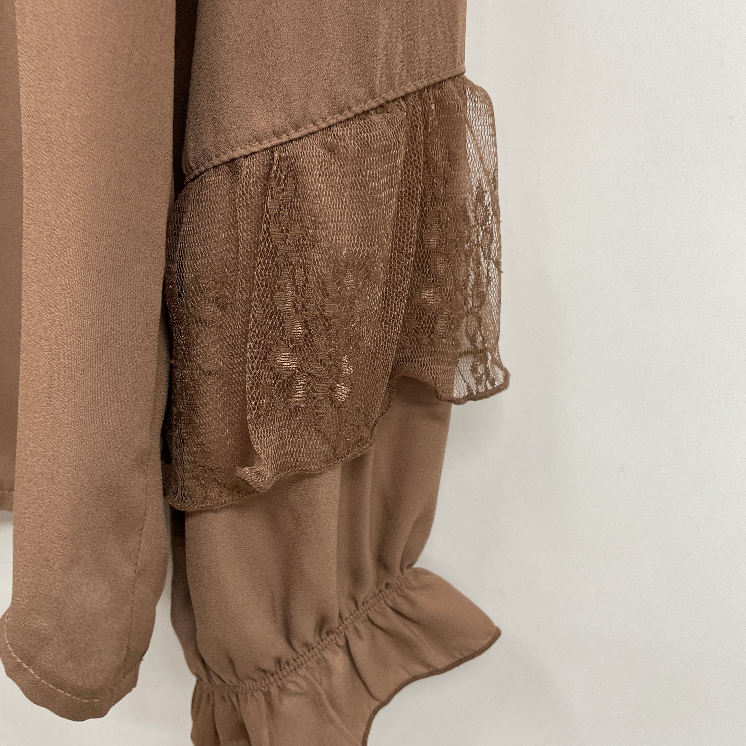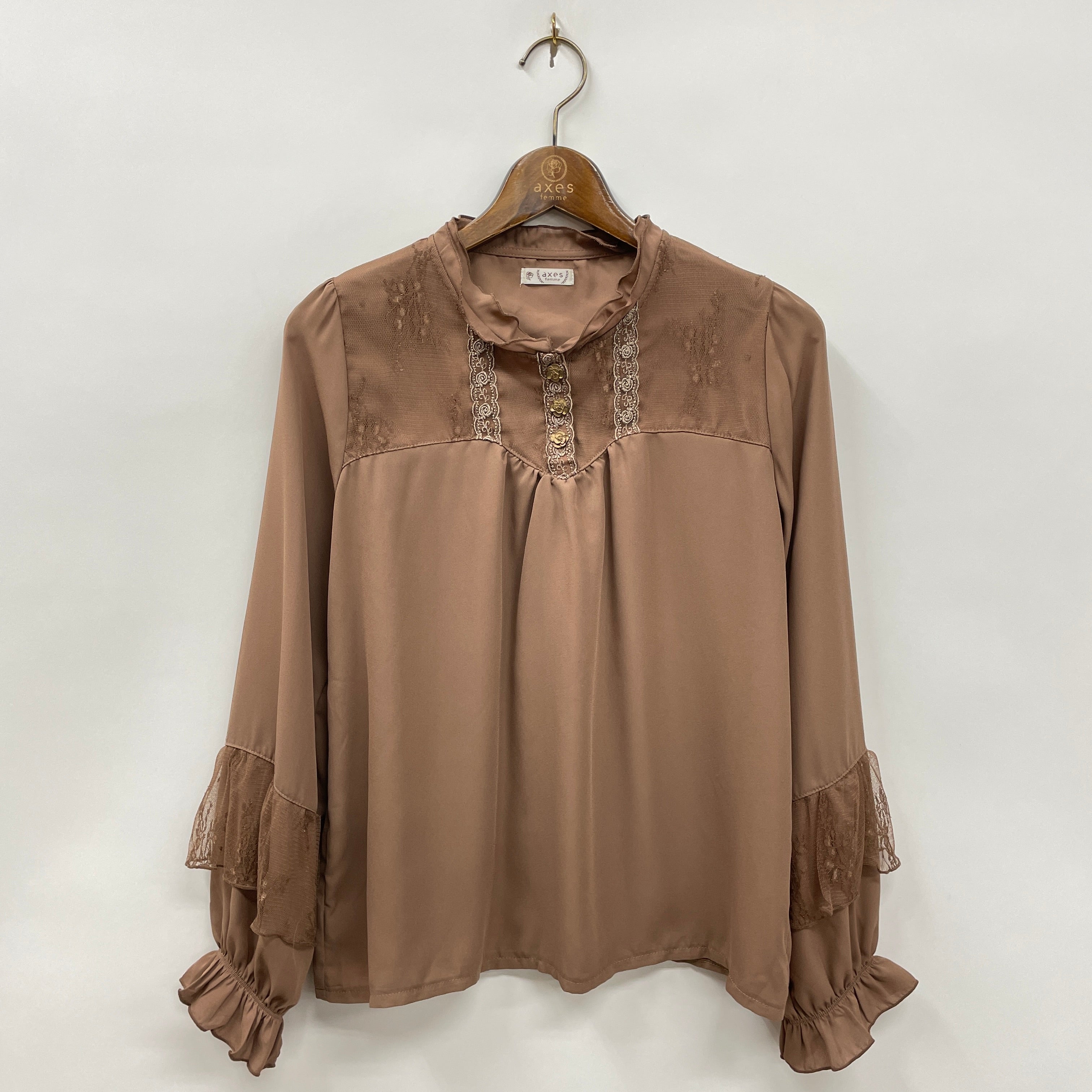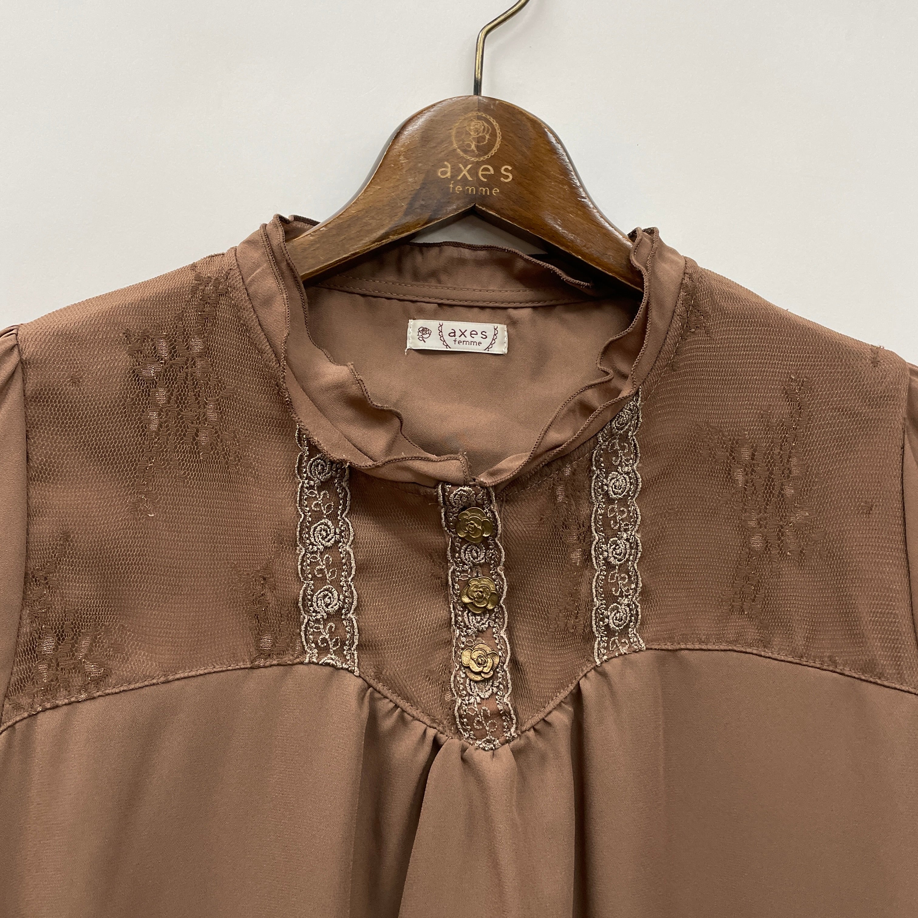 フロントにはアンティーク調のモチーフボタンが並び、袖口のレースデザインがお手元を華やかに飾ります。