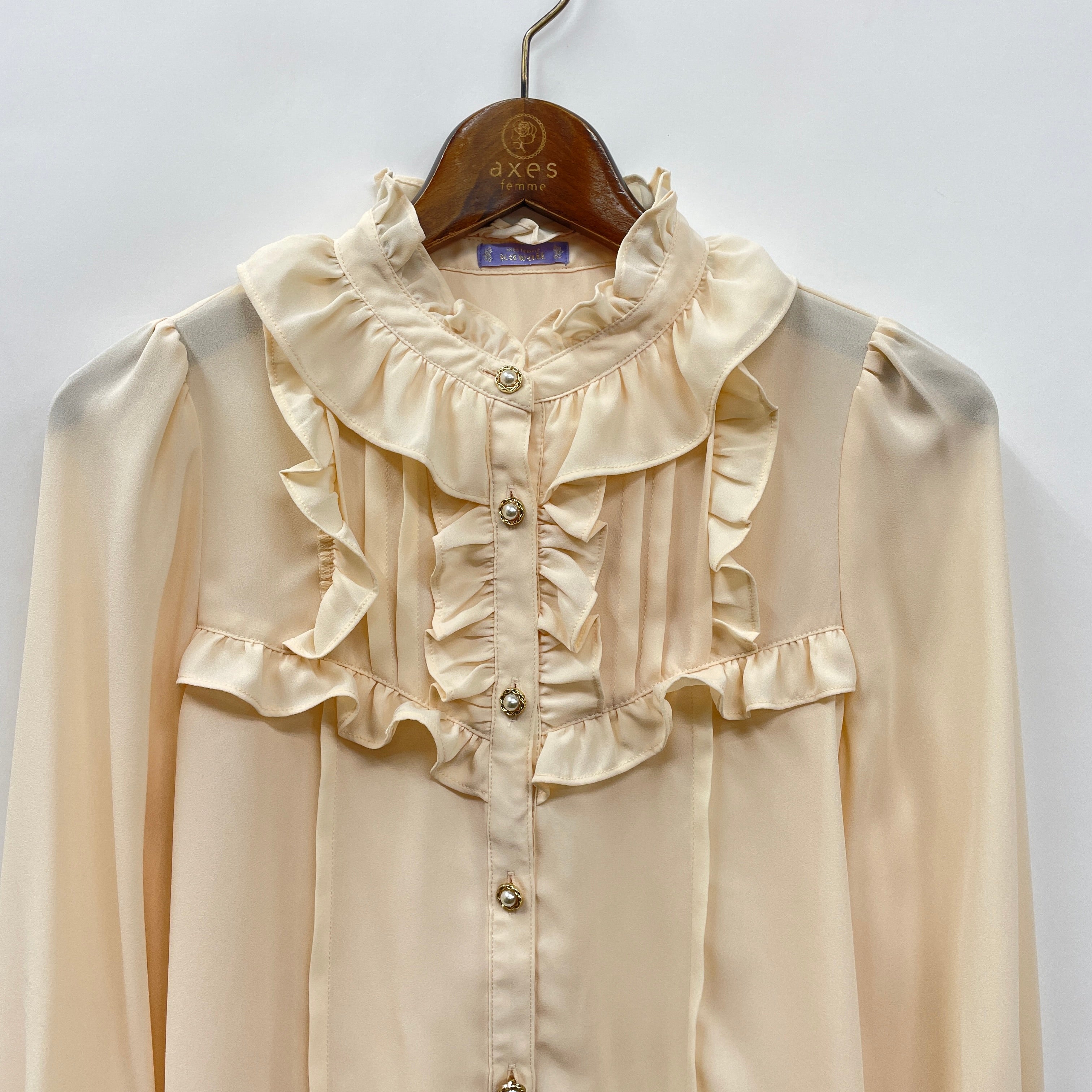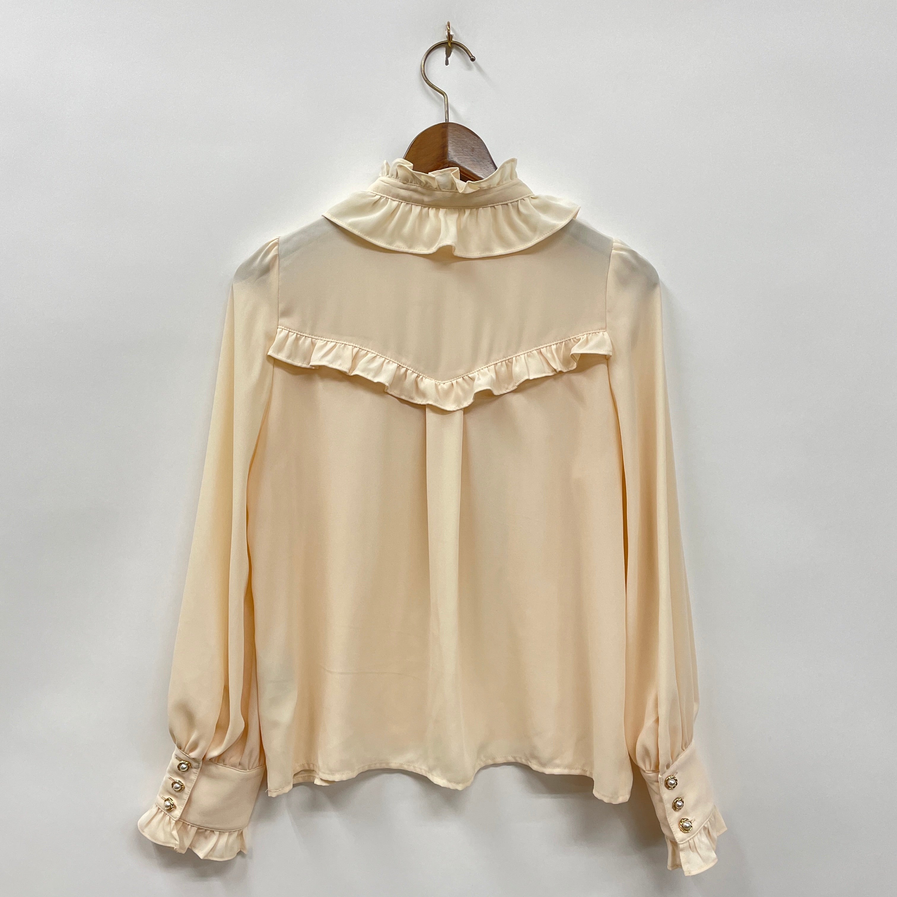 スタンド衿のベーシックなデザインのブラウスは秋冬コーデに合わせやすいカラー展開で登場です。首元のリボンブローチは取り外しができます。