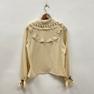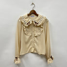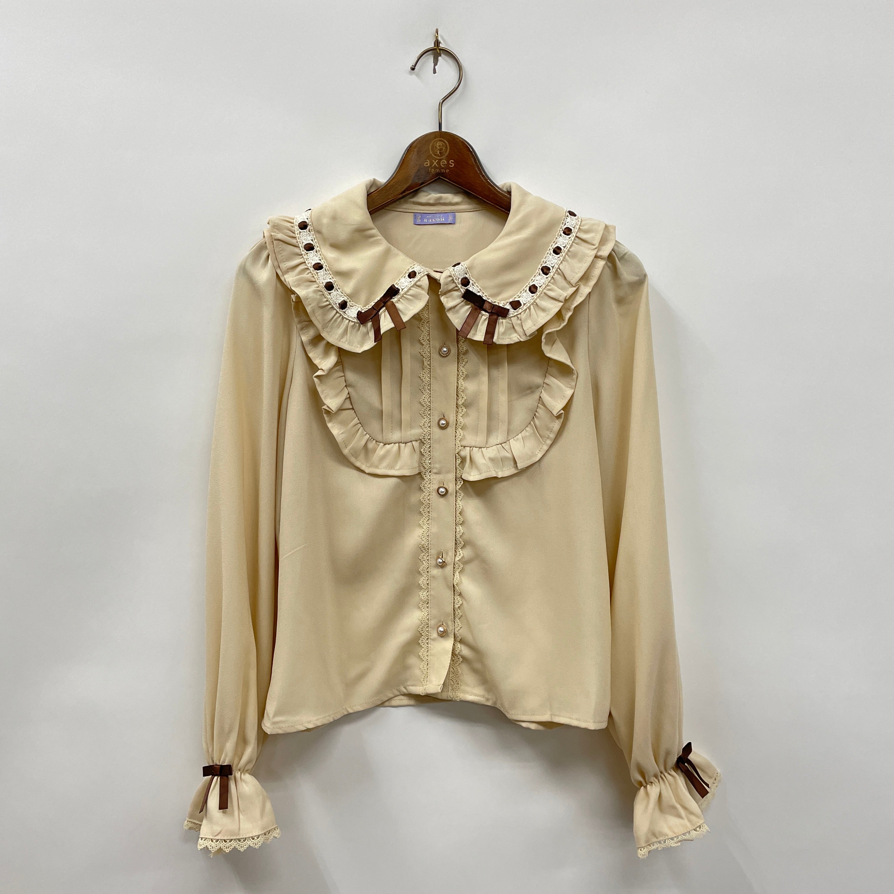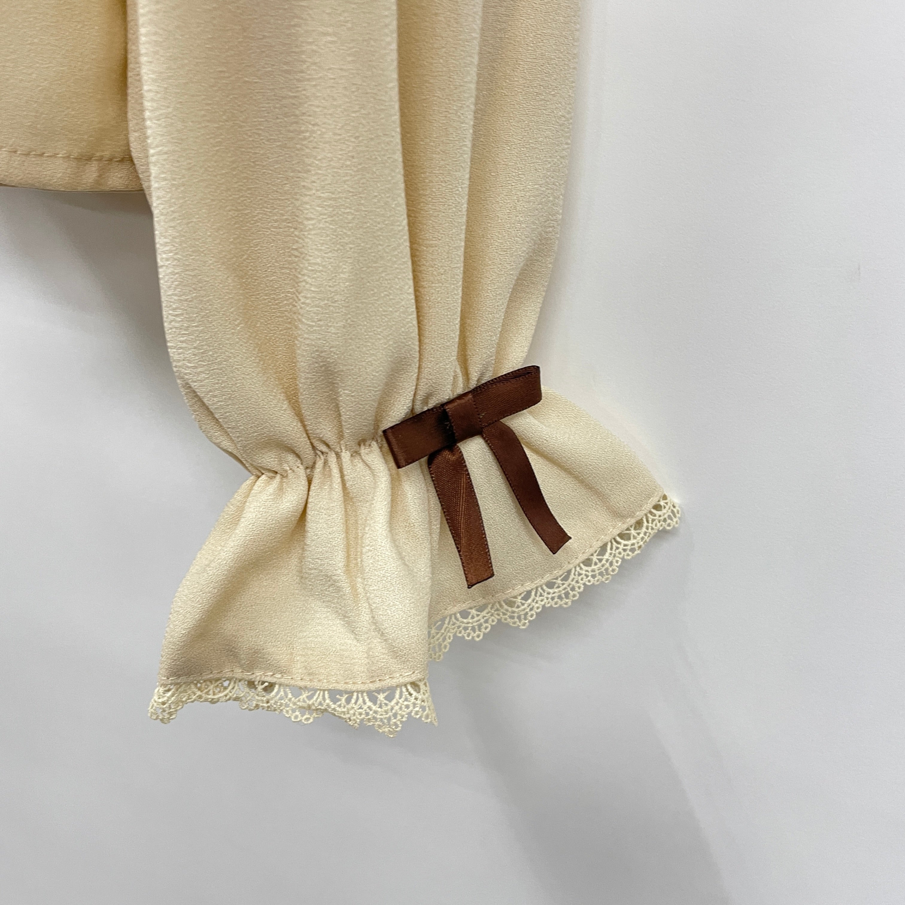 少し厚手のジョーゼットで寒い冬にもピッタリな長袖ブラウスです。襟元の梯子レースにはサテンリボンが通されたデザインです。