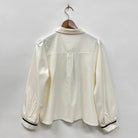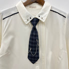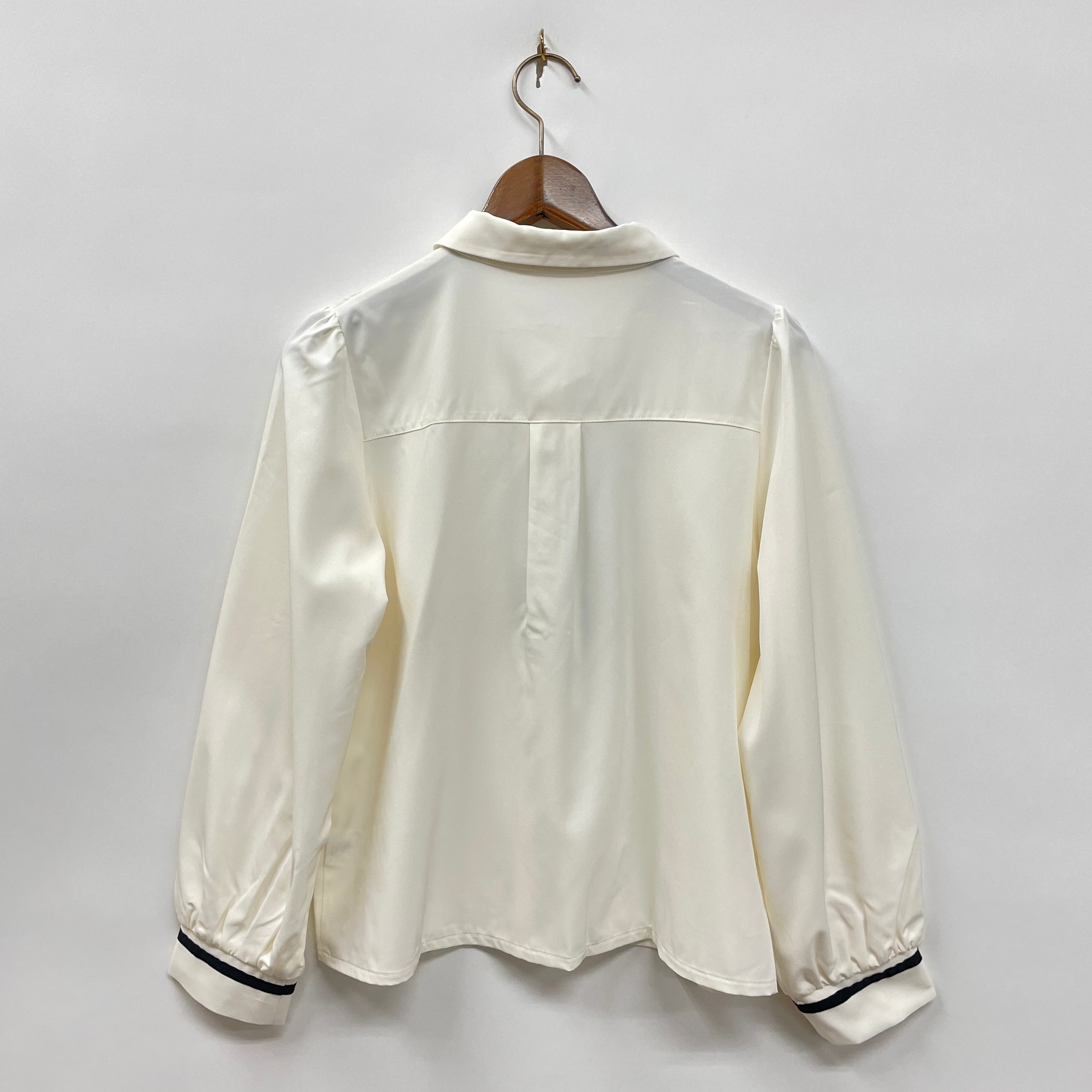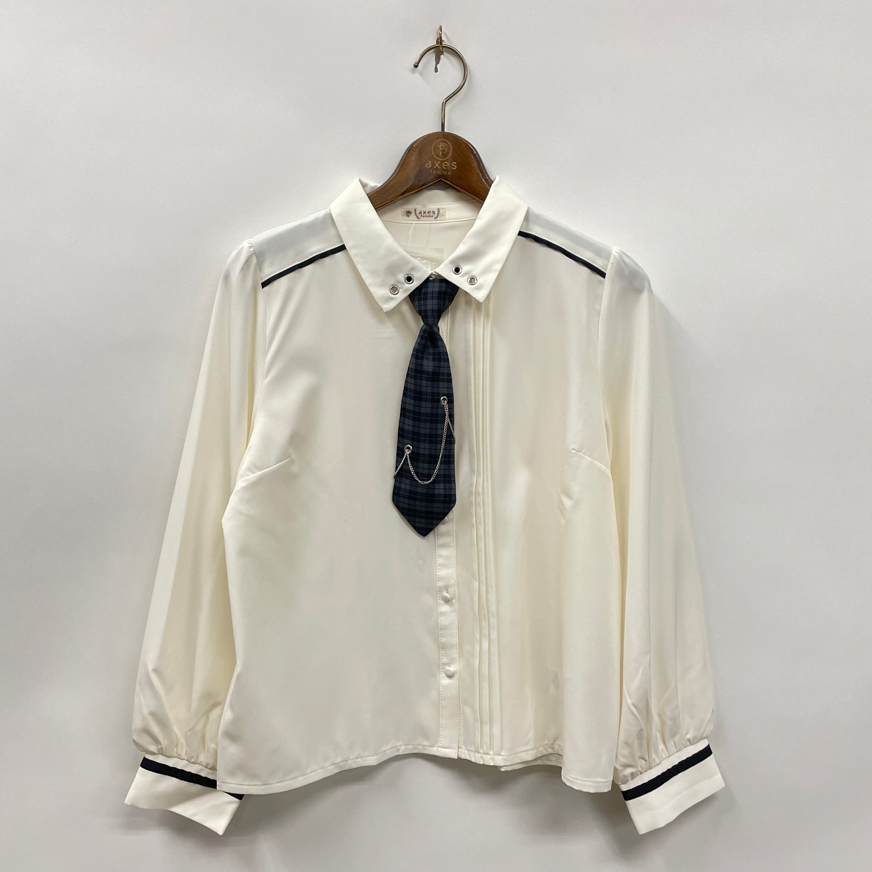 ネクタイにチェーンをあしらったデザインがミリタリーチックなブラウス。