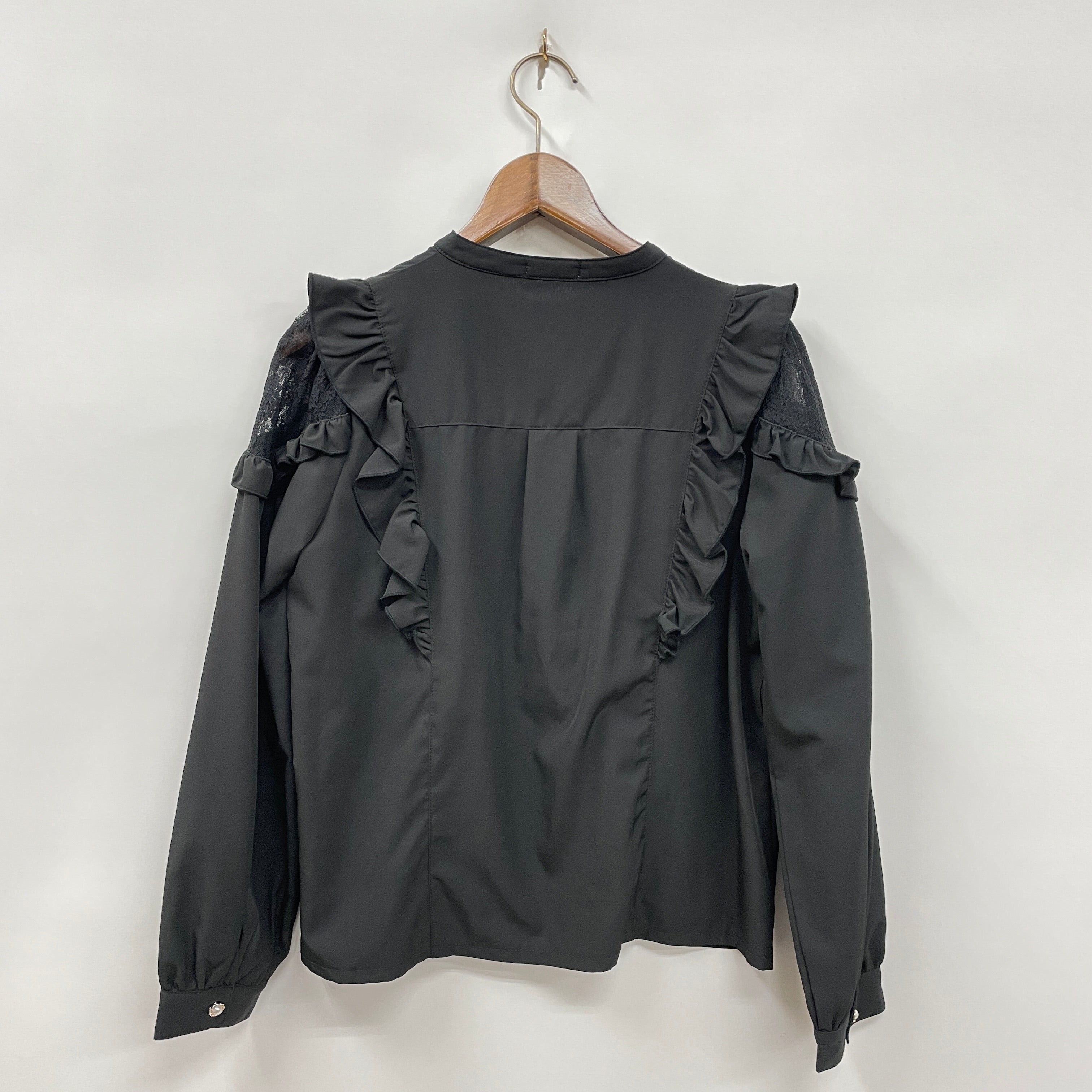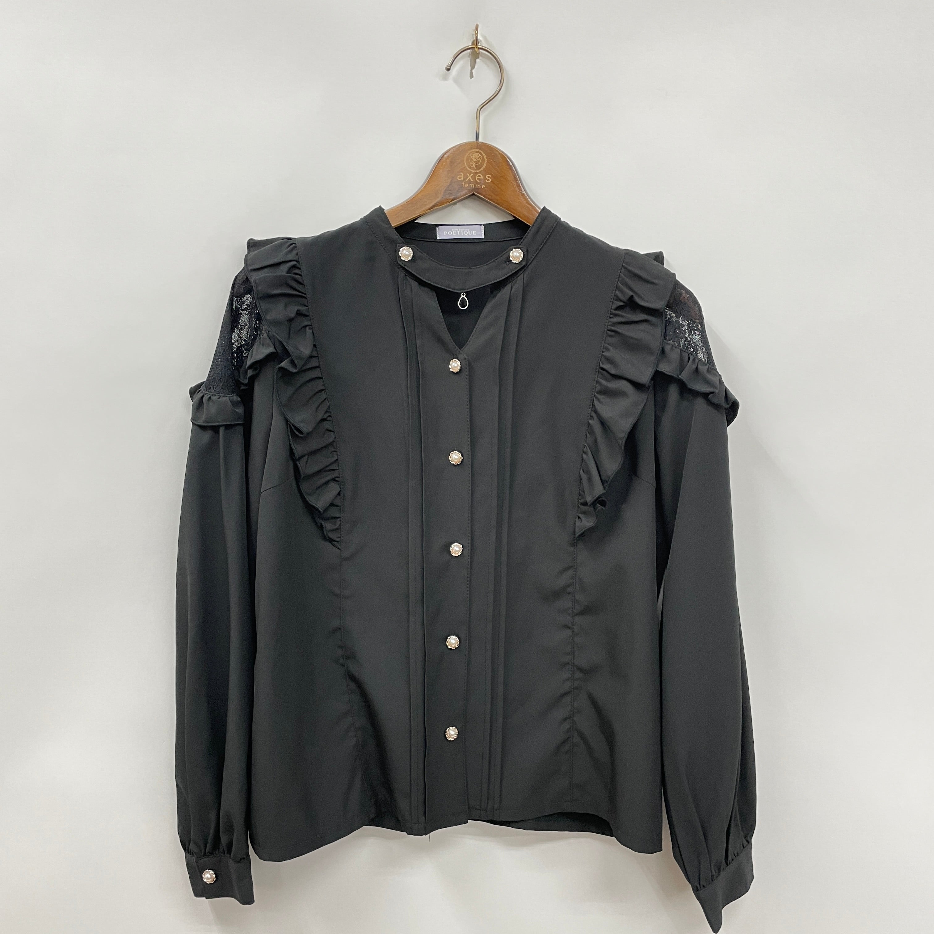 襟元に大粒のビジューがあしらわれたブラウスです。