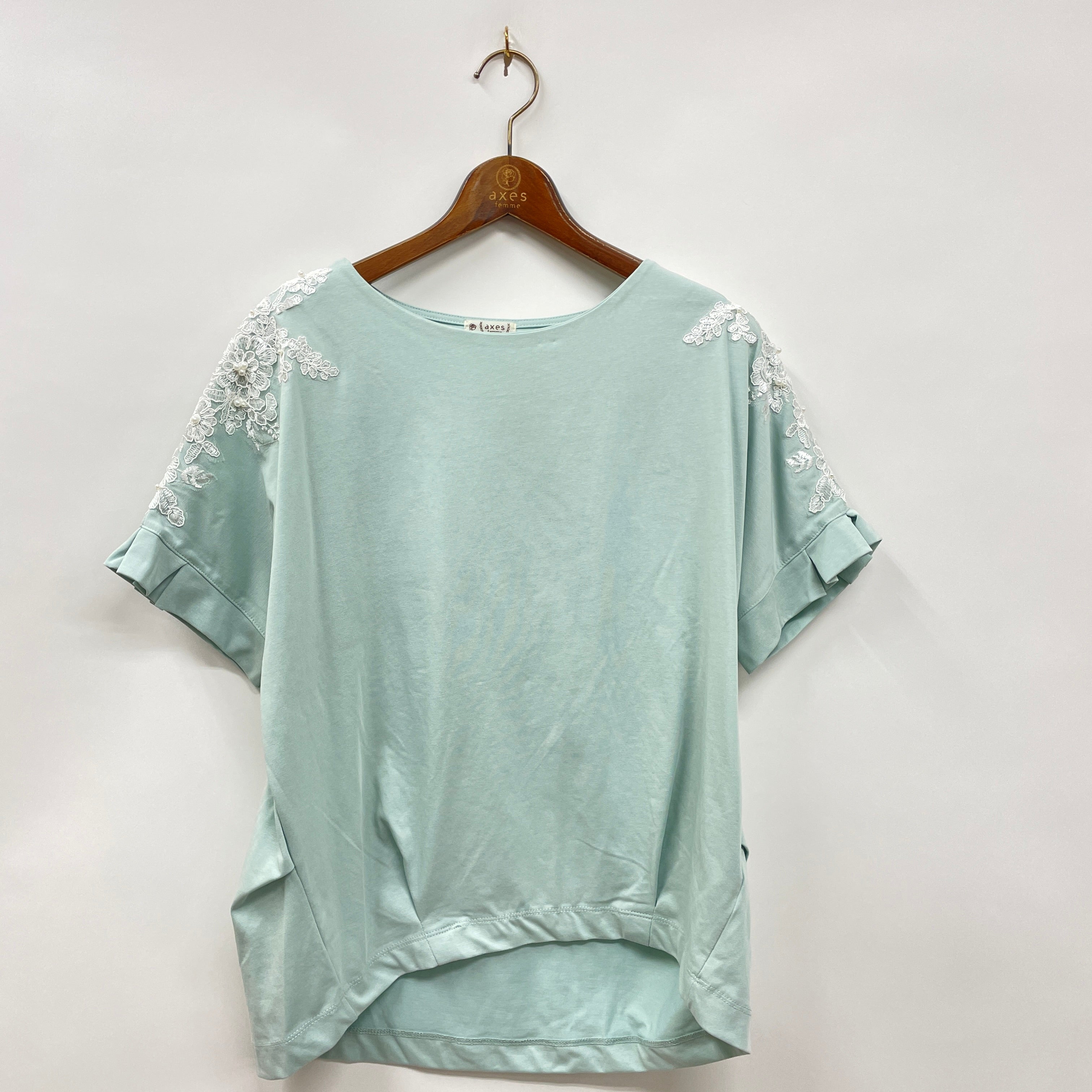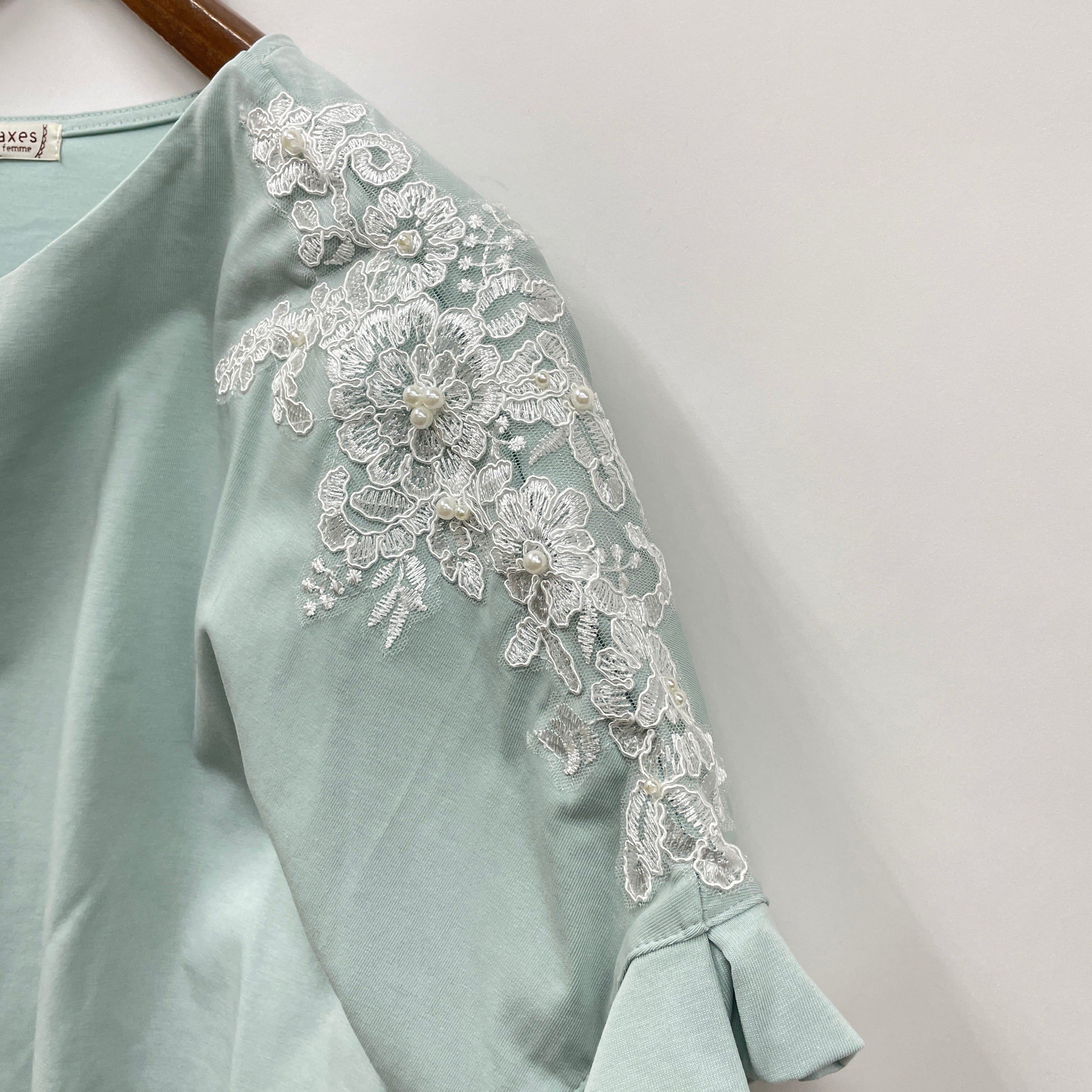 肩にあしらわれた存在感のある華やかなフラワーレースがポイントのドルマンプルオーバーです。