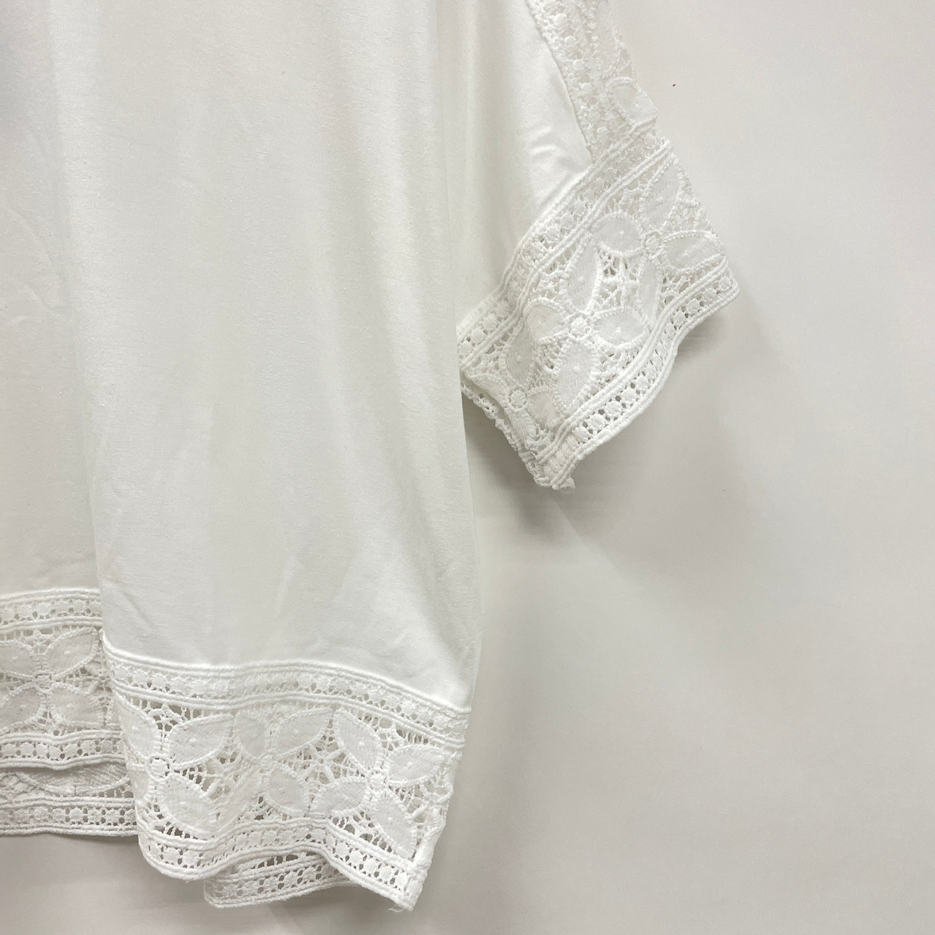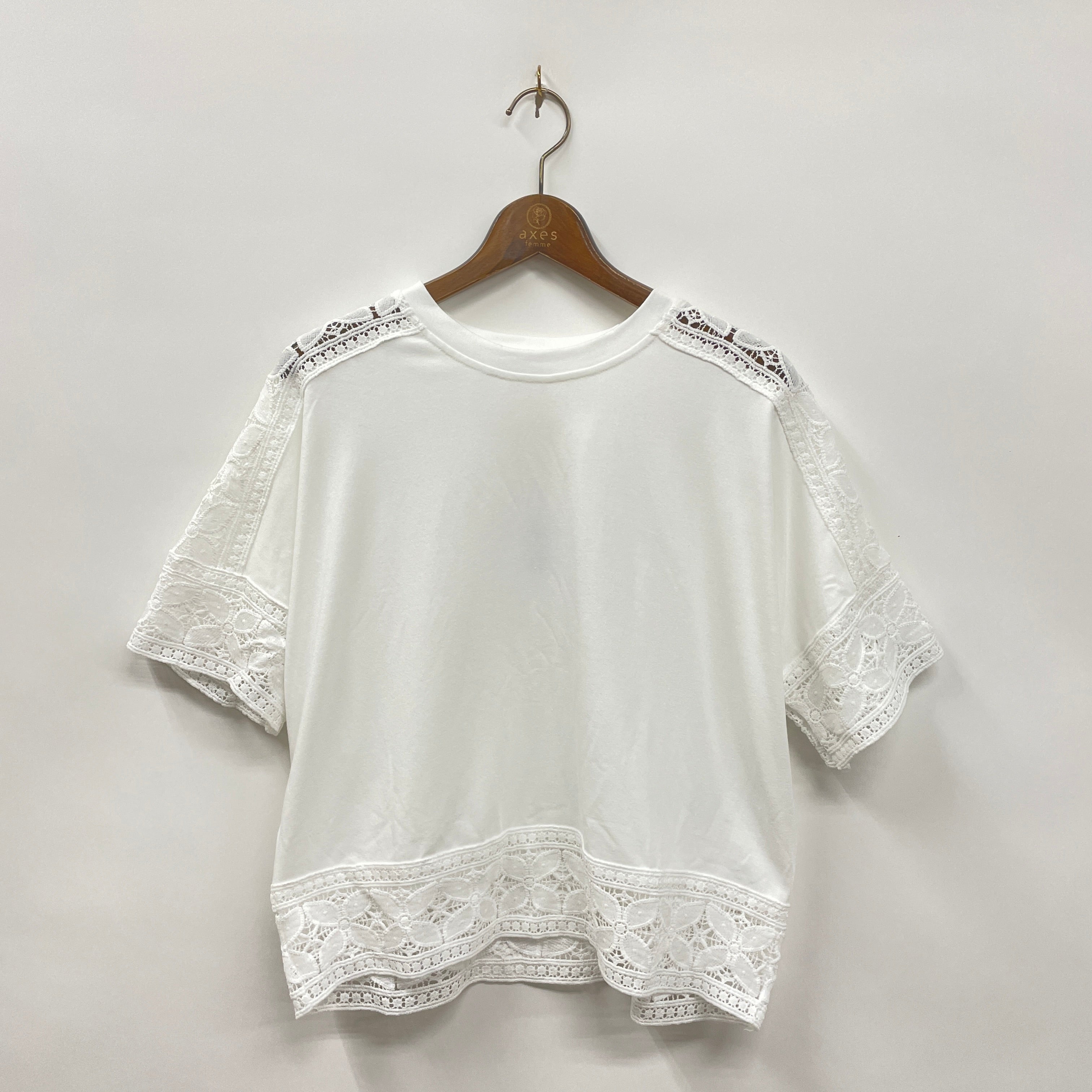 袖と裾にあしらわれた幾何学柄レースがアクセントになったTシャツです。