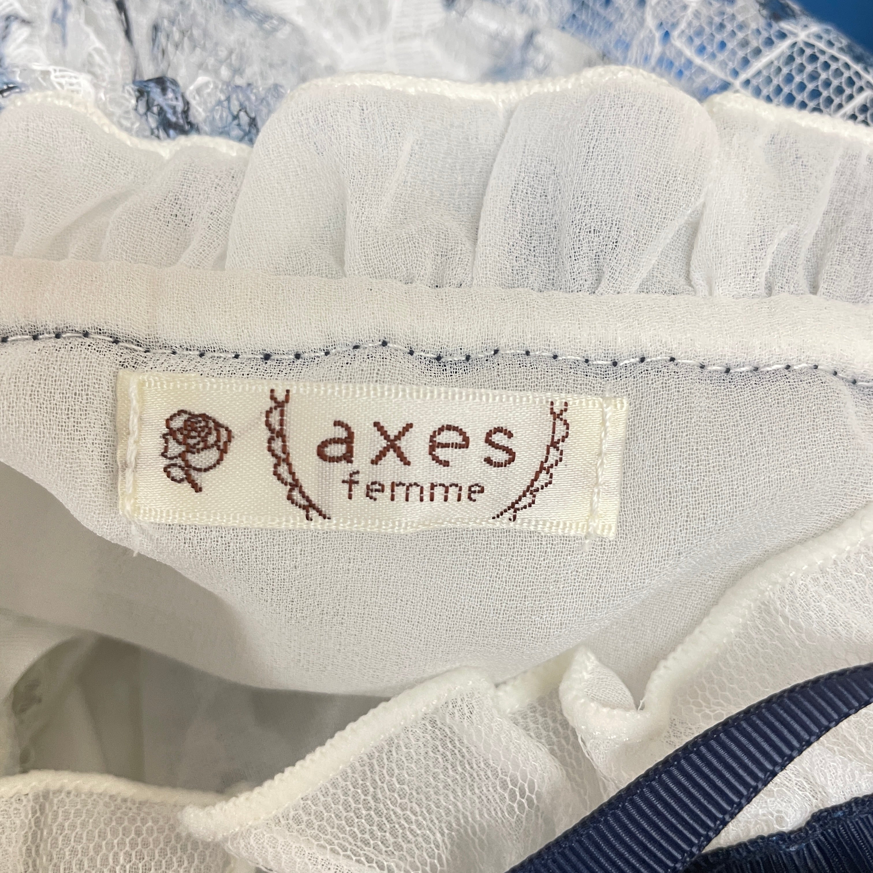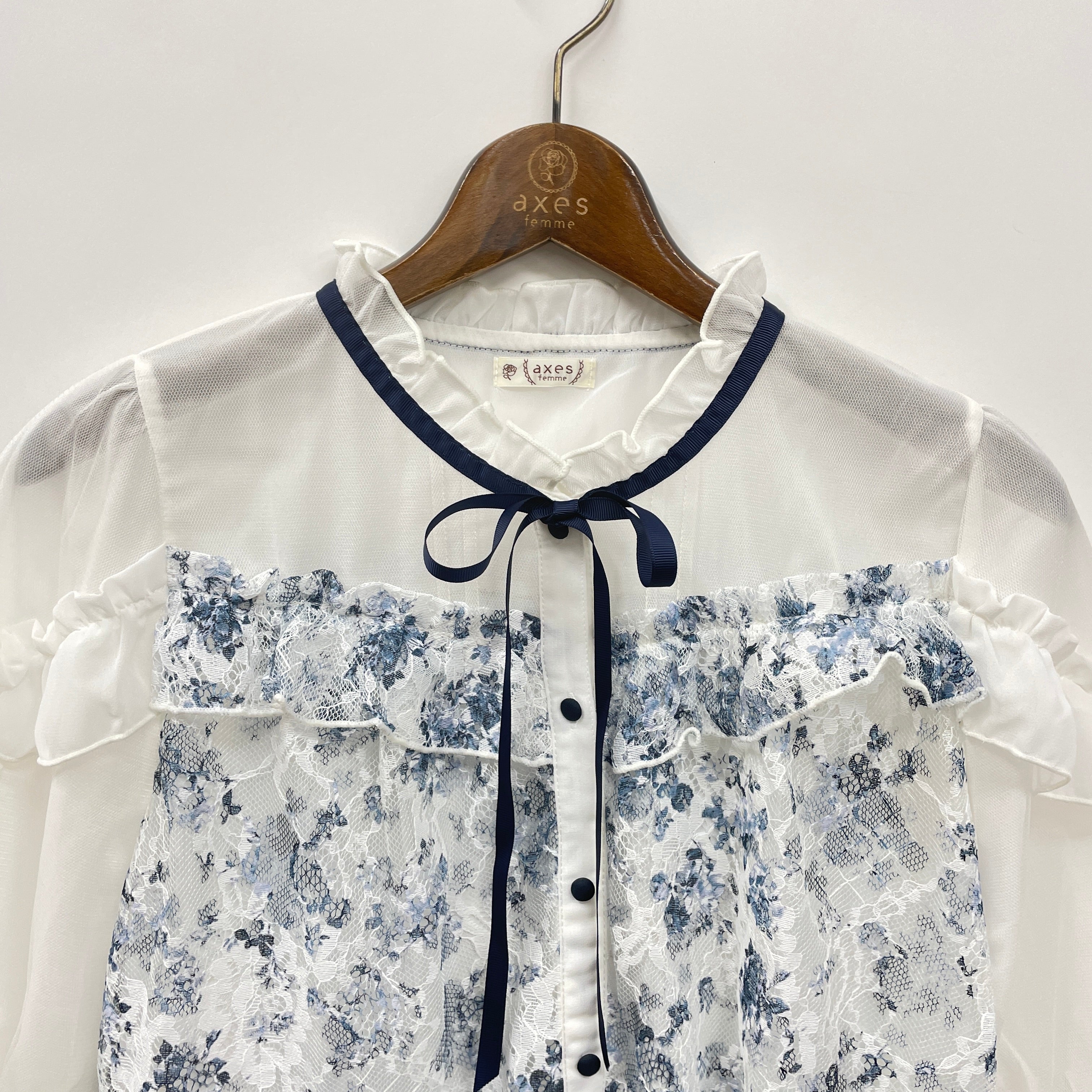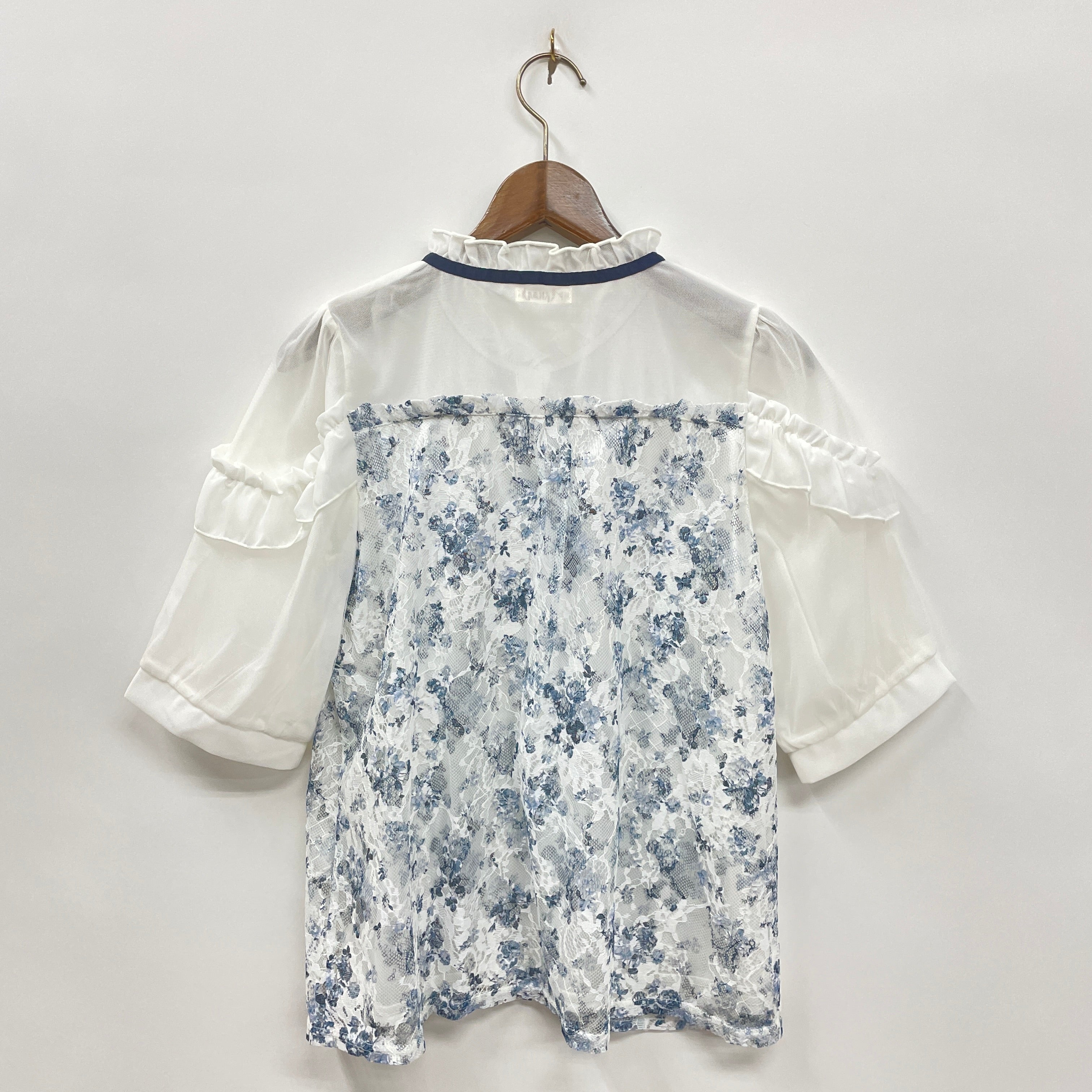 可憐なトワルドジュイ風柄をあしらったレース×チュールの切替トップス。