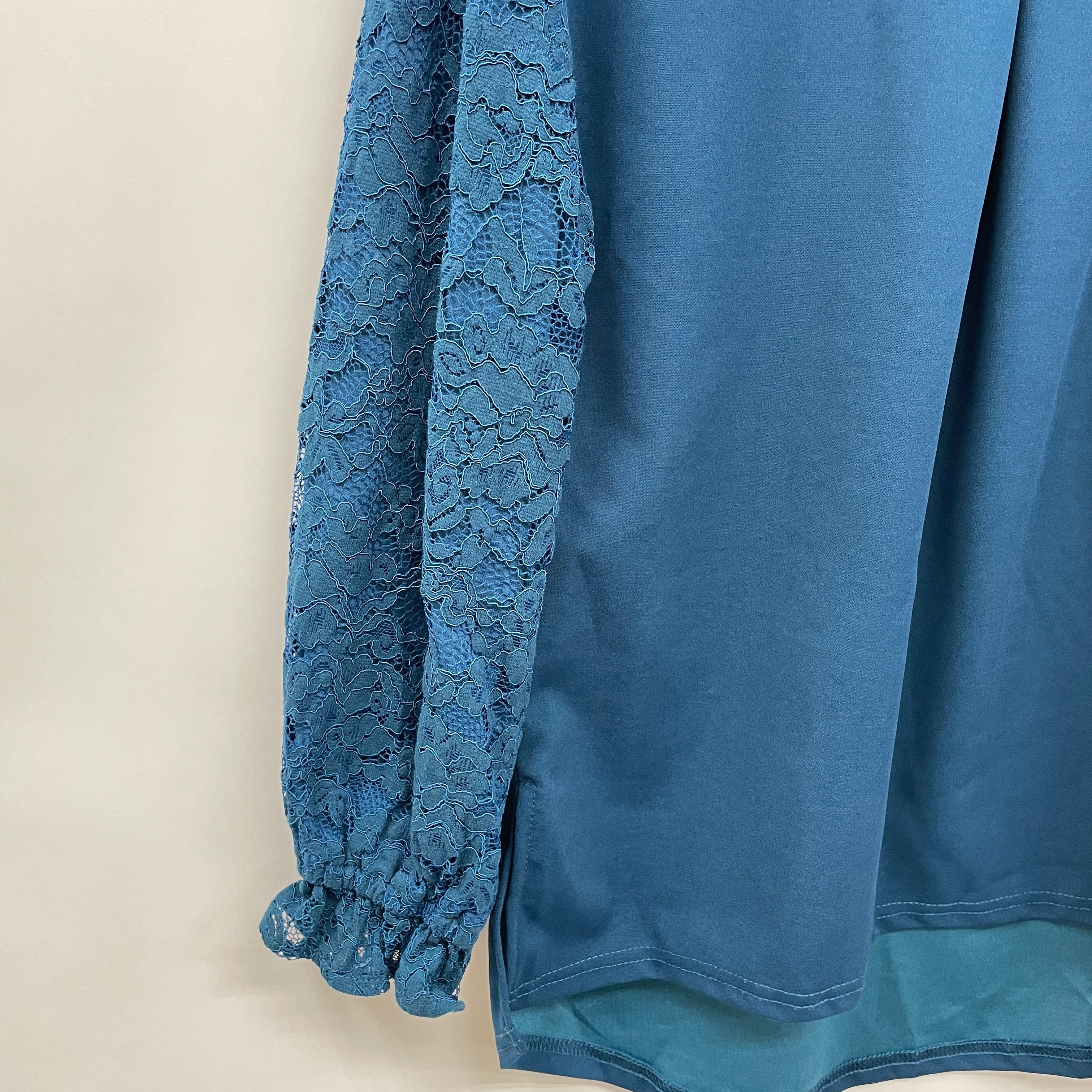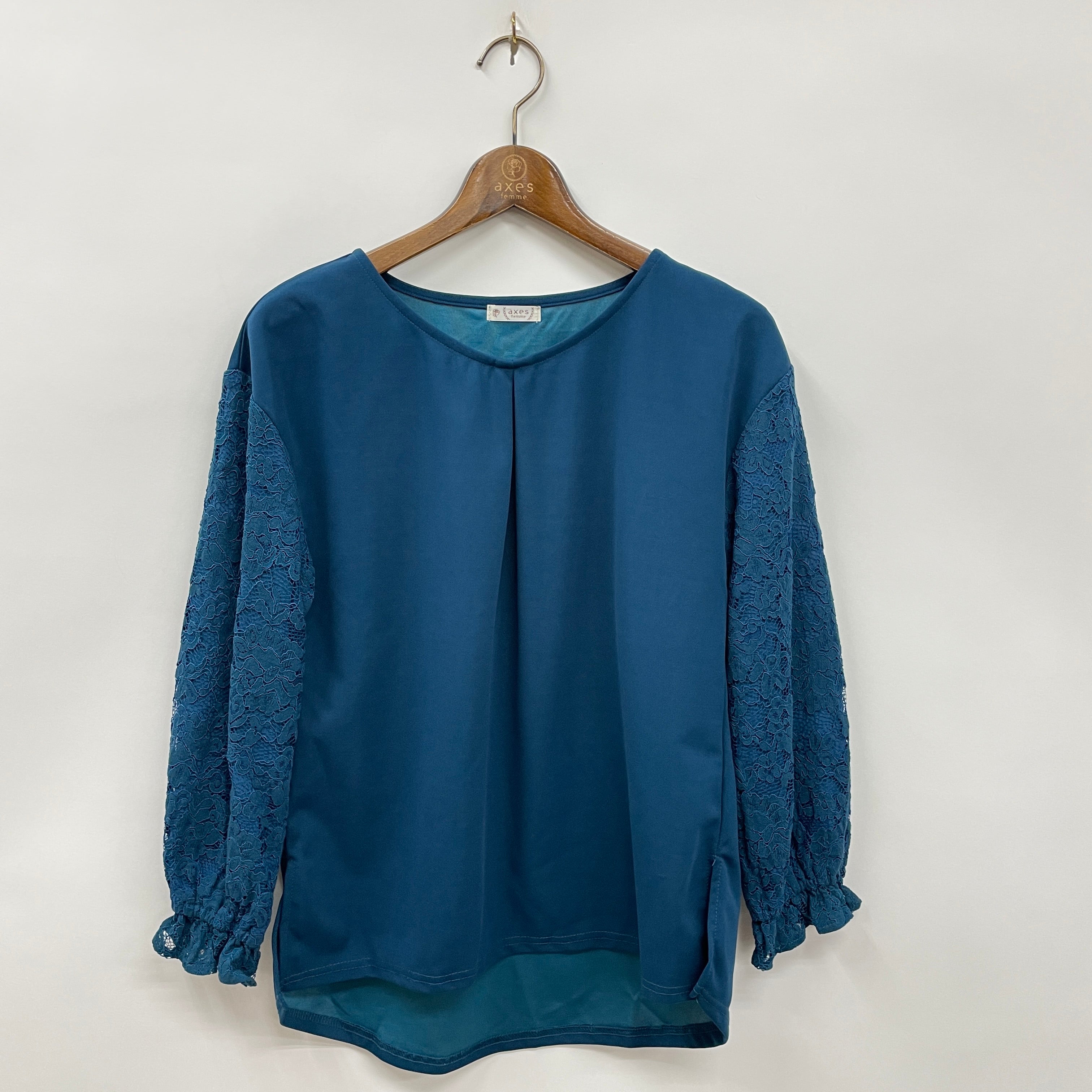 華やかな表面感のあるコード系のレース生地を袖に重ねたトップスです。
