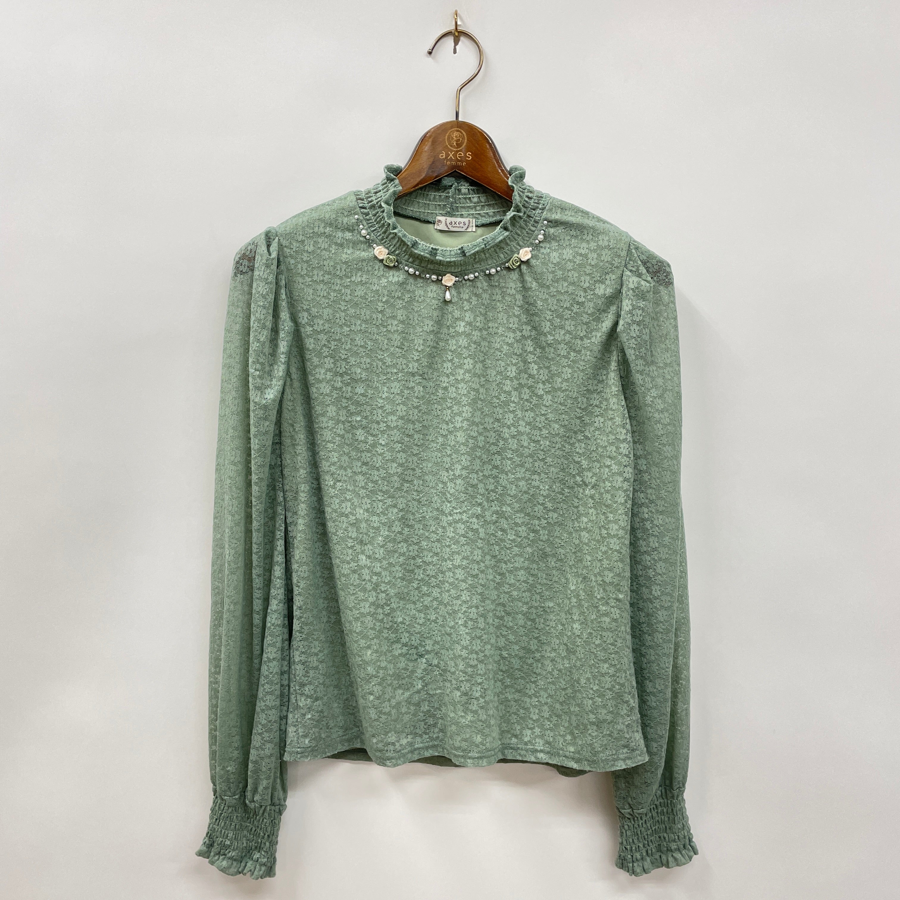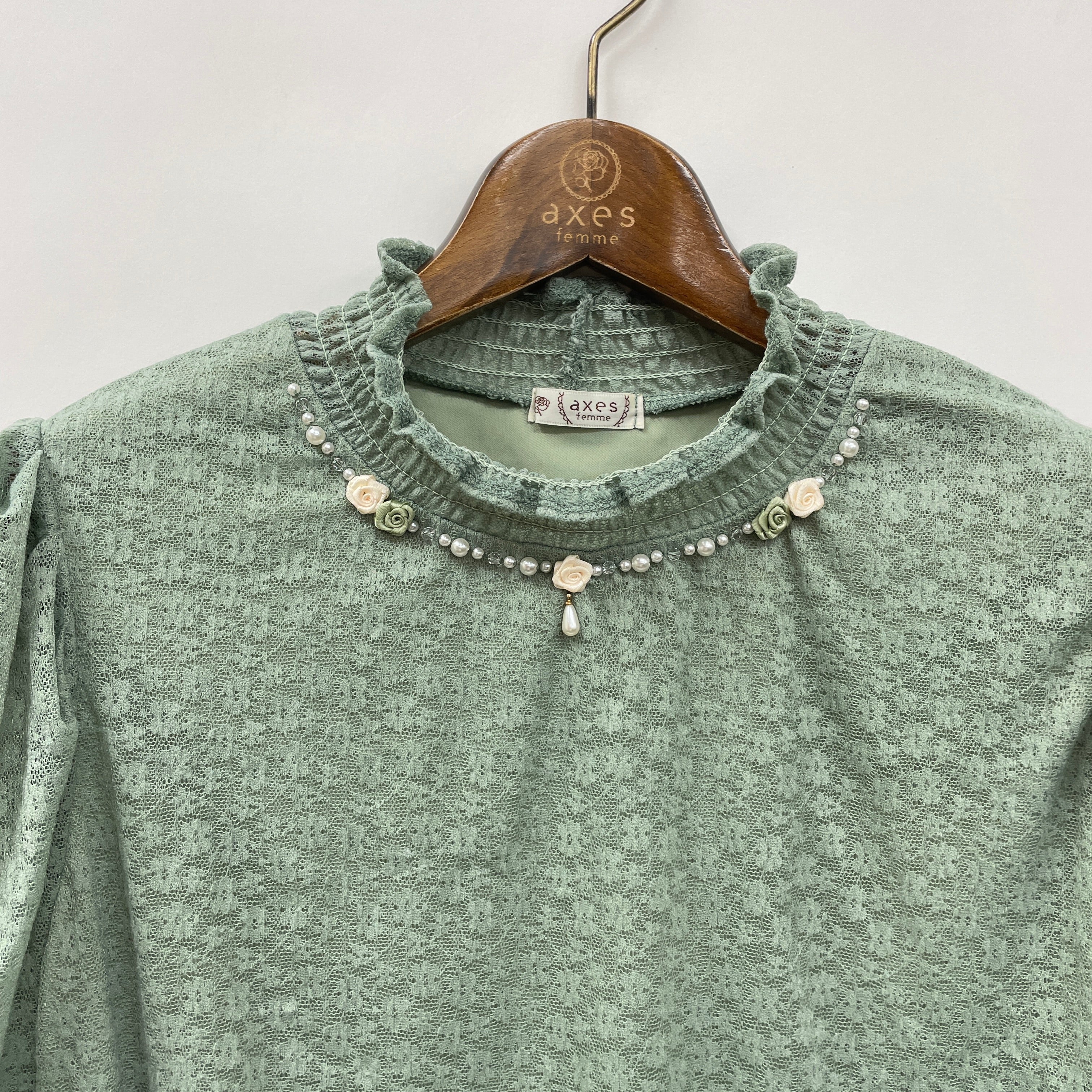 襟ぐりに施された巻きバラがポイントの総レーストップスです。