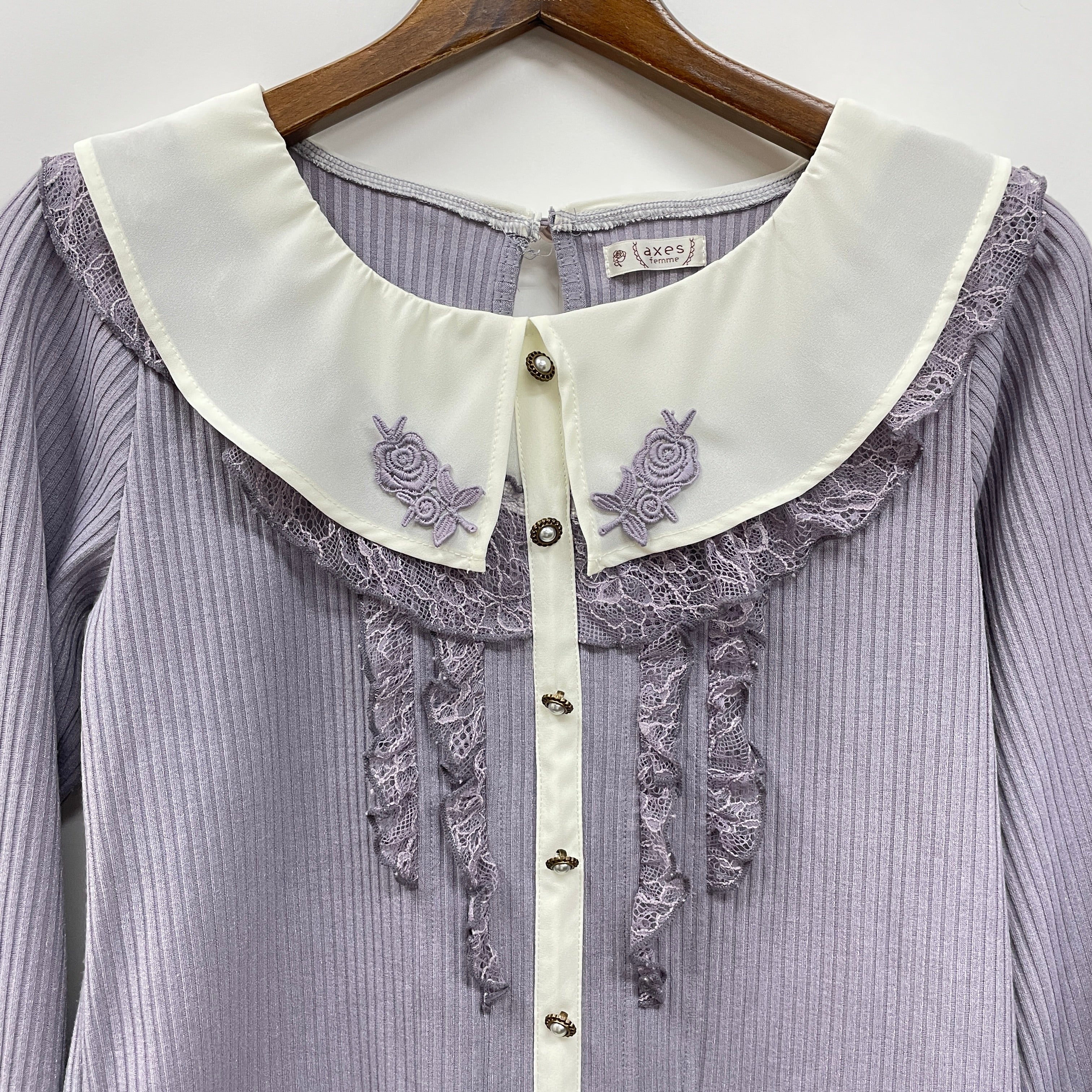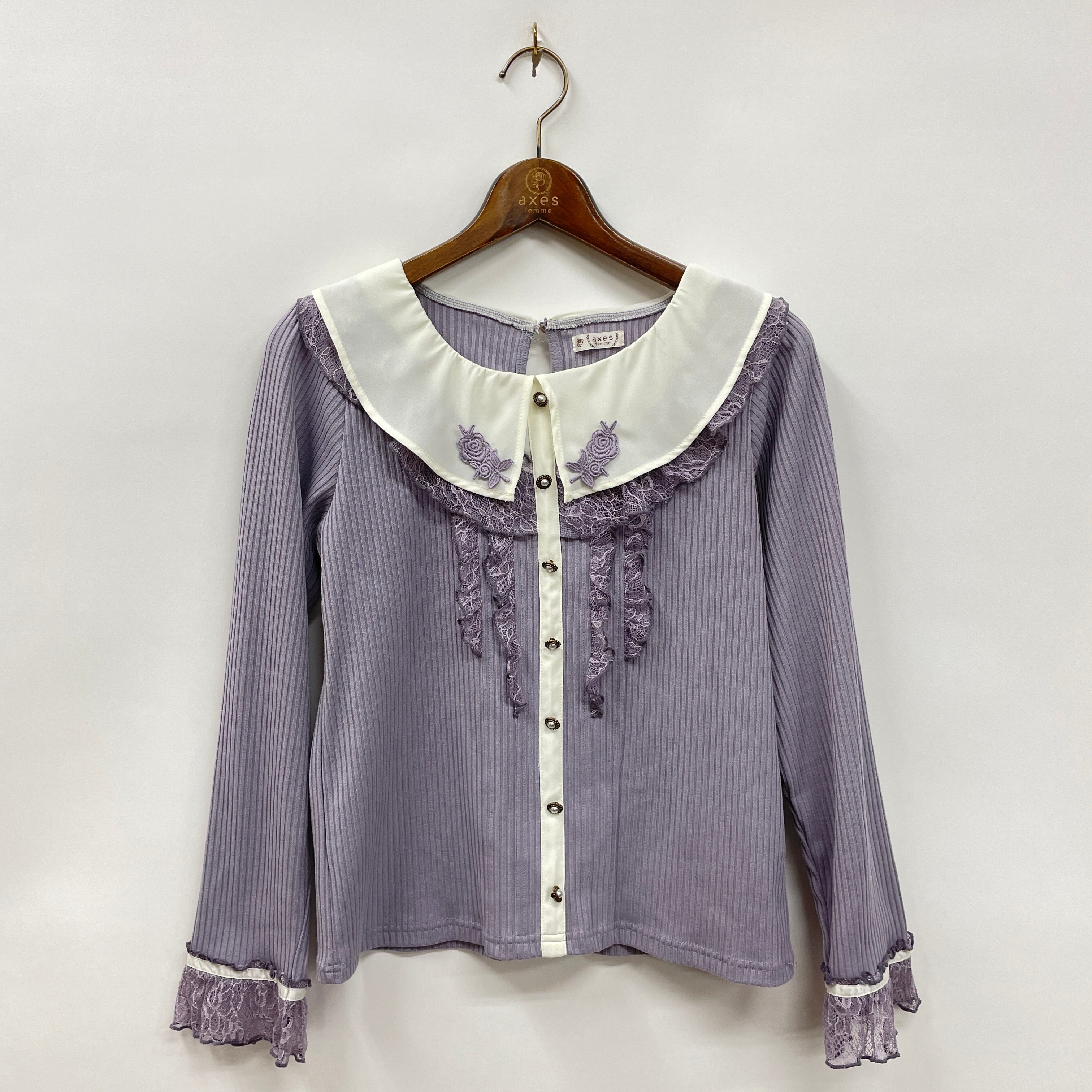 襟にモチーフレースを施しさりげないワンポイントに。